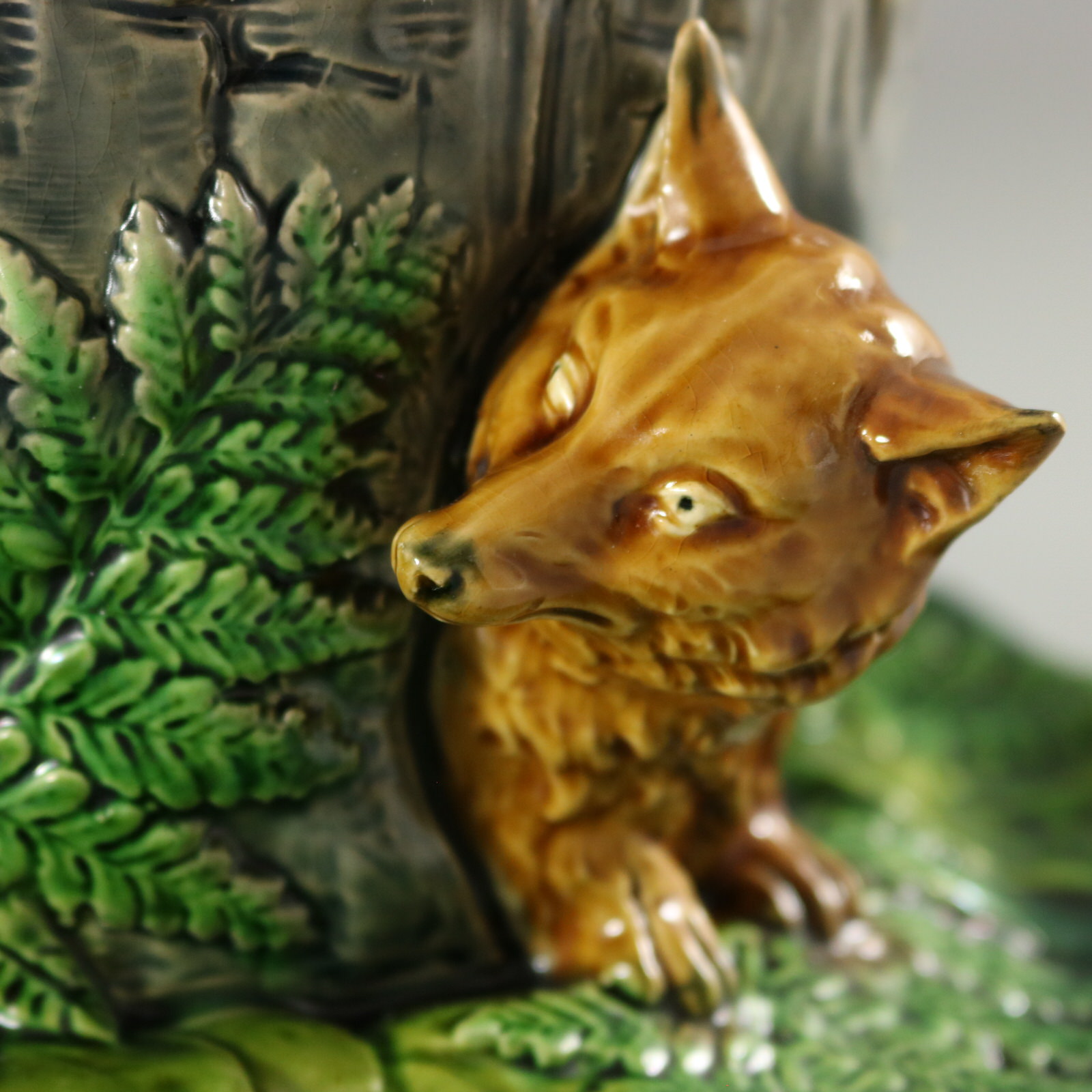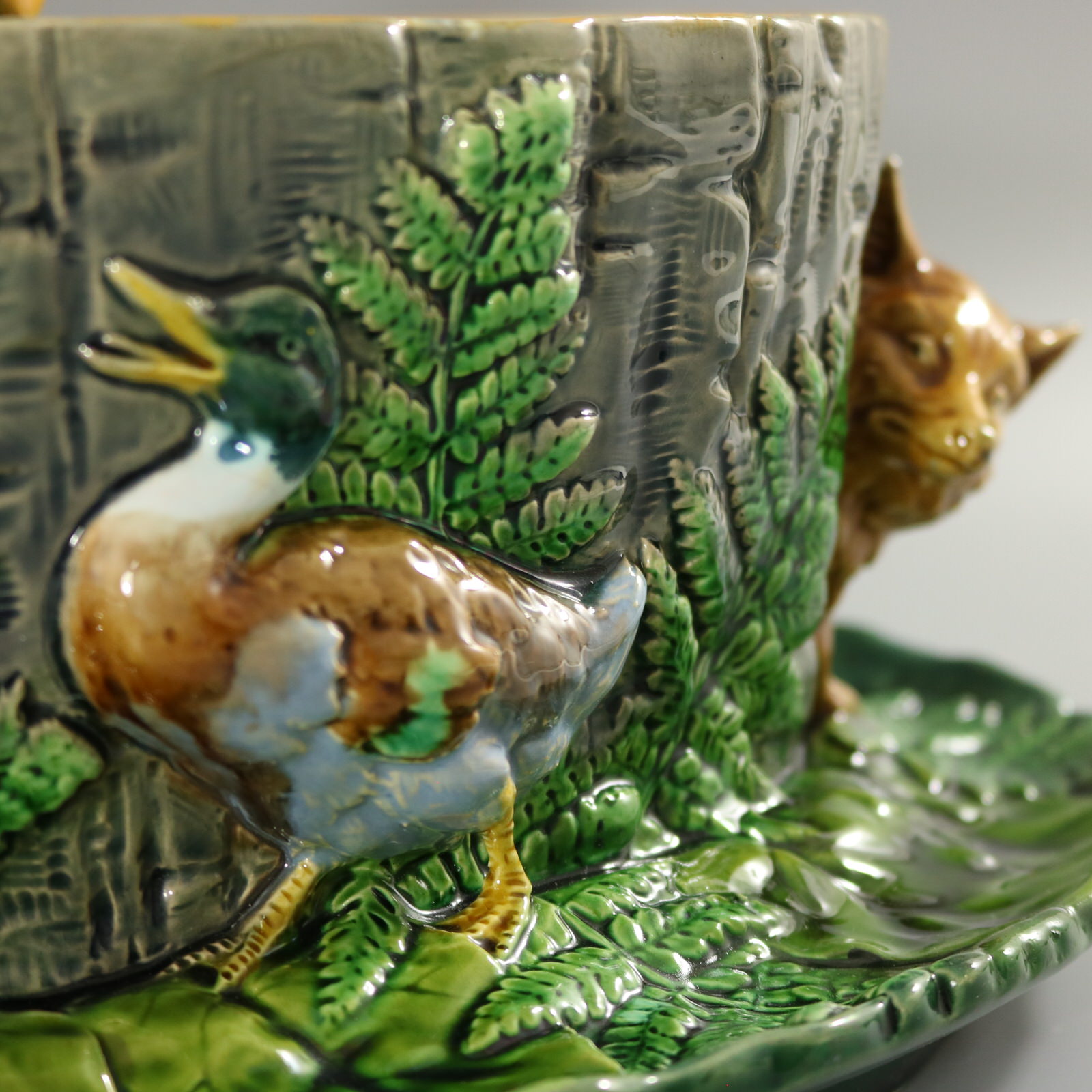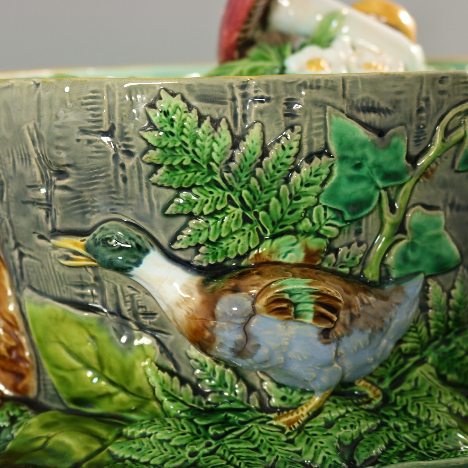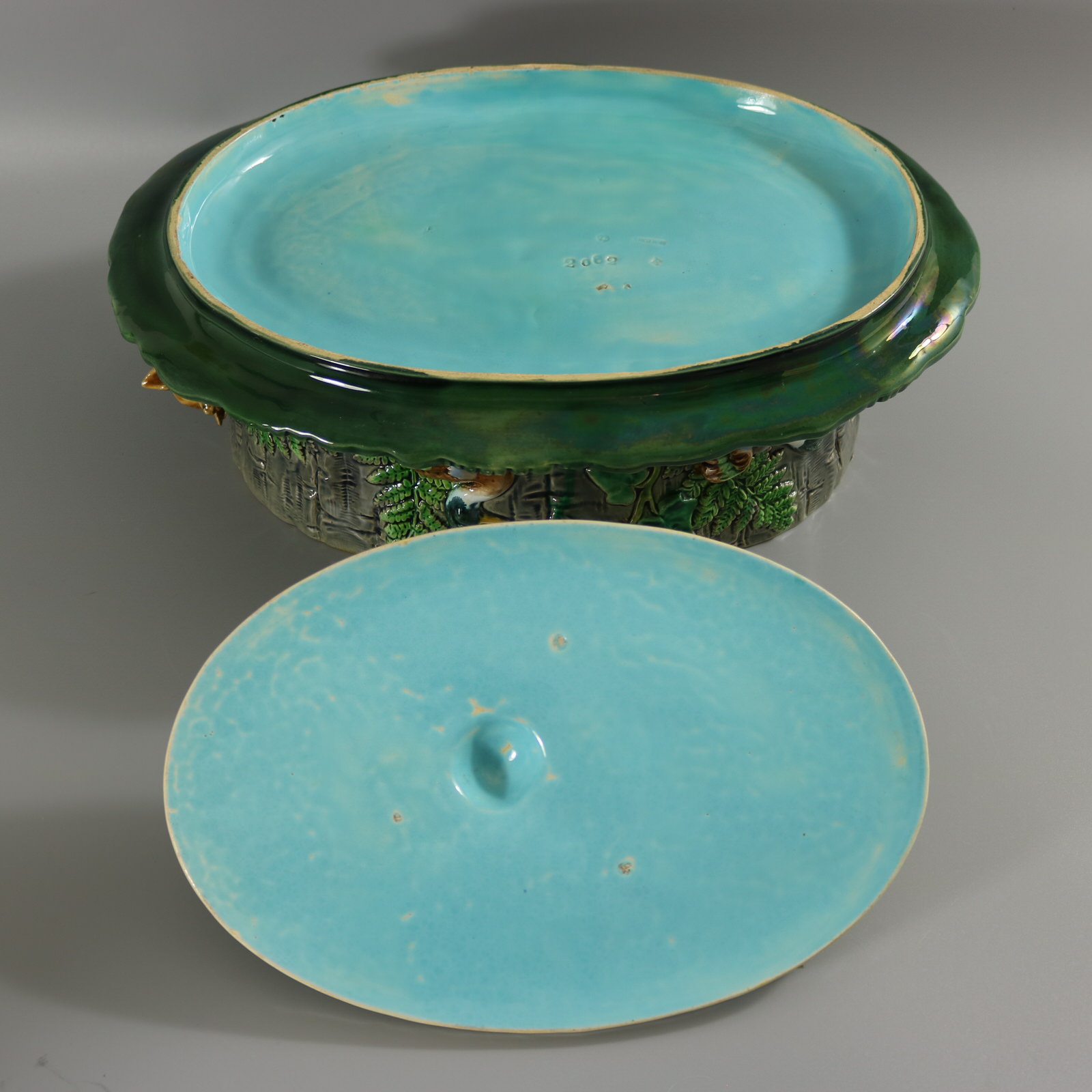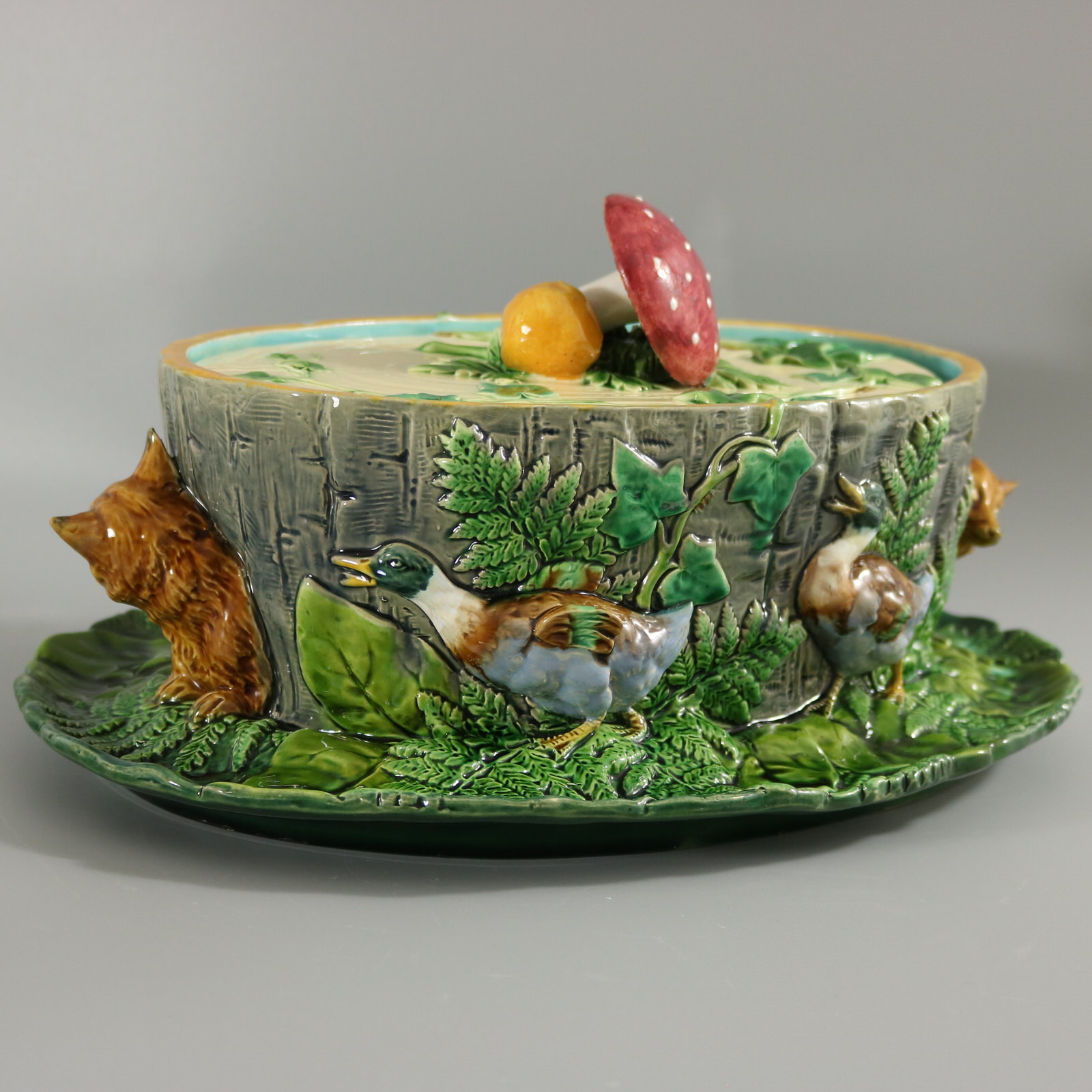 Victorian, circa 1877. 7.1ins high, 15.4ins wide, 11.4ins depth. Minton Majolica game pie dish which features foxes at either end, peering slyly out of a burrow, looking at mallard ducks.