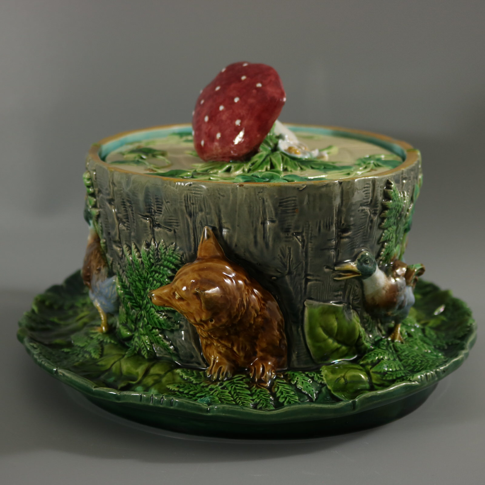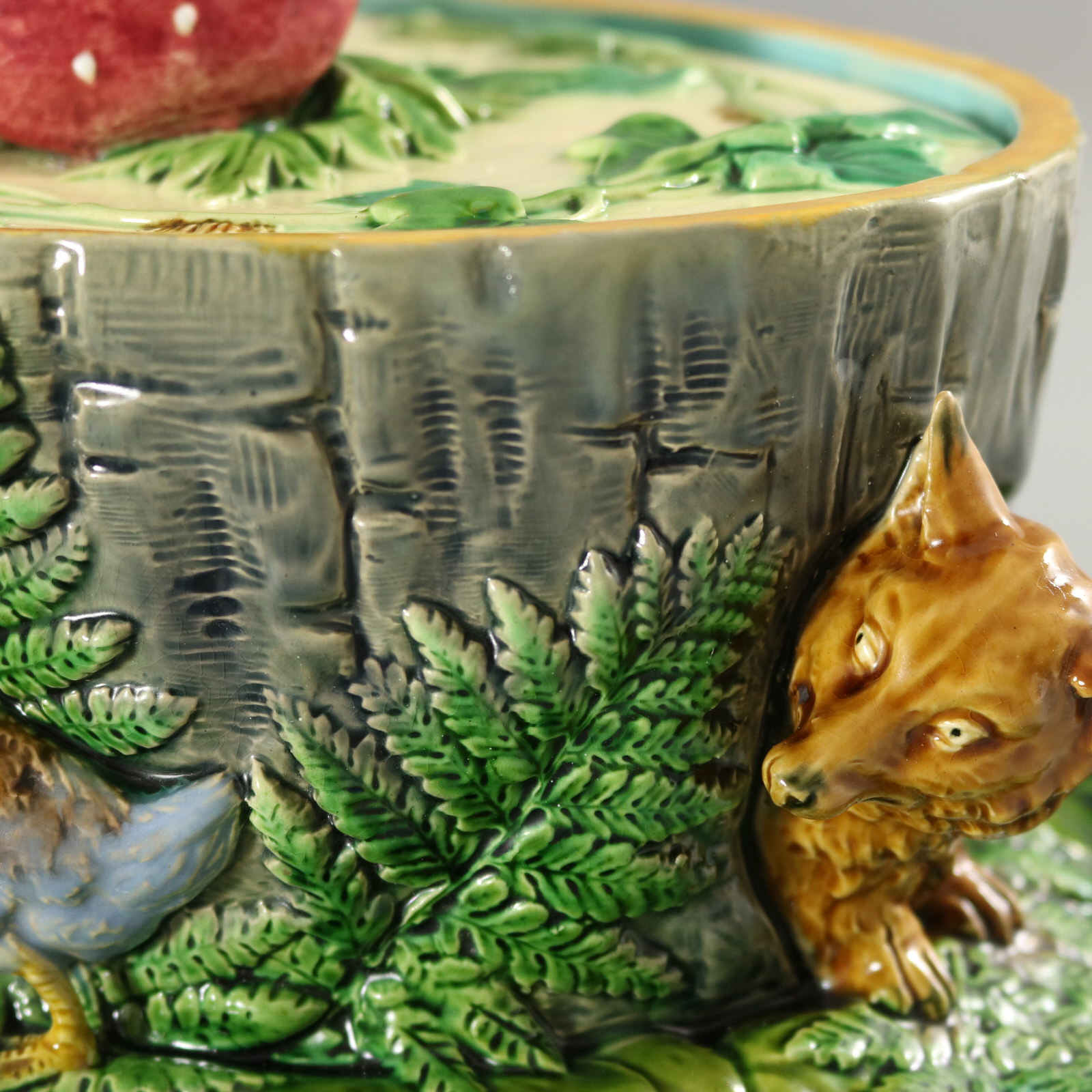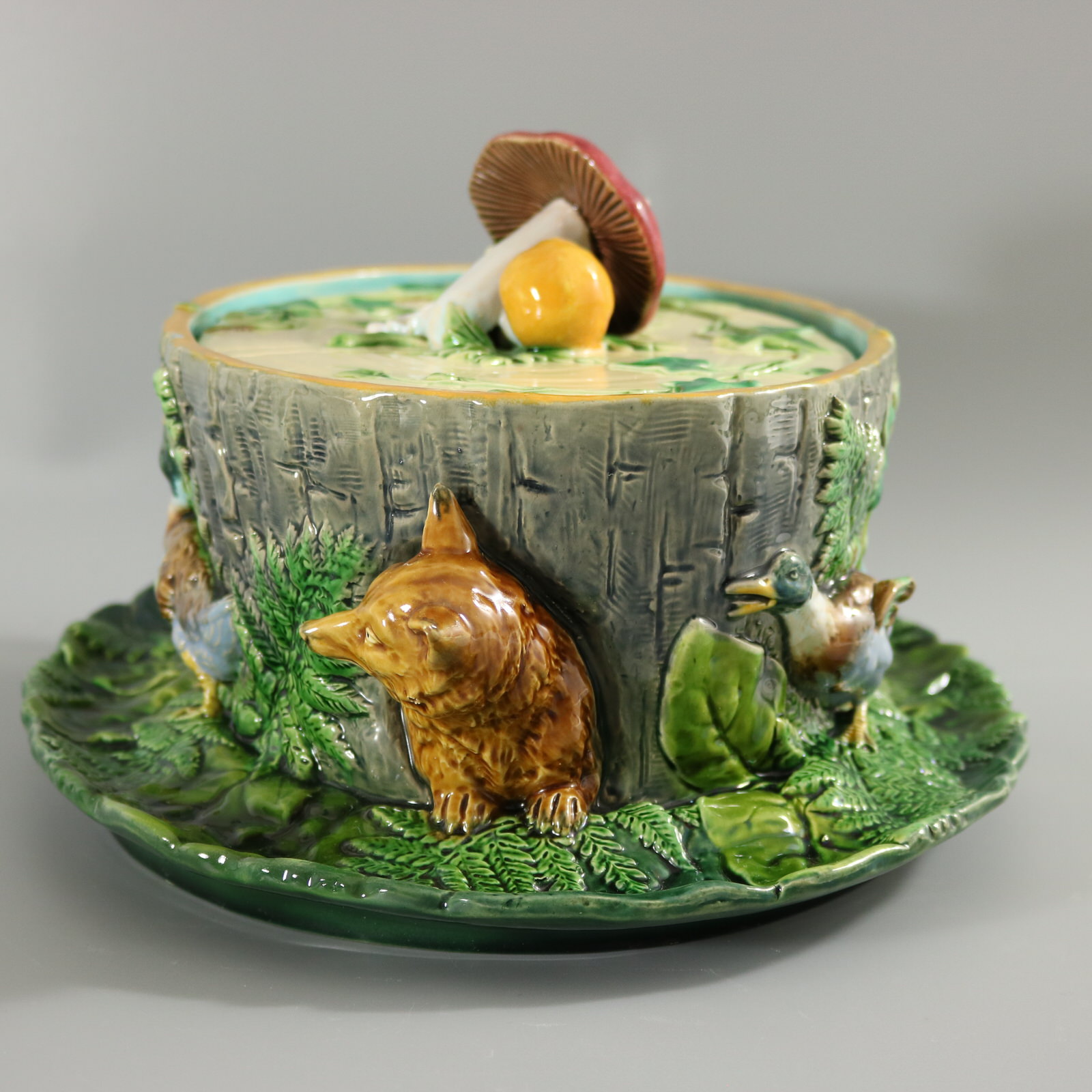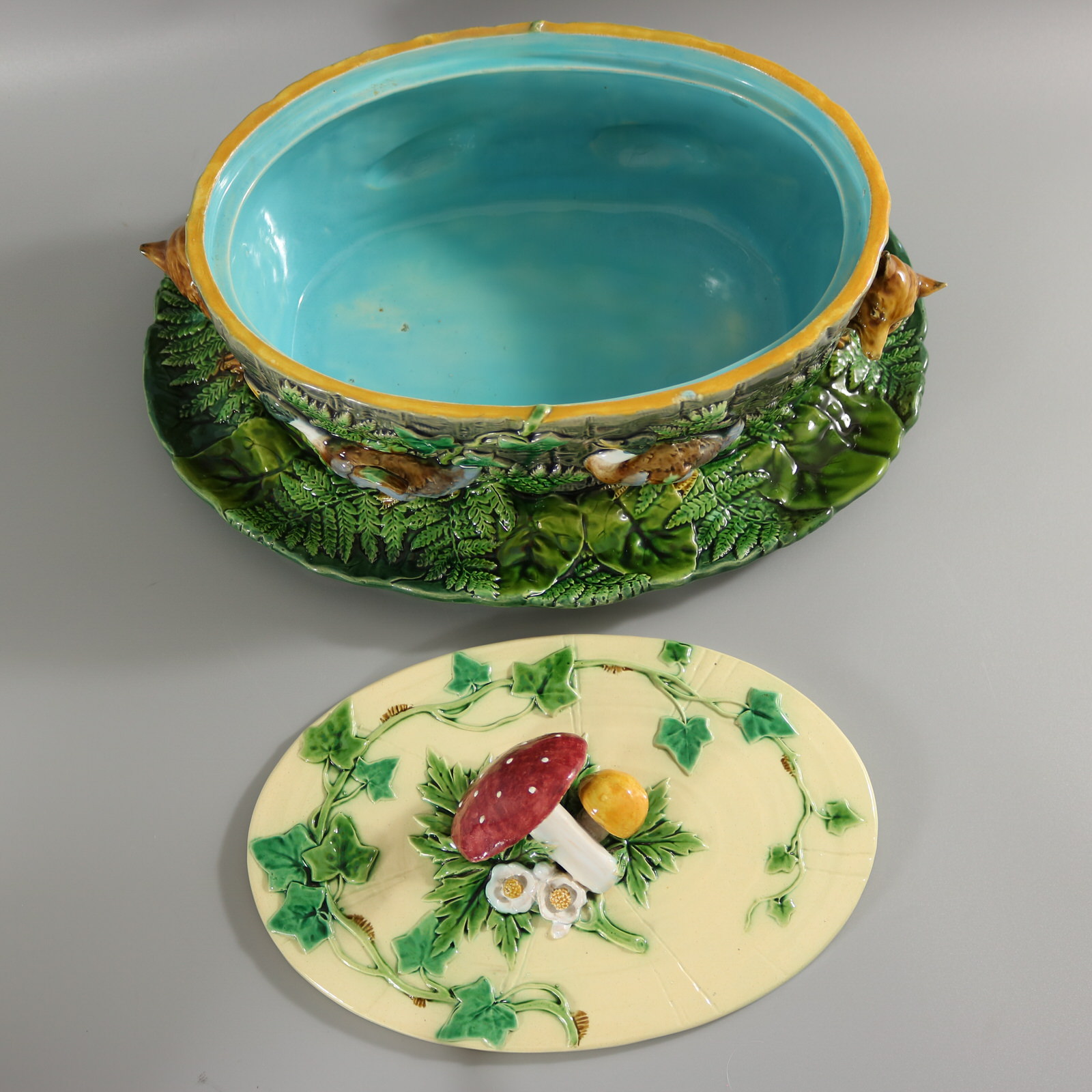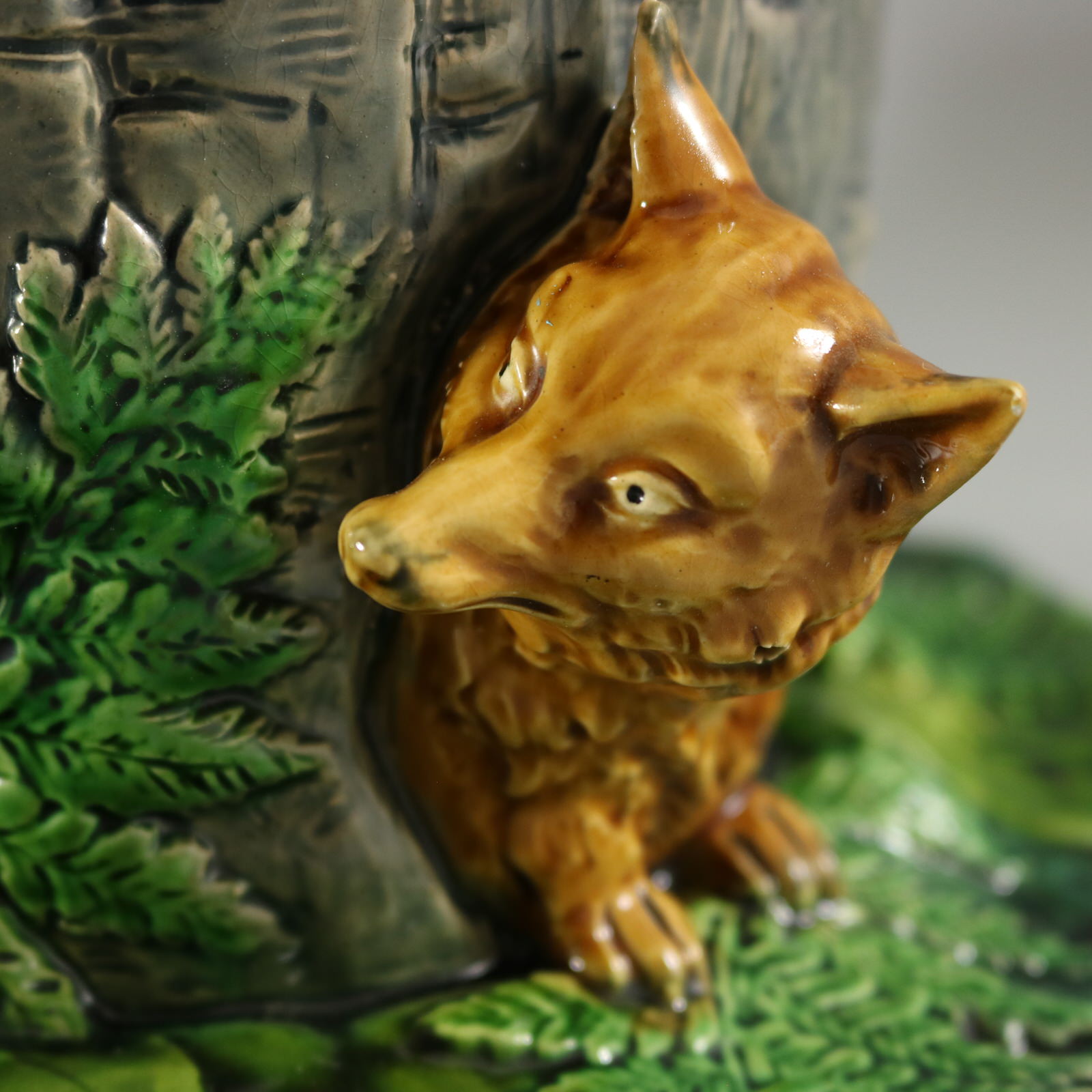 Victorian, circa 1877. 7.1ins high, 15.4ins wide, 11.4ins depth. Minton Majolica game pie dish which features foxes at either end, peering slyly out of a burrow, looking at mallard ducks.