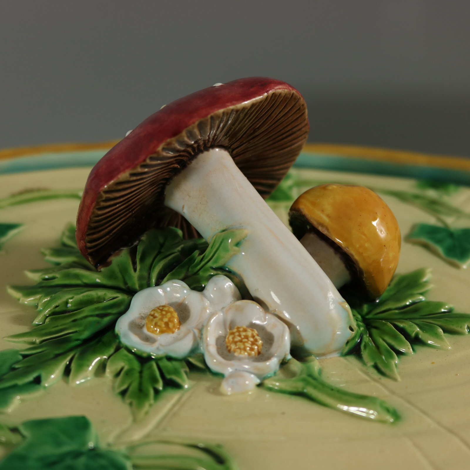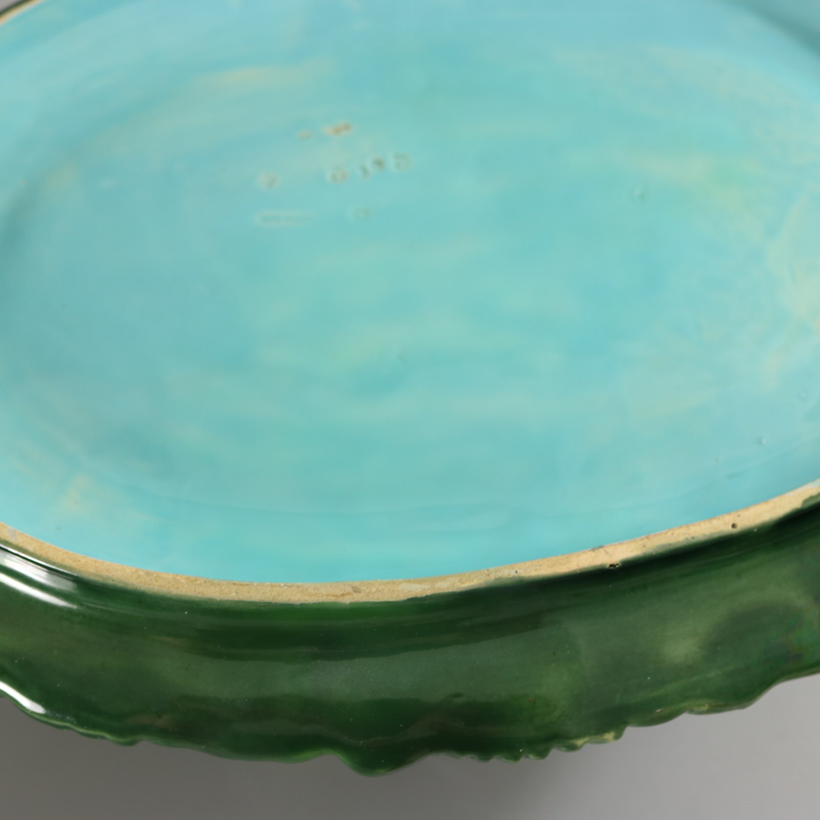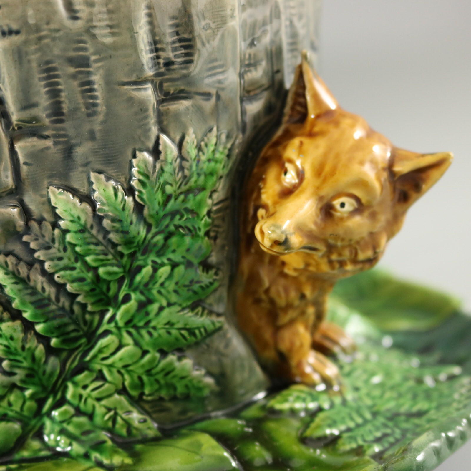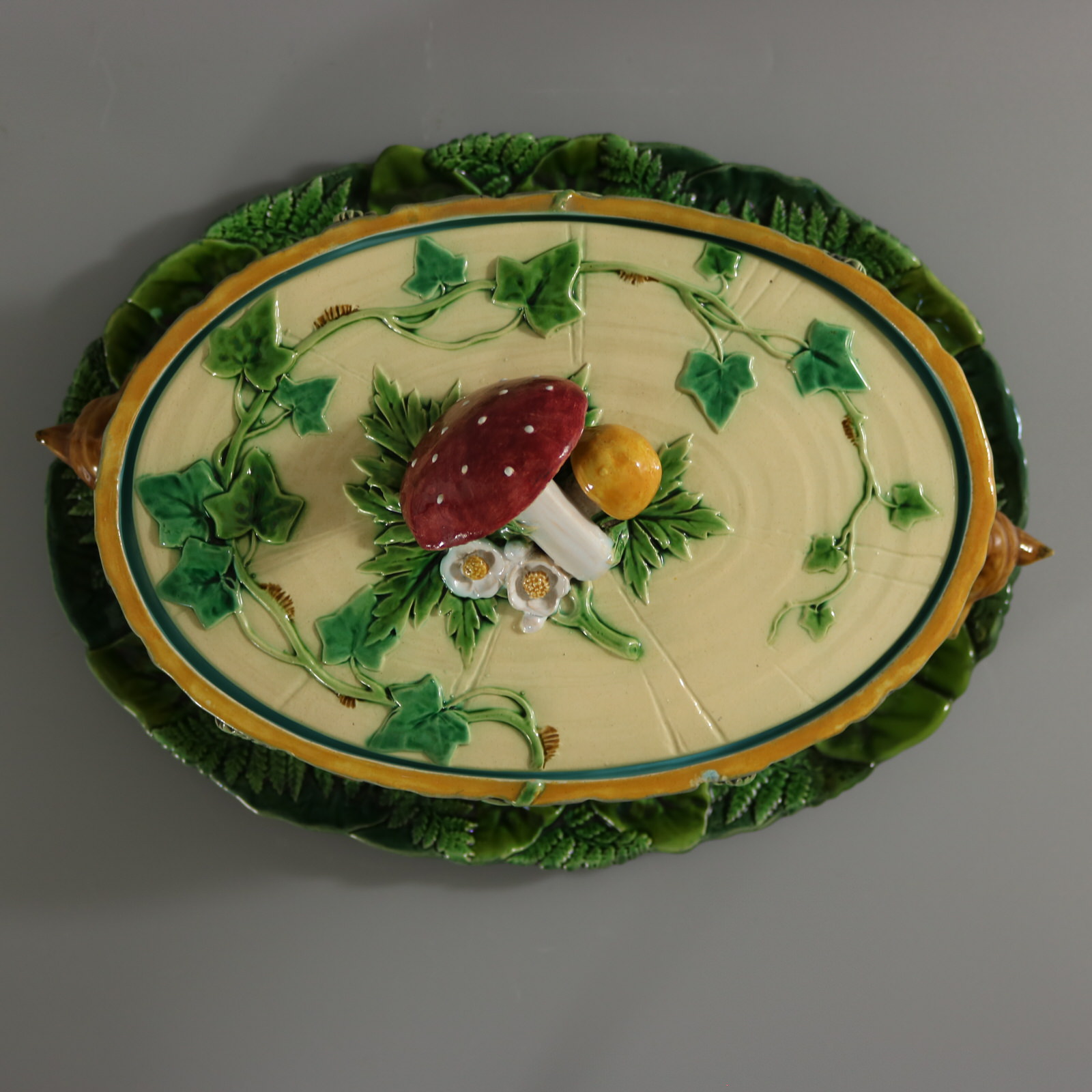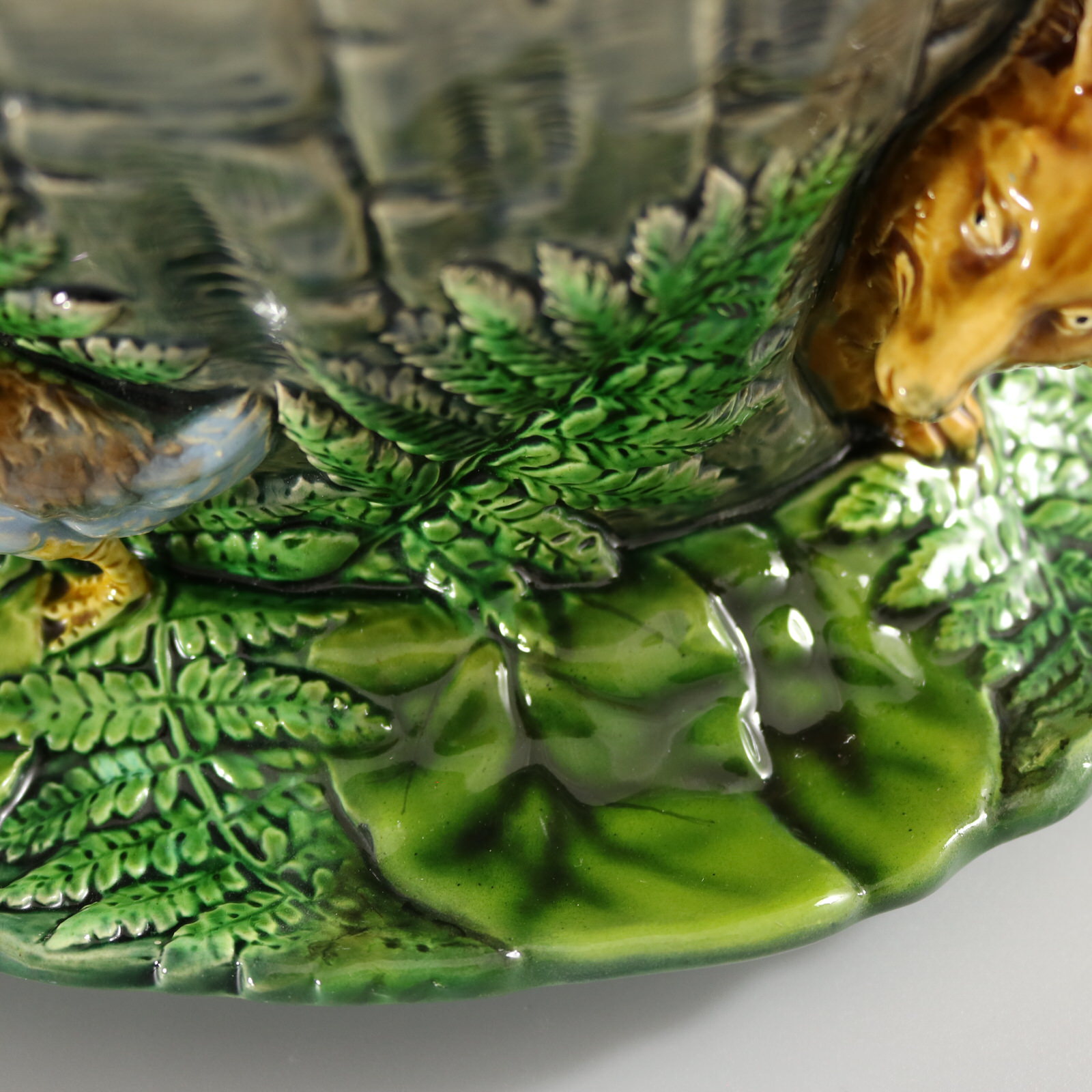 Victorian, circa 1877. 7.1ins high, 15.4ins wide, 11.4ins depth. Minton Majolica game pie dish which features foxes at either end, peering slyly out of a burrow, looking at mallard ducks.