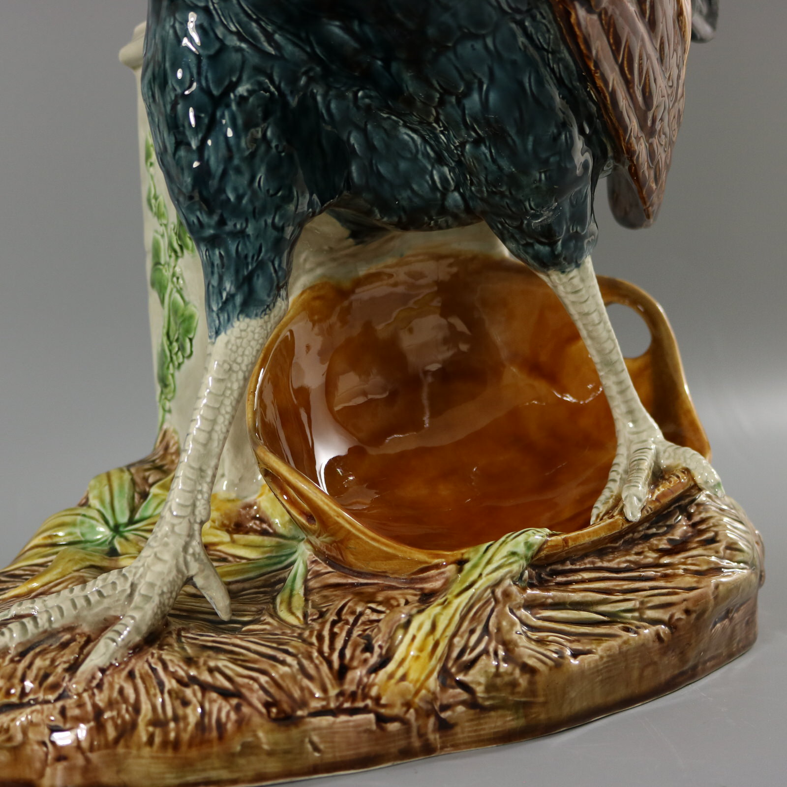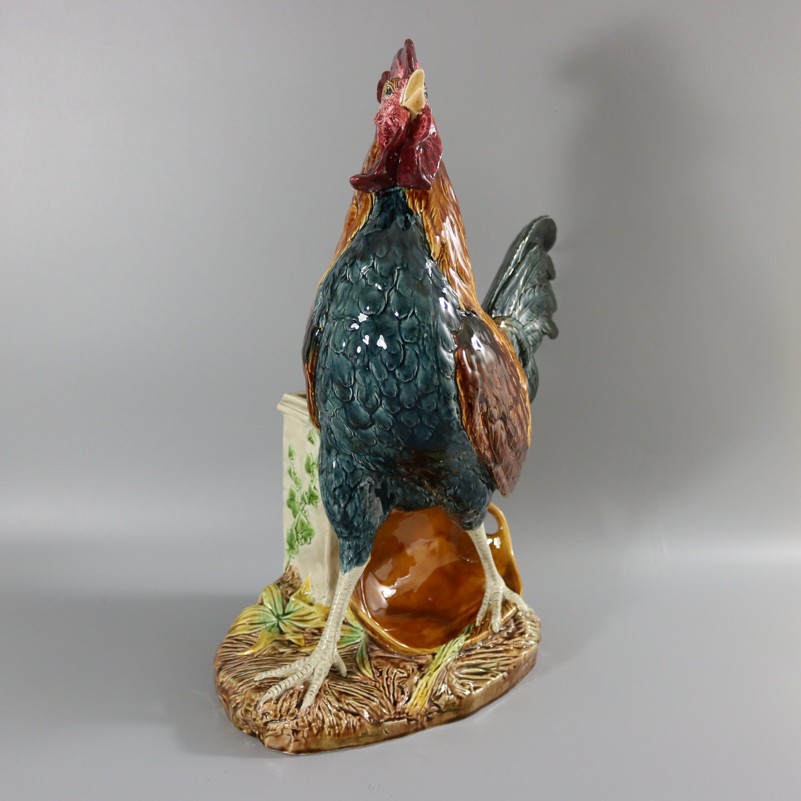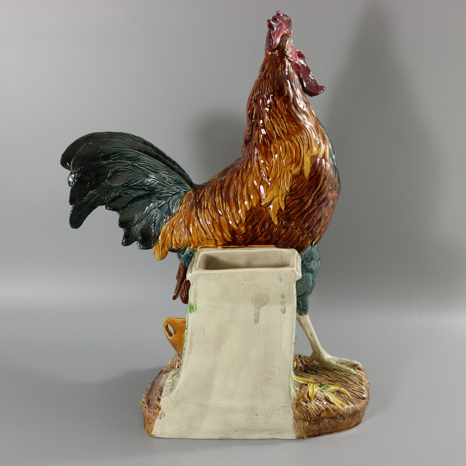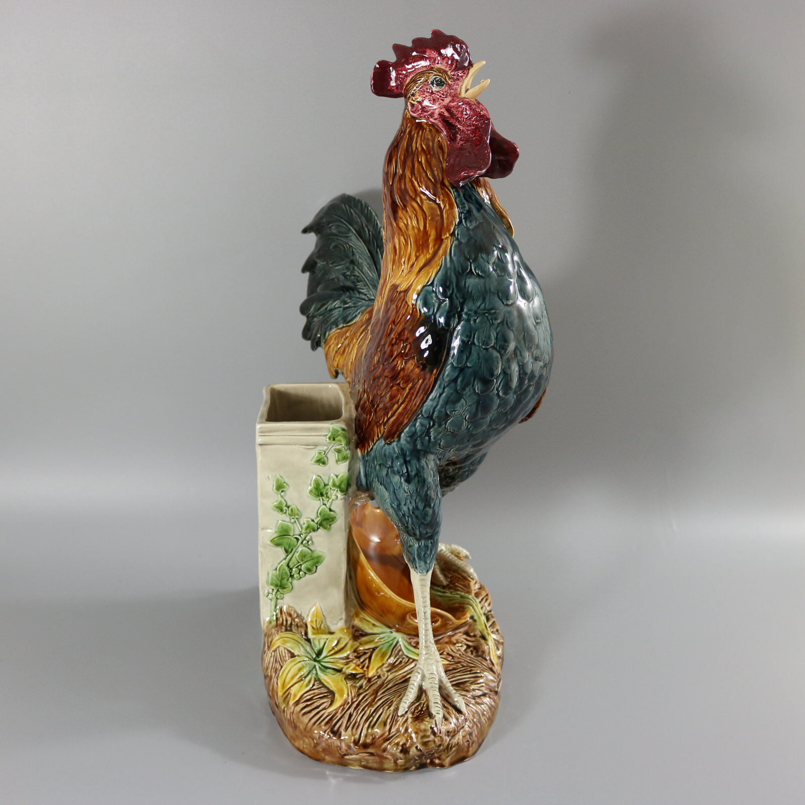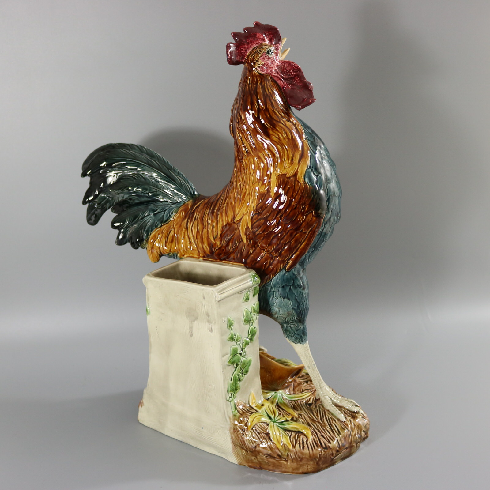 Circa 1880. 21.3ins high, 18.1ins wide, 9.1ins depth. Choisy Majolica figural vase which features an animated cockerel / rooster stood on a basket, in front of a stone wall. Ivy grows up the wall.