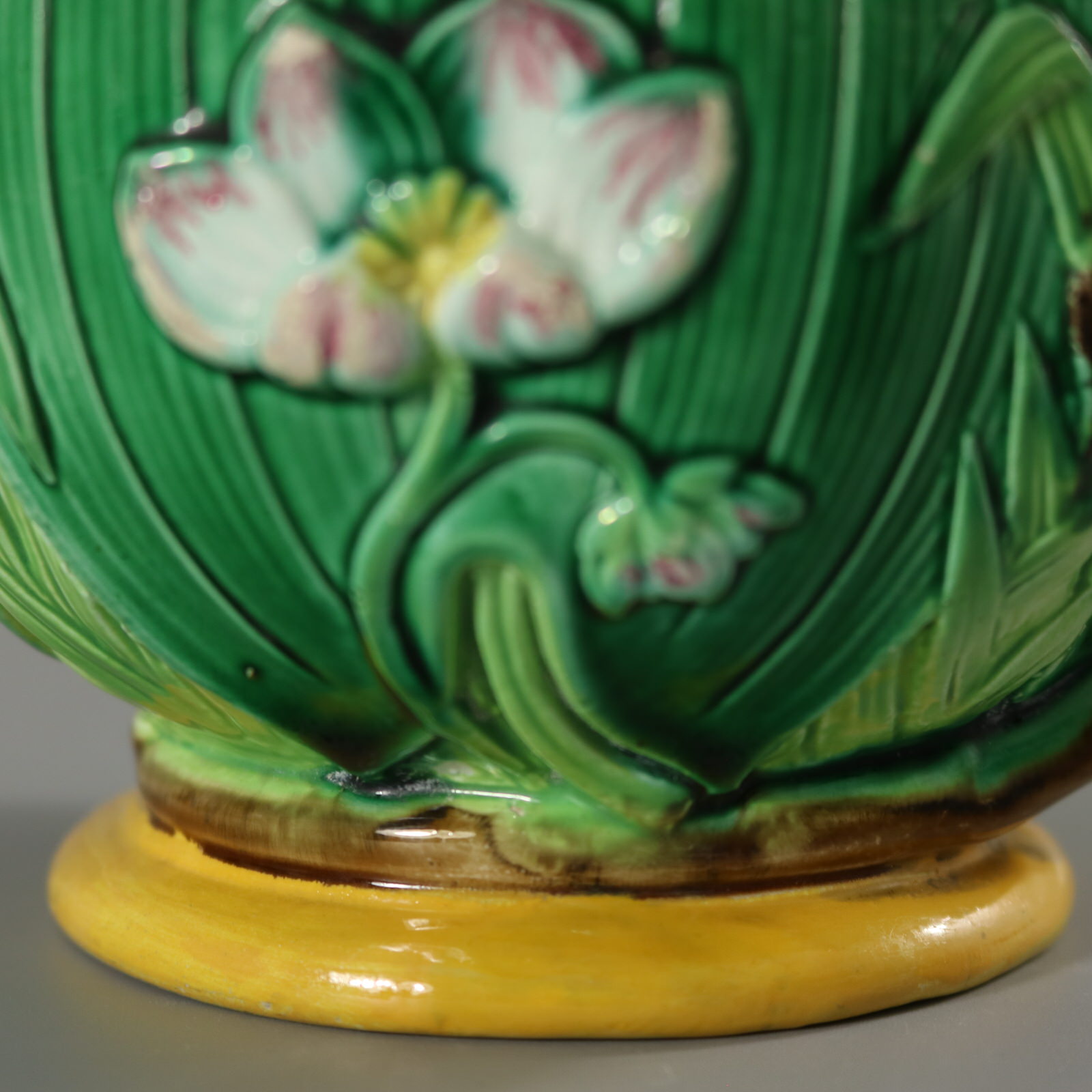 Victorian, circa 1872. 7.7ins high, 5.9ins wide, 4.7ins depth. George Jones Majolica jug/pitcher which features green leaves, bulrushes/cattails and water lilies.