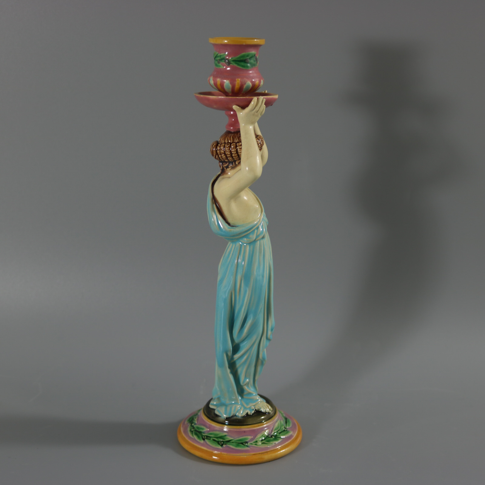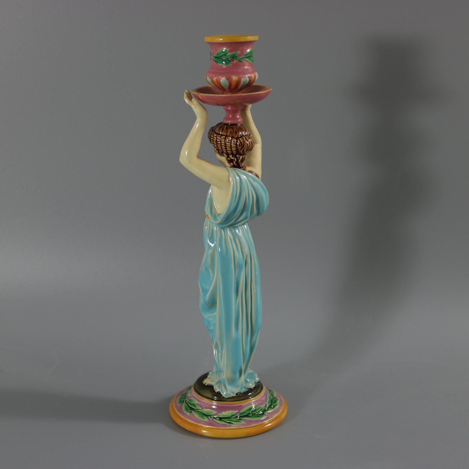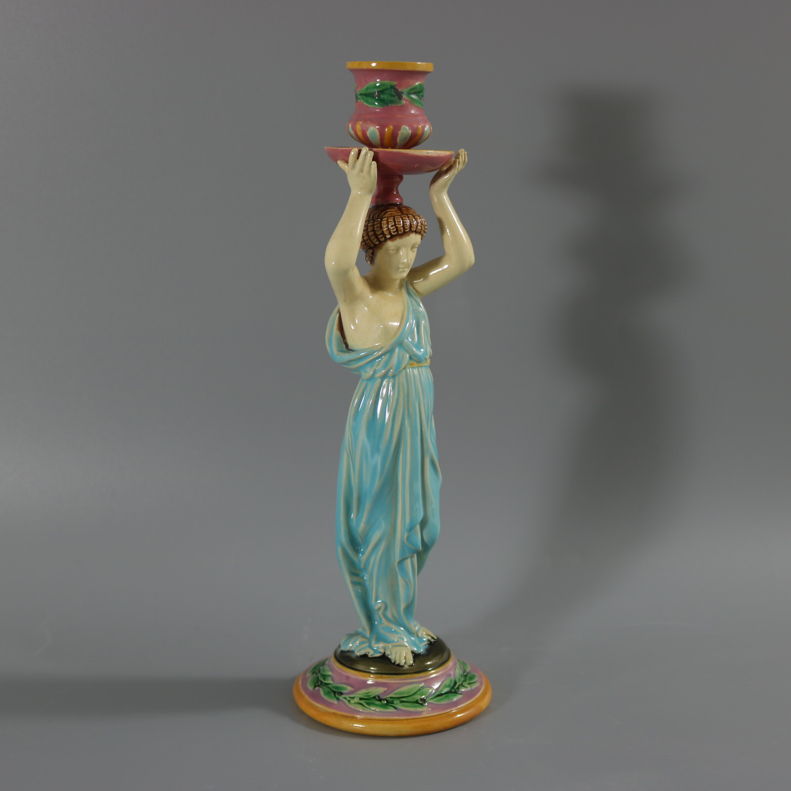 Victorian, circa 1872. 11.2ins high, 3.6ins wide, 3.6ins depth. George Jones Majolica candlestick which features a lady dressed in a classical, flowing robe, holding the candle sconce above her head.