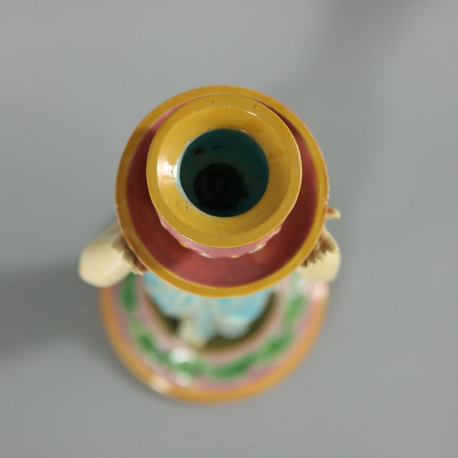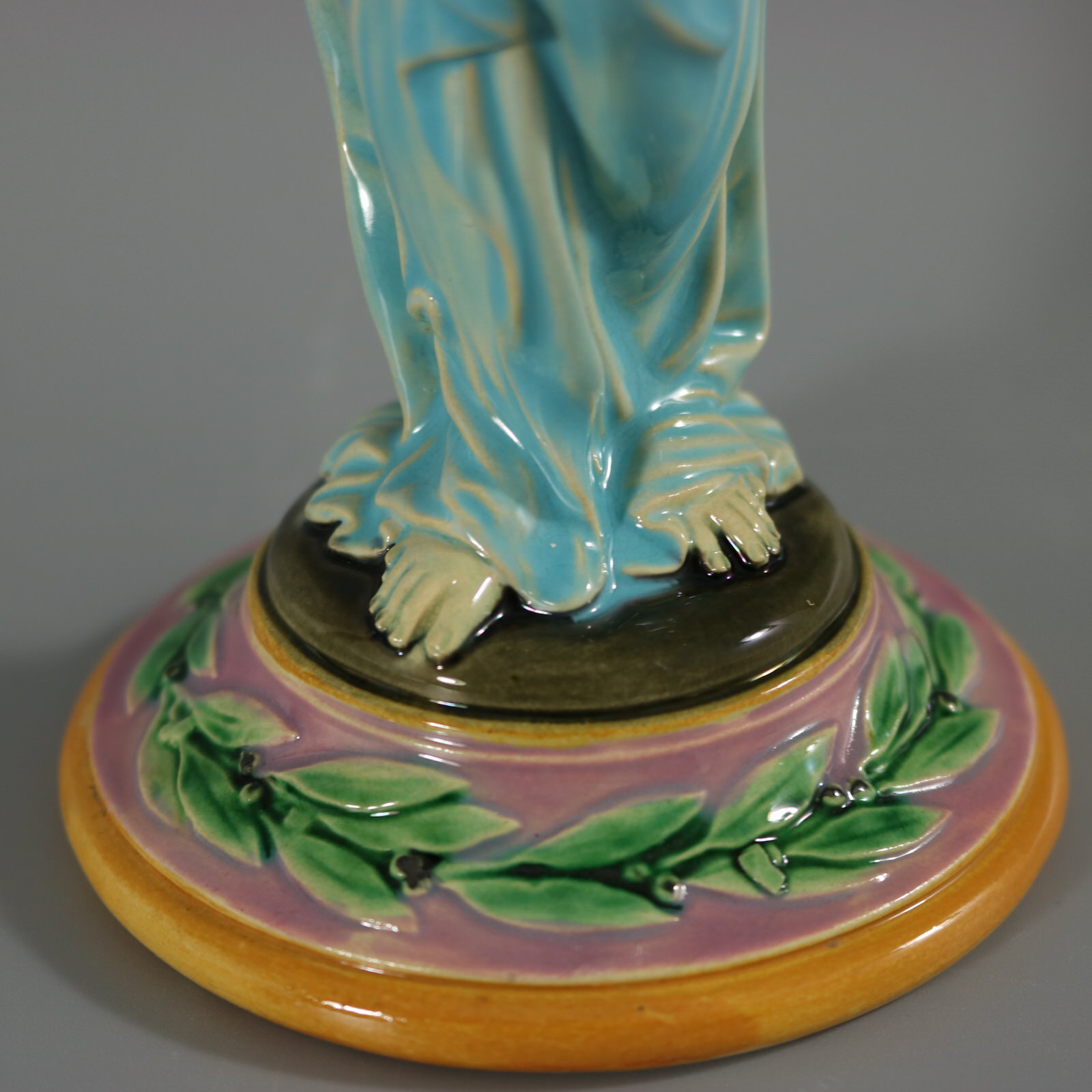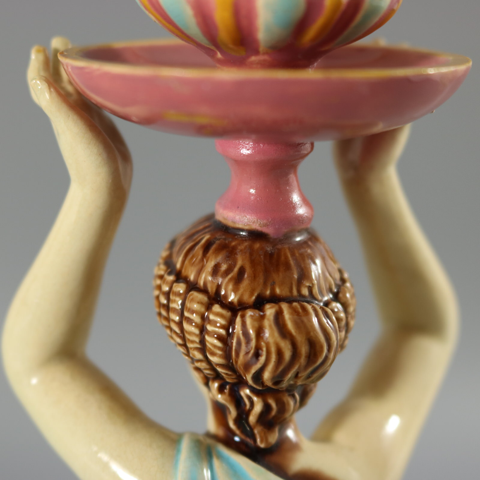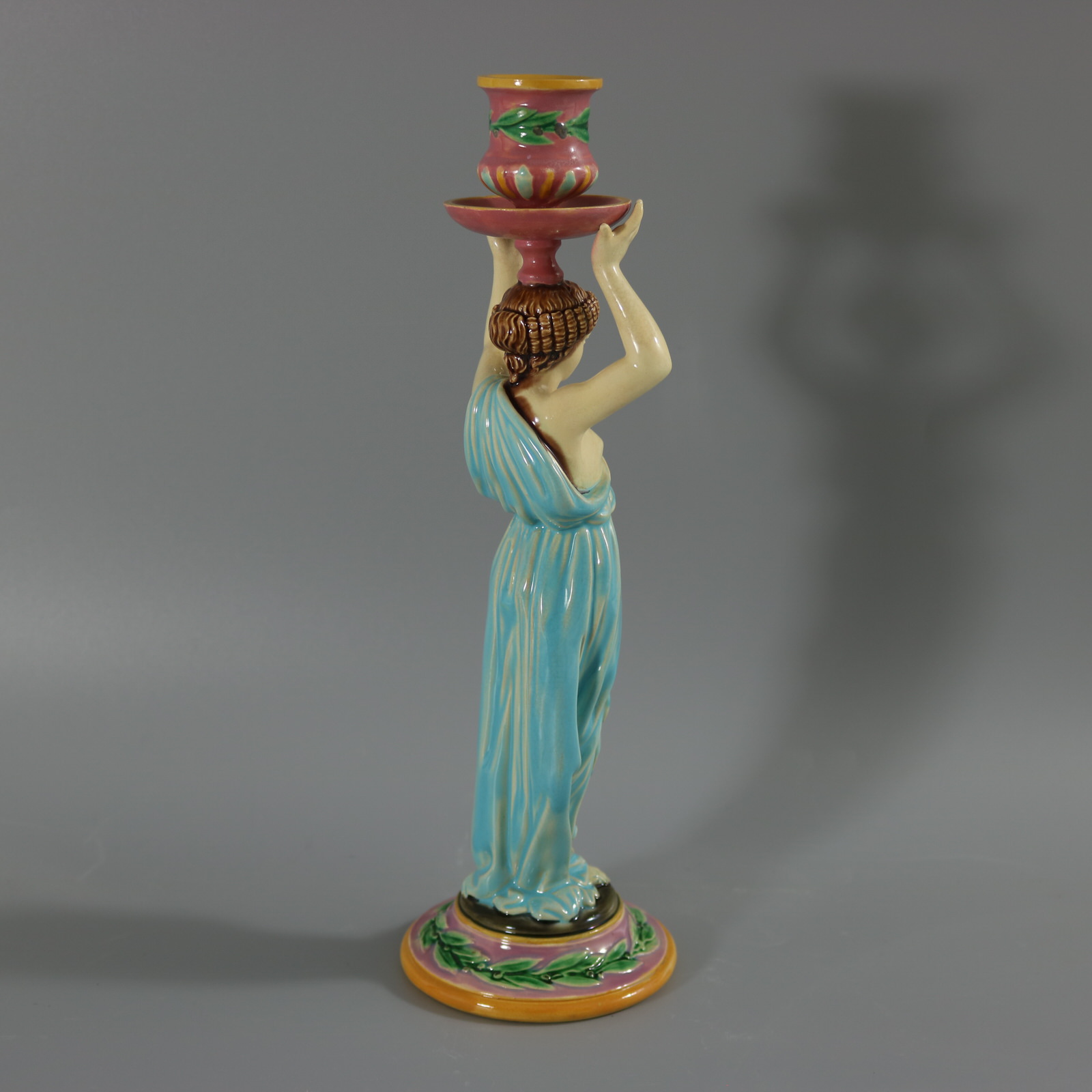 Victorian, circa 1872. 11.2ins high, 3.6ins wide, 3.6ins depth. George Jones Majolica candlestick which features a lady dressed in a classical, flowing robe, holding the candle sconce above her head.