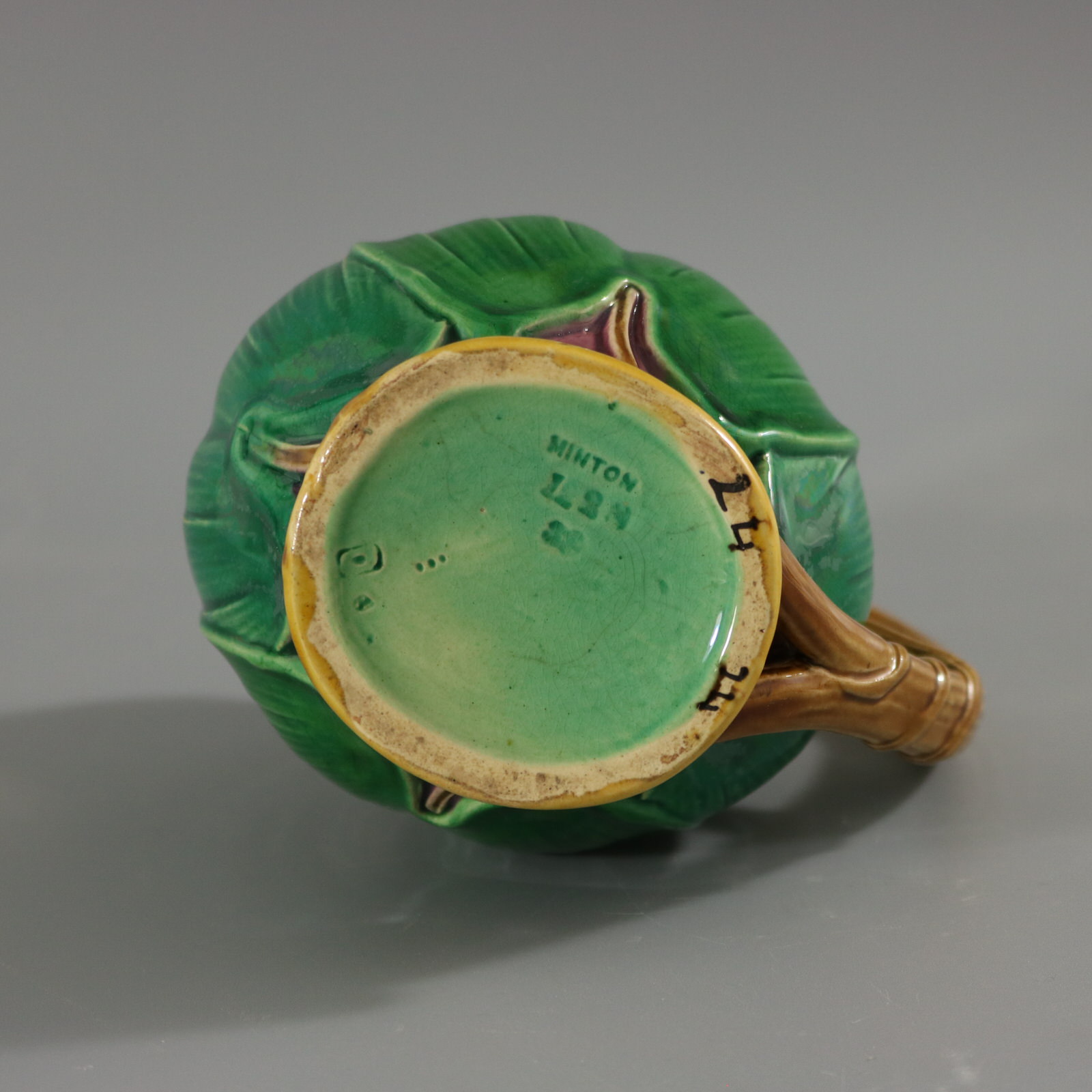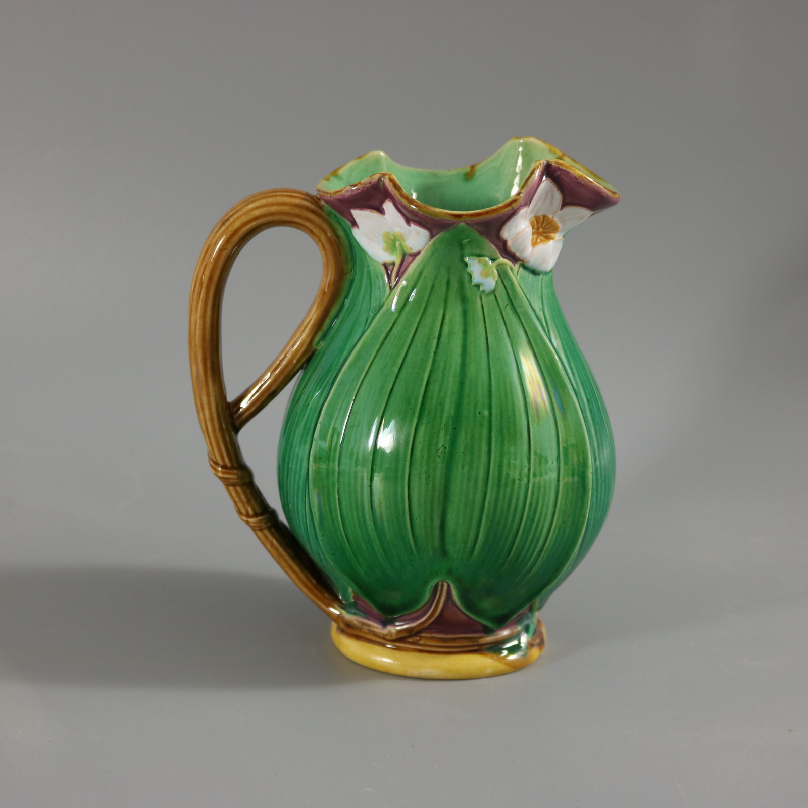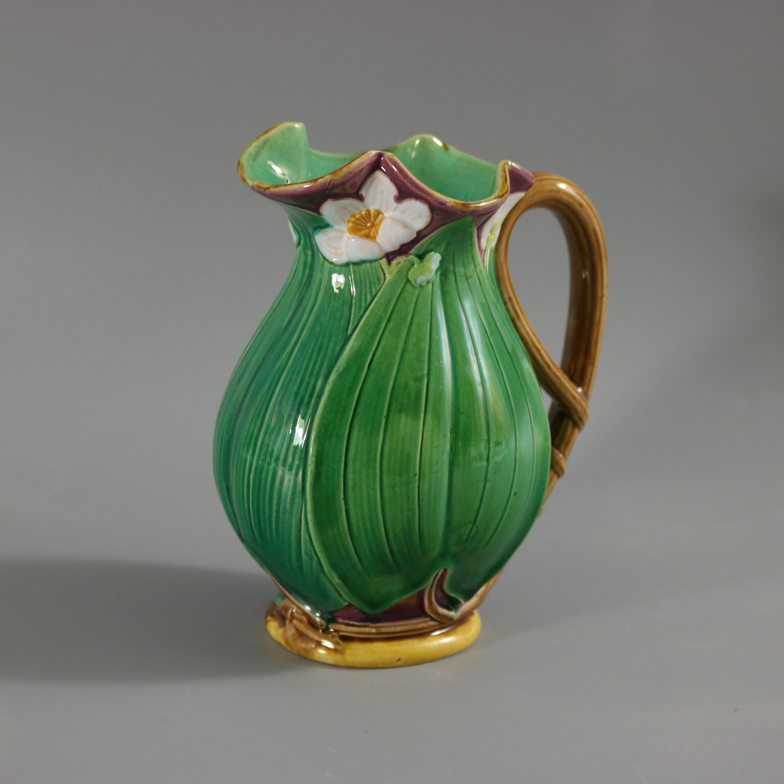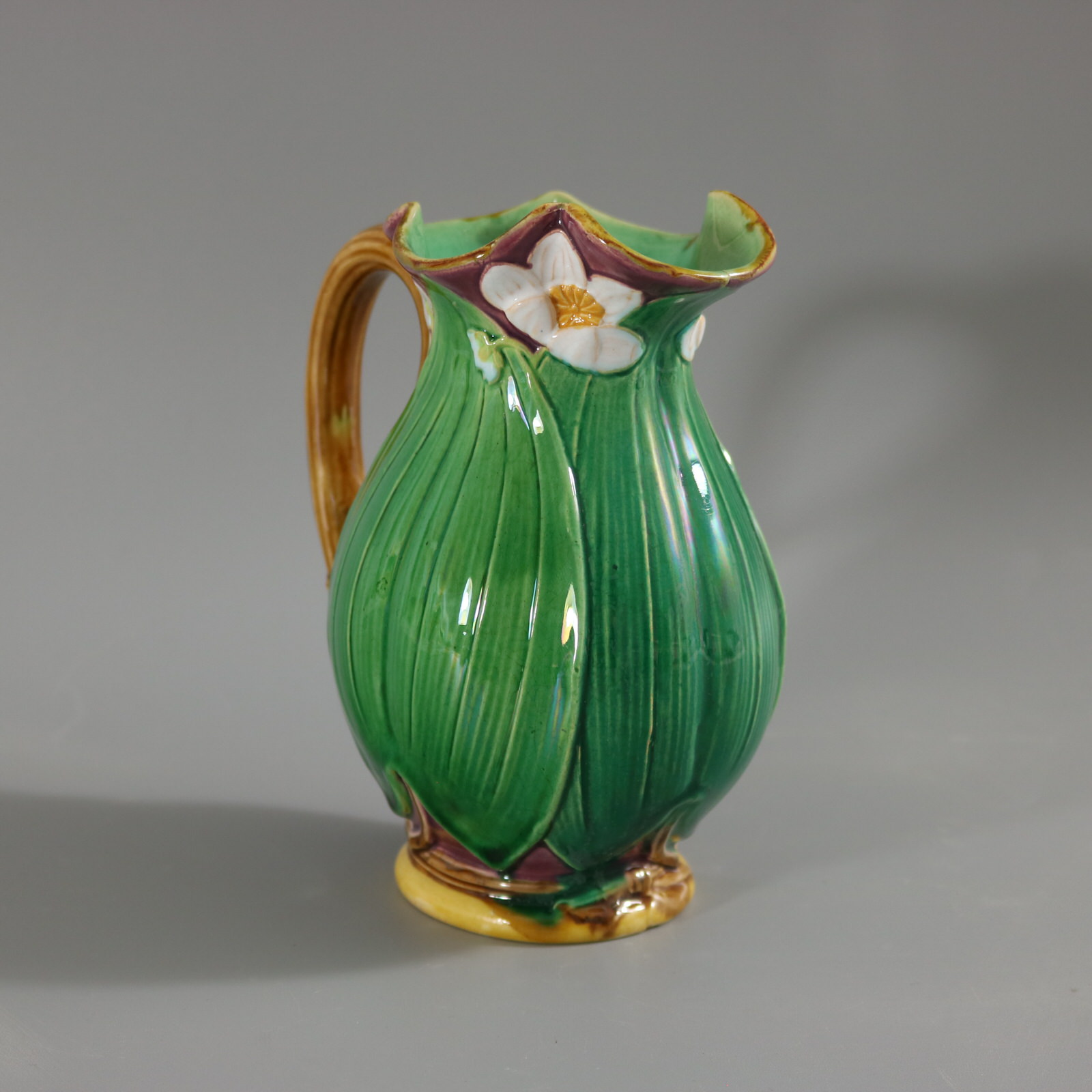 Victorian, circa 1869. 6.3ins high, 5.1ins wide, 3.5ins depth. Minton Majolica jug/pitcher which features flowering lilies and lily pads.