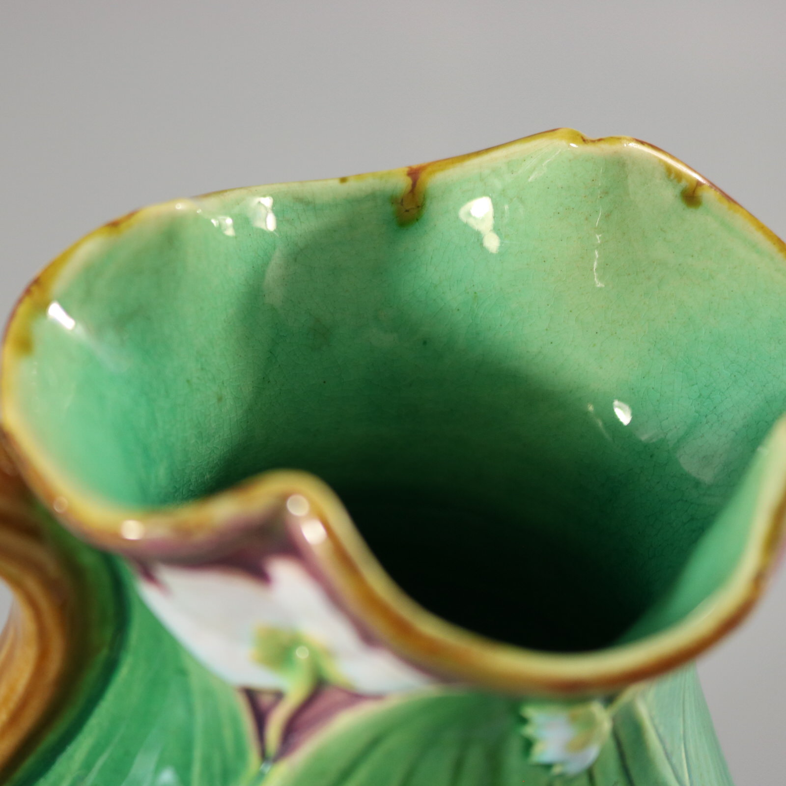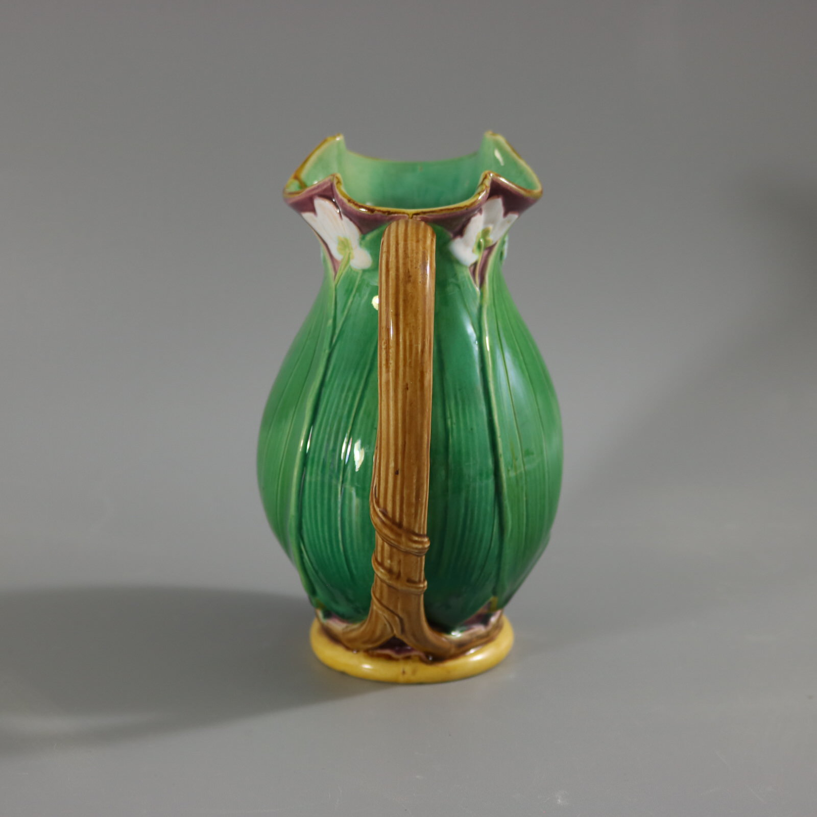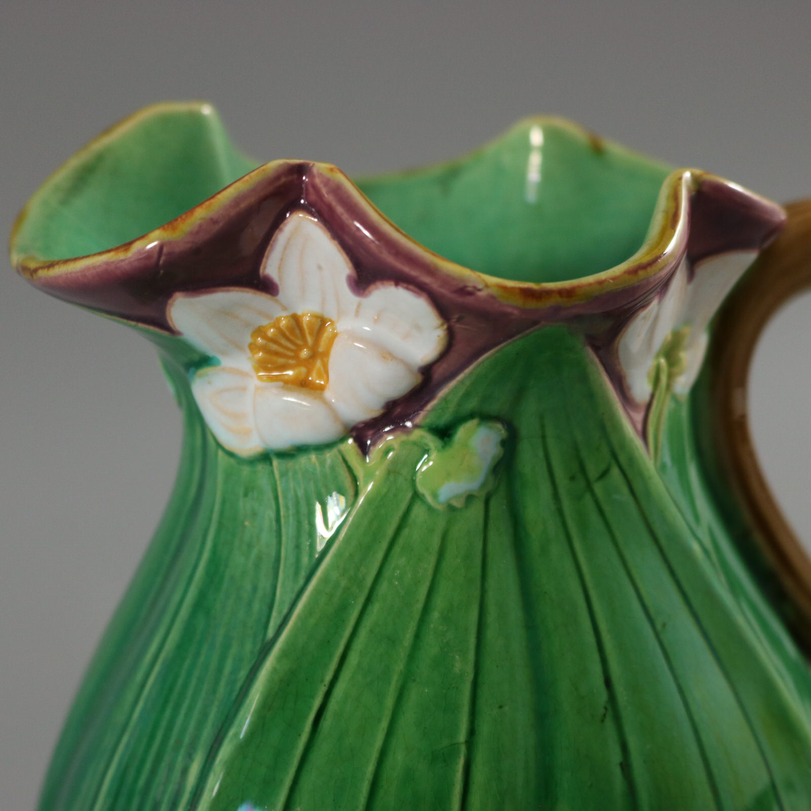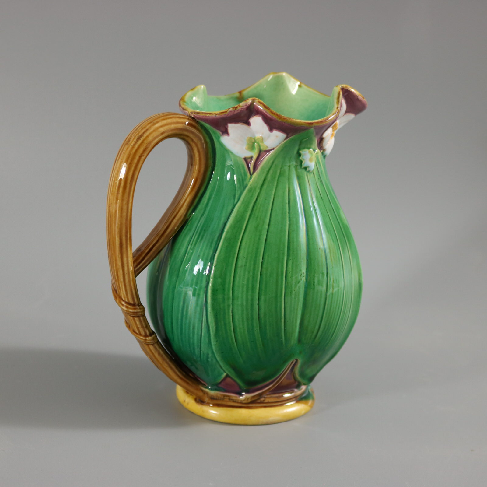 Victorian, circa 1869. 6.3ins high, 5.1ins wide, 3.5ins depth. Minton Majolica jug/pitcher which features flowering lilies and lily pads.