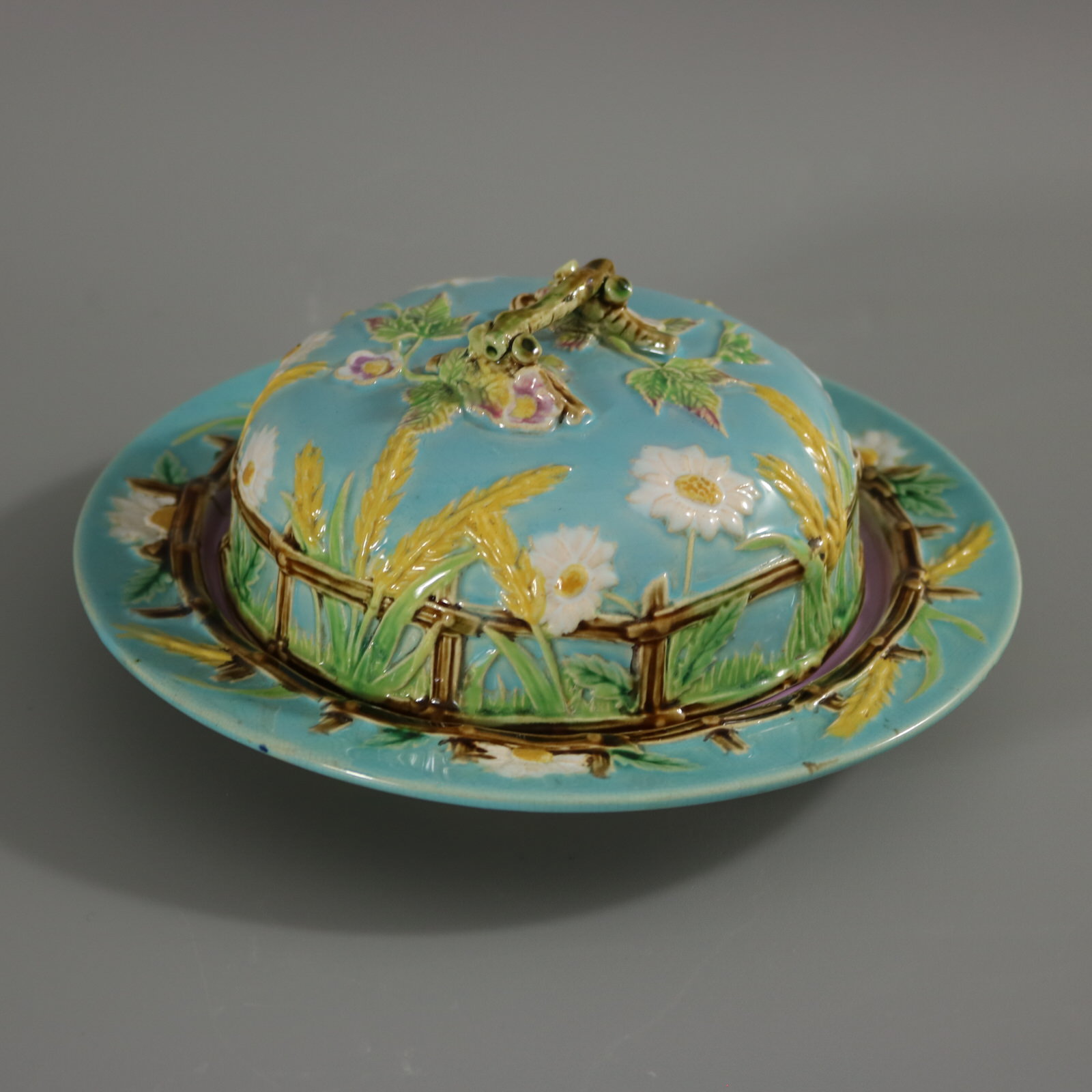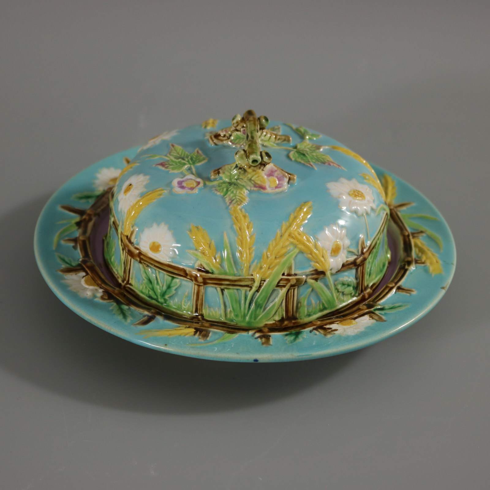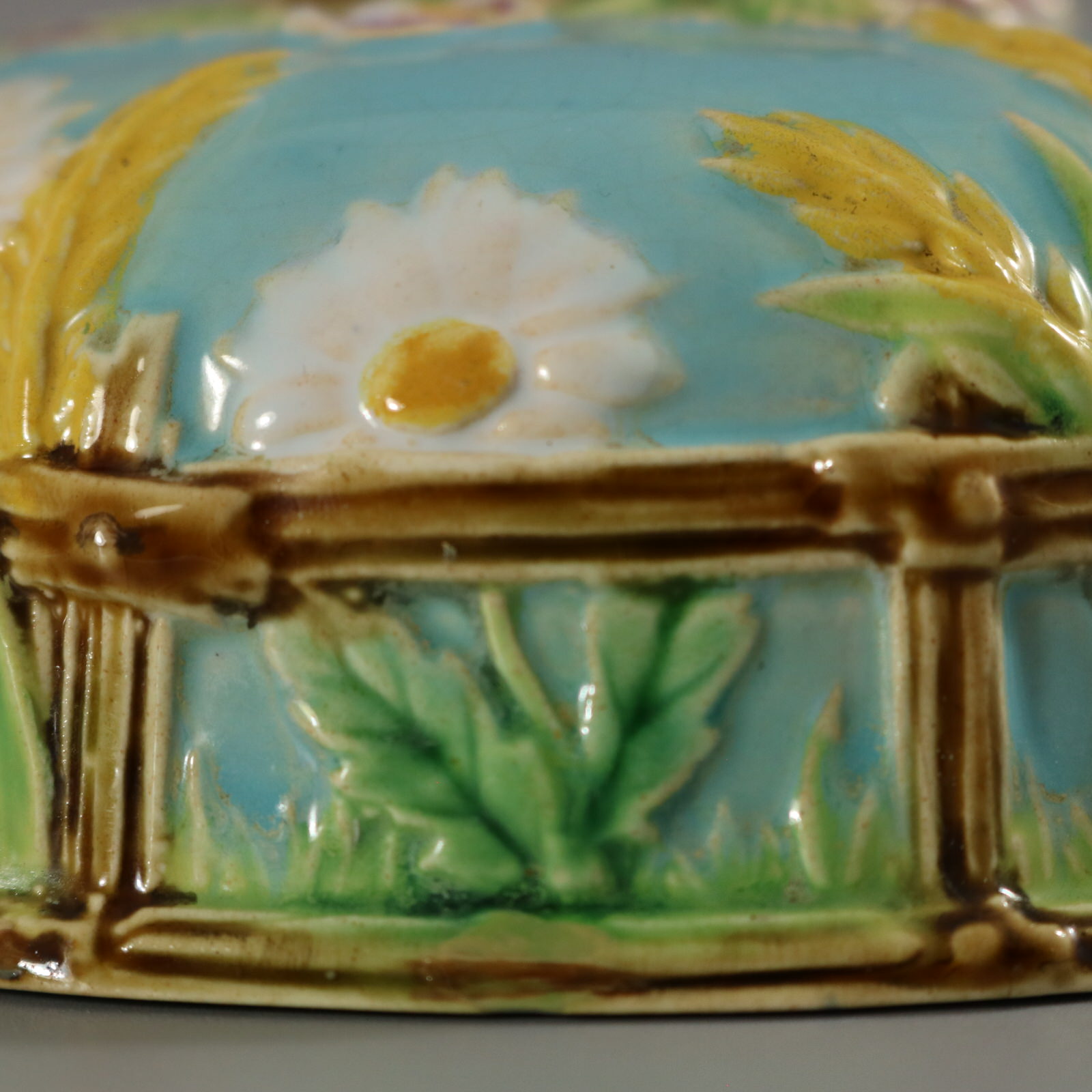 Victorian, circa 1872. 3.5ins high, 7.9ins wide, 7.9ins depth. George Jones Majolica muffin dish and cover which features a picket fence, daisies, corn, brambles and a twig handle.