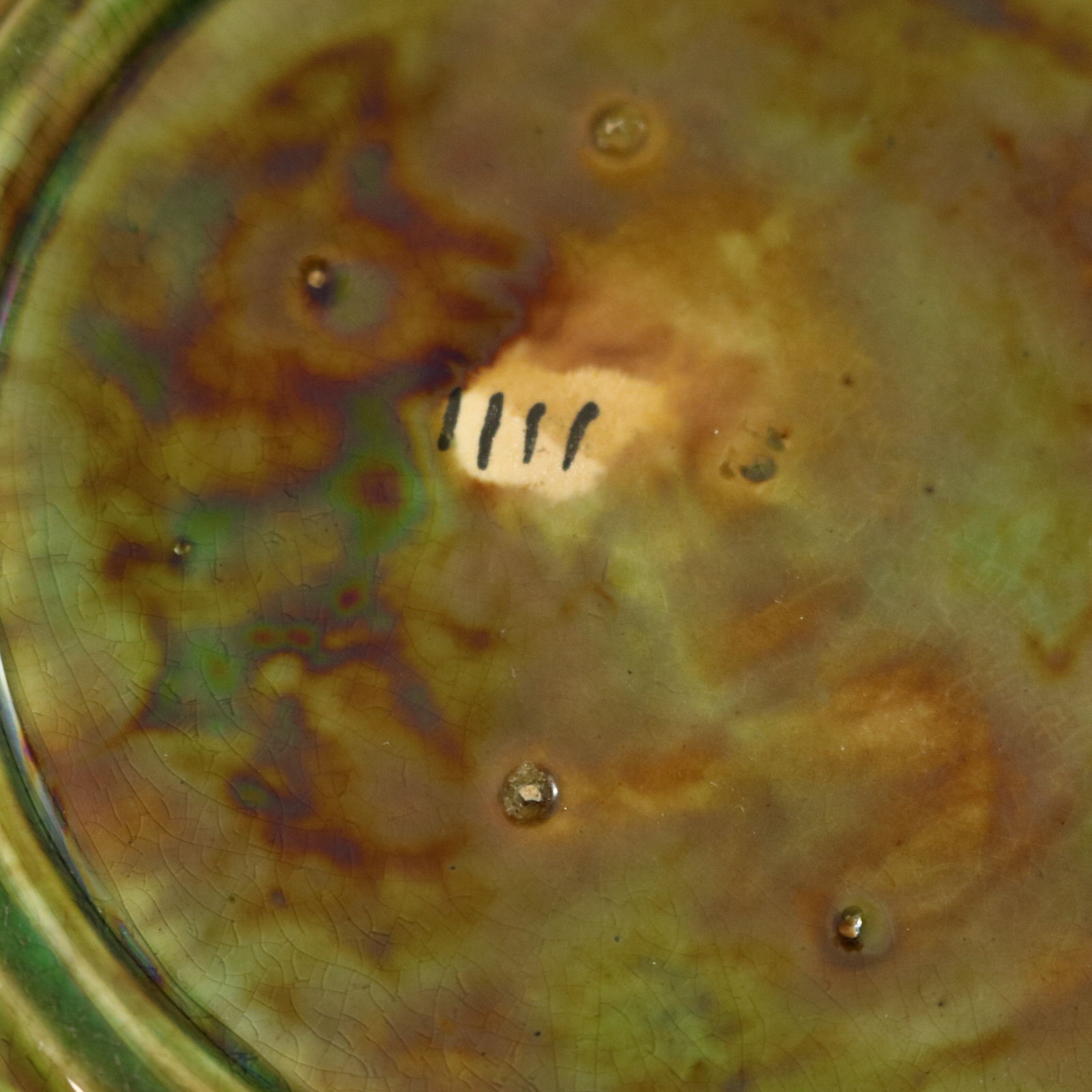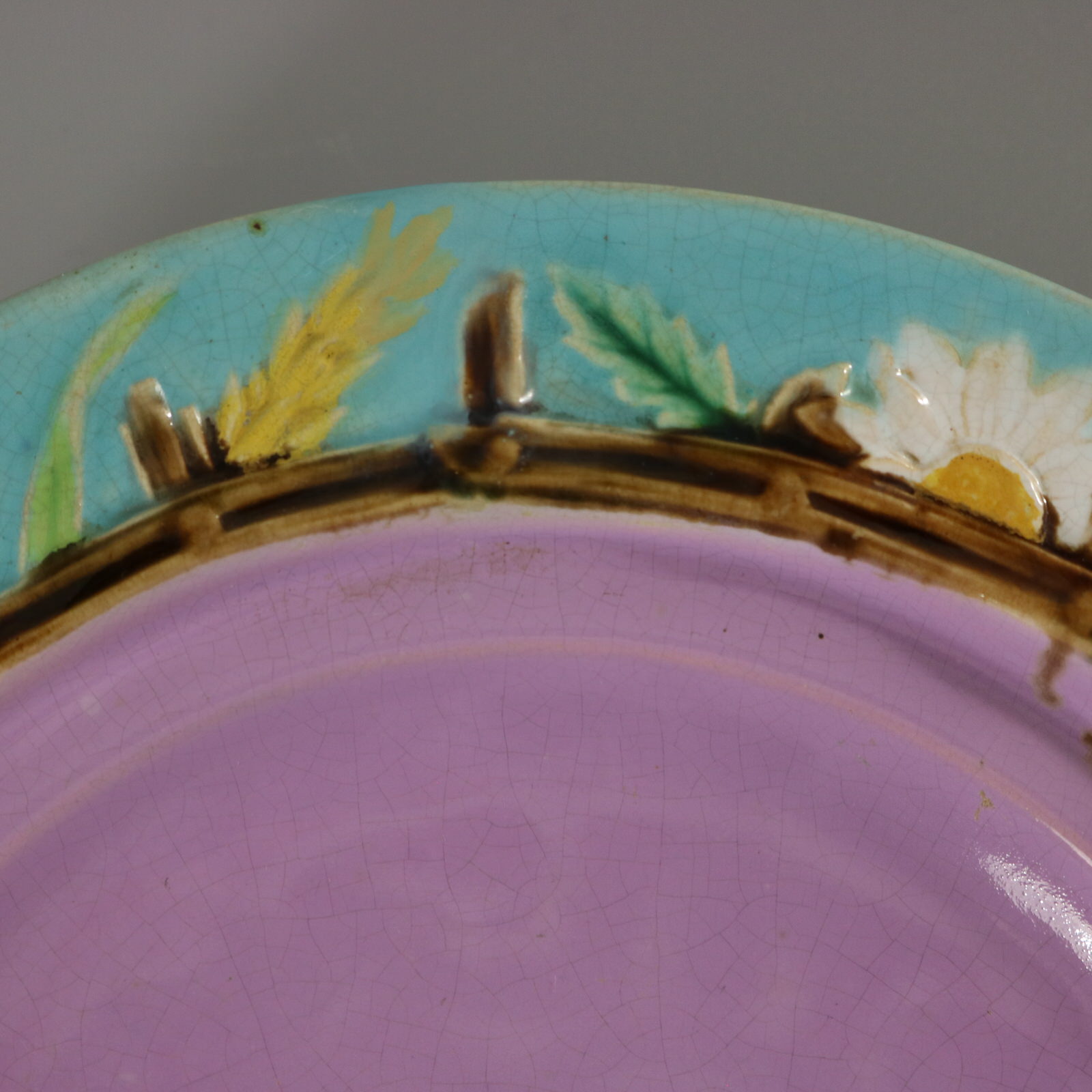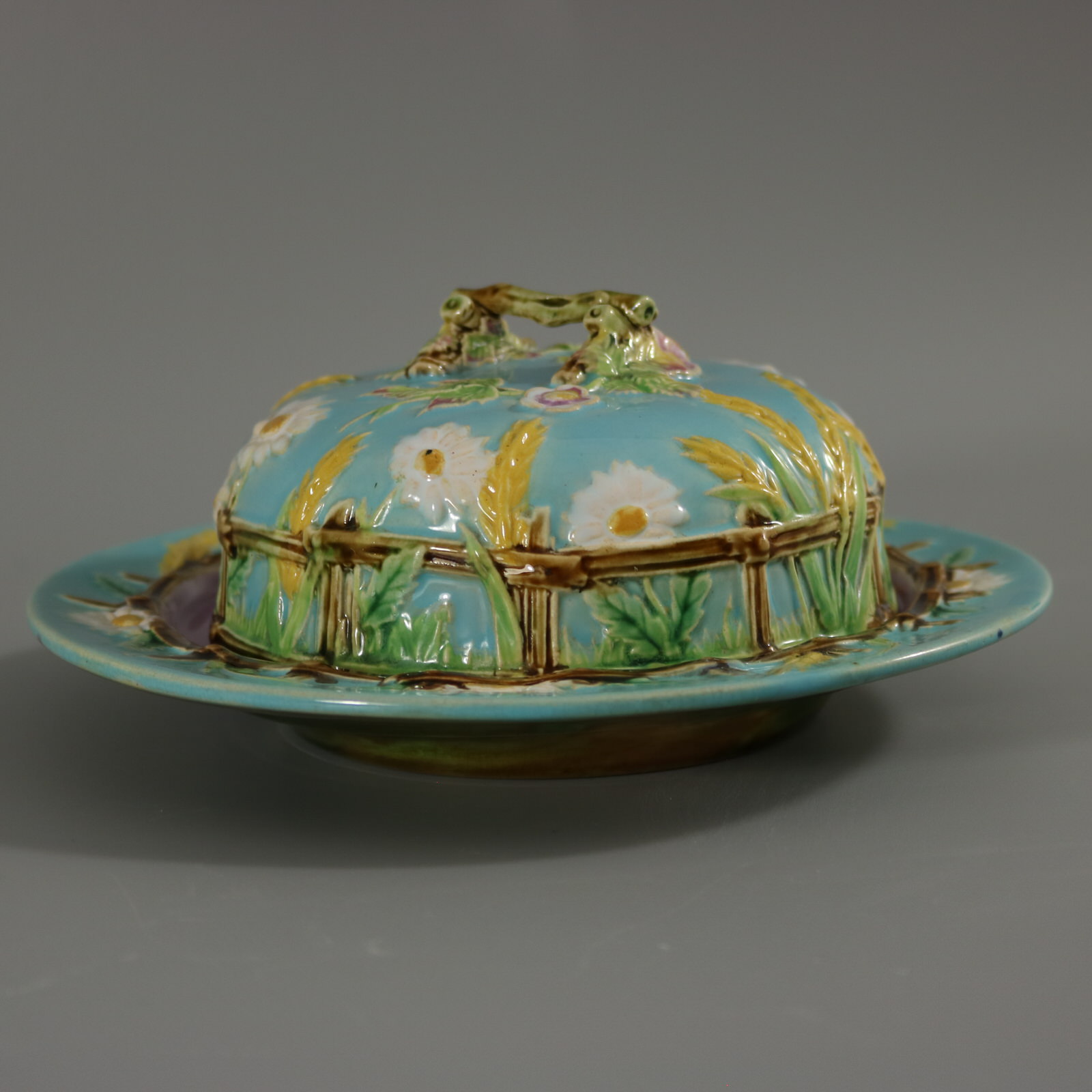 Victorian, circa 1872. 3.5ins high, 7.9ins wide, 7.9ins depth. George Jones Majolica muffin dish and cover which features a picket fence, daisies, corn, brambles and a twig handle.