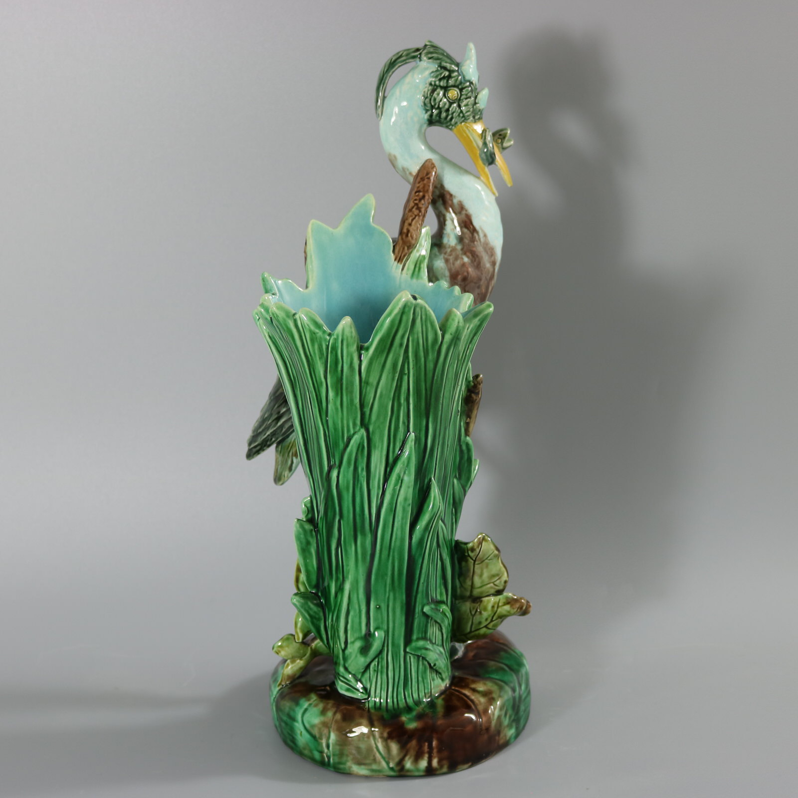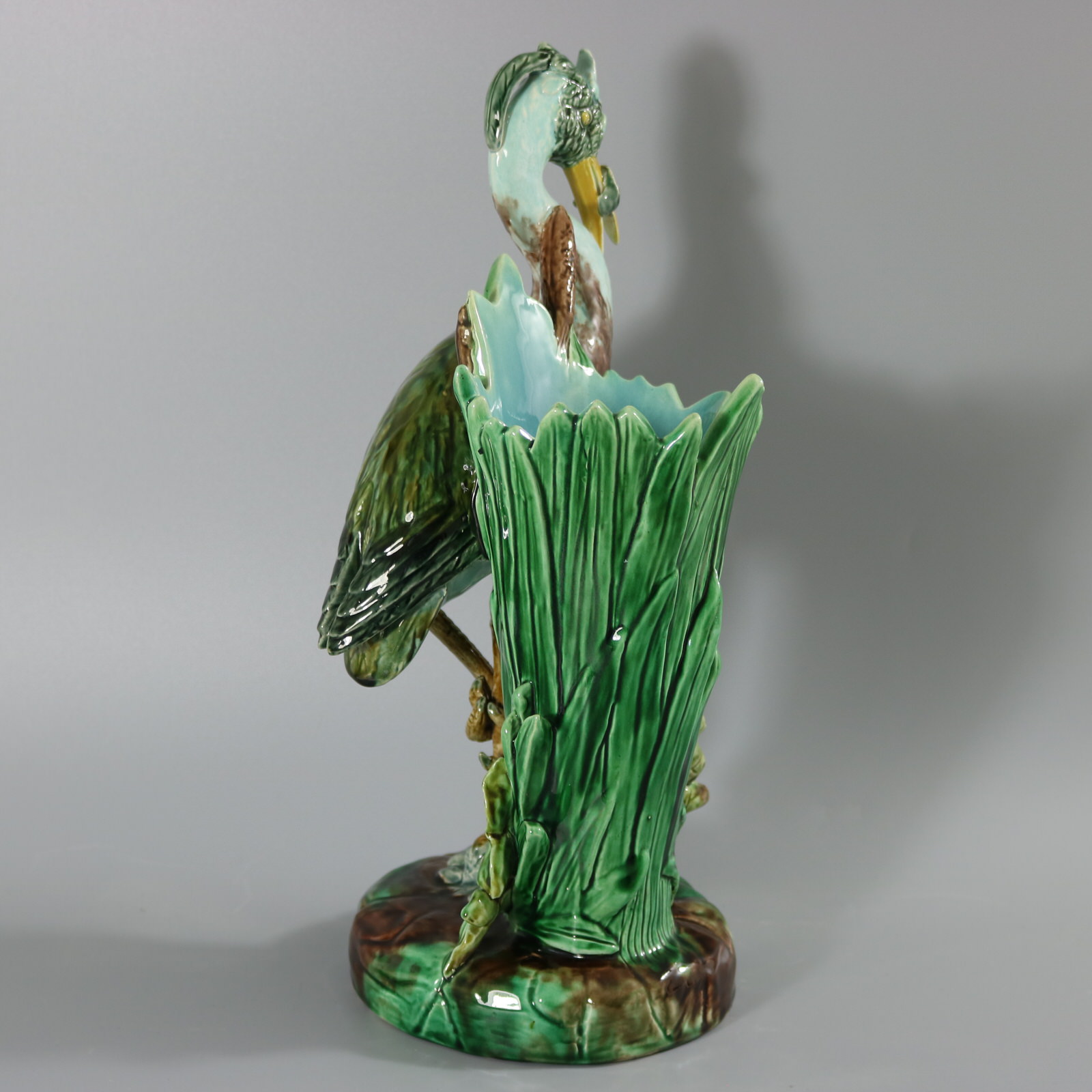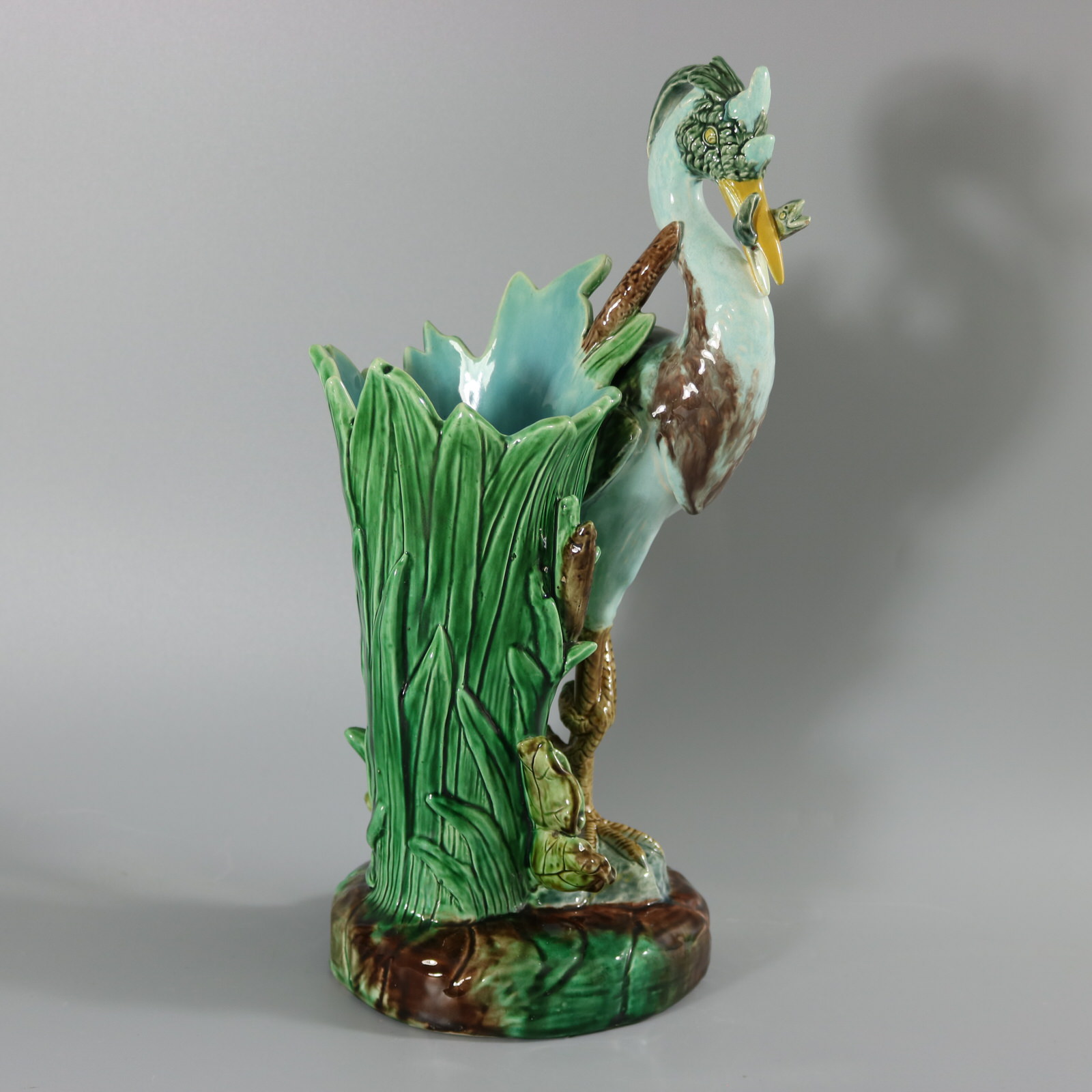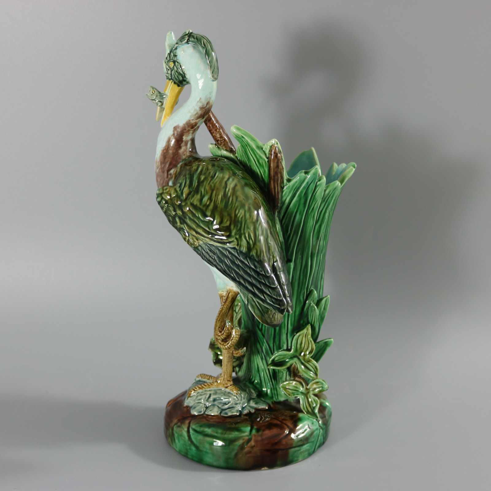 Victorian, circa 1880. 14.9ins high, 5.9ins wide, 7.1ins depth. Holdcroft Majolica figural vase which features a heron stood on one leg, upon a rock, holding a fish in its beak.