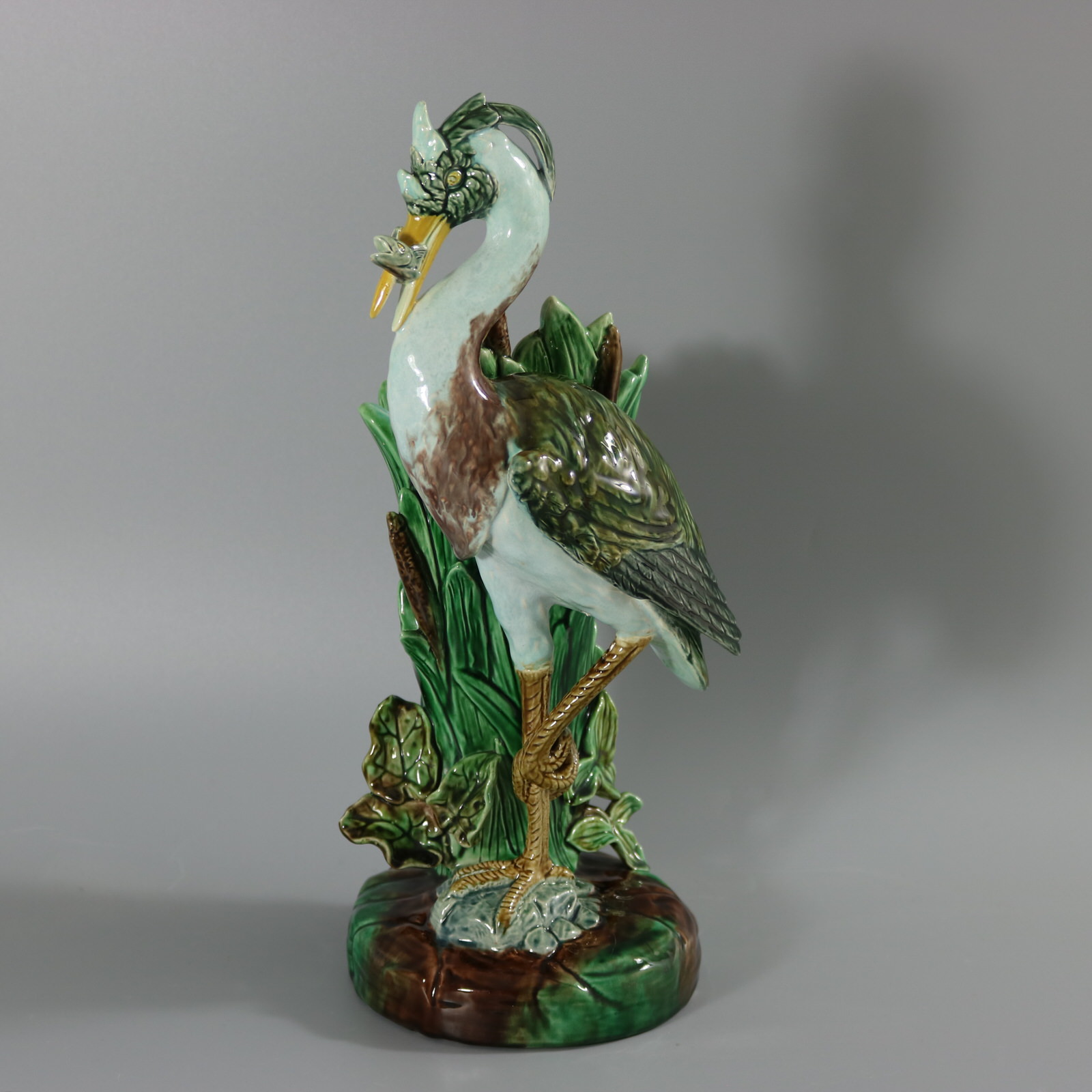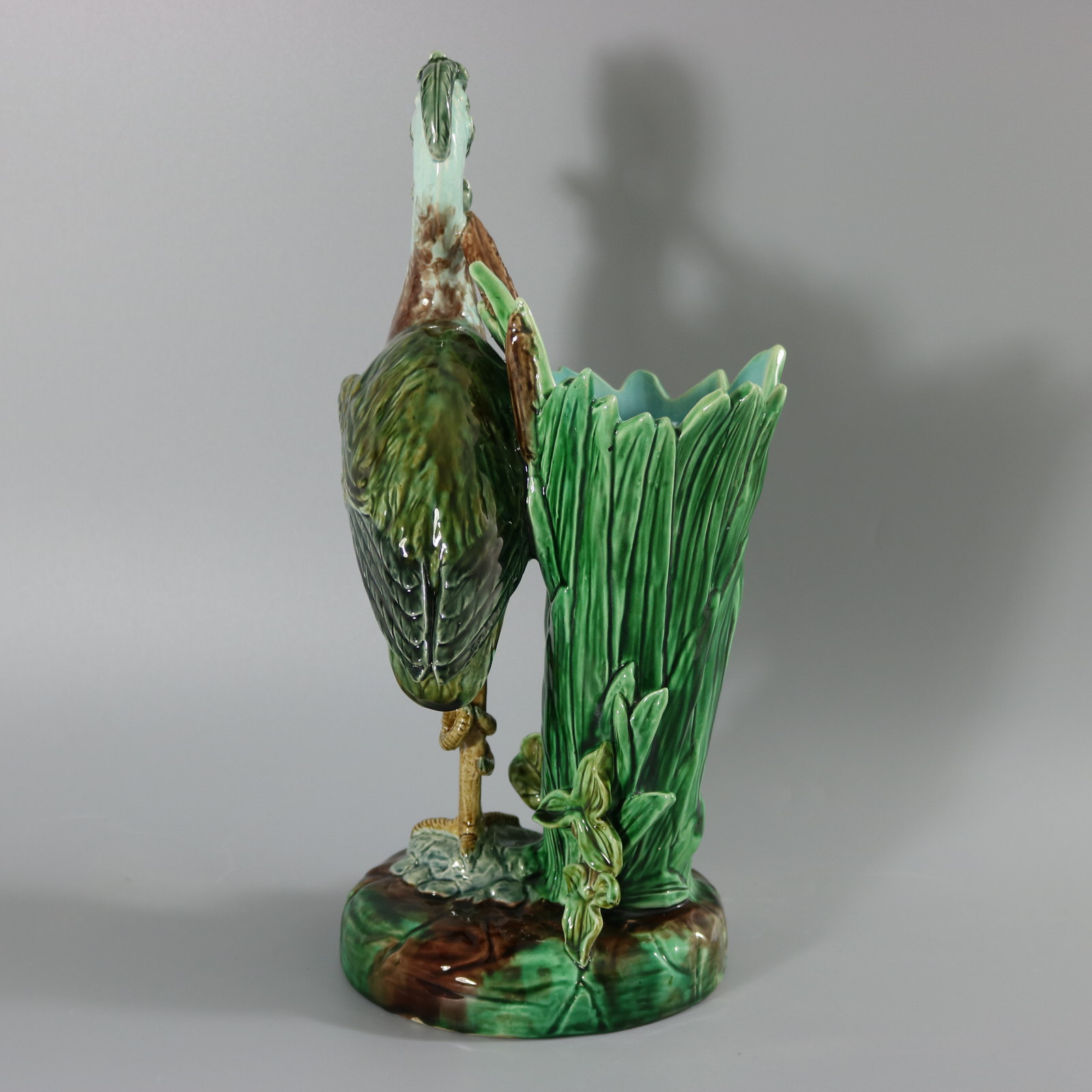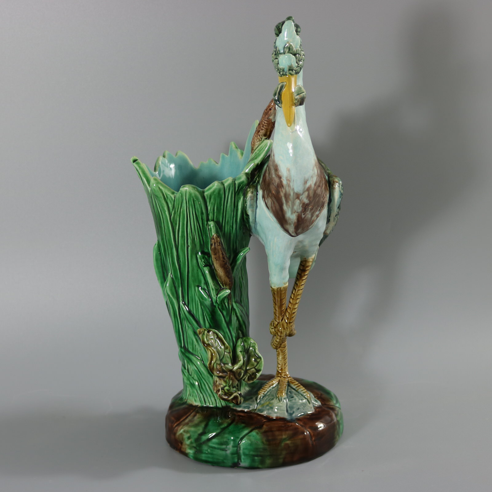 Victorian, circa 1880. 14.9ins high, 5.9ins wide, 7.1ins depth. Holdcroft Majolica figural vase which features a heron stood on one leg, upon a rock, holding a fish in its beak.