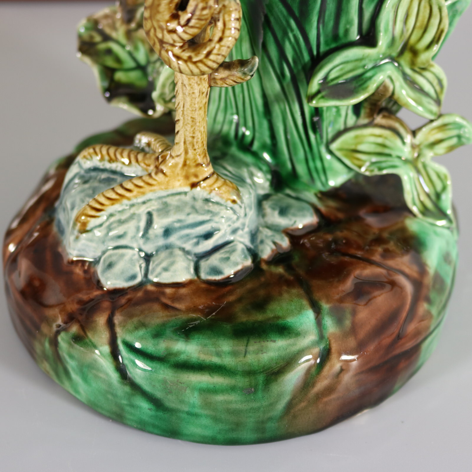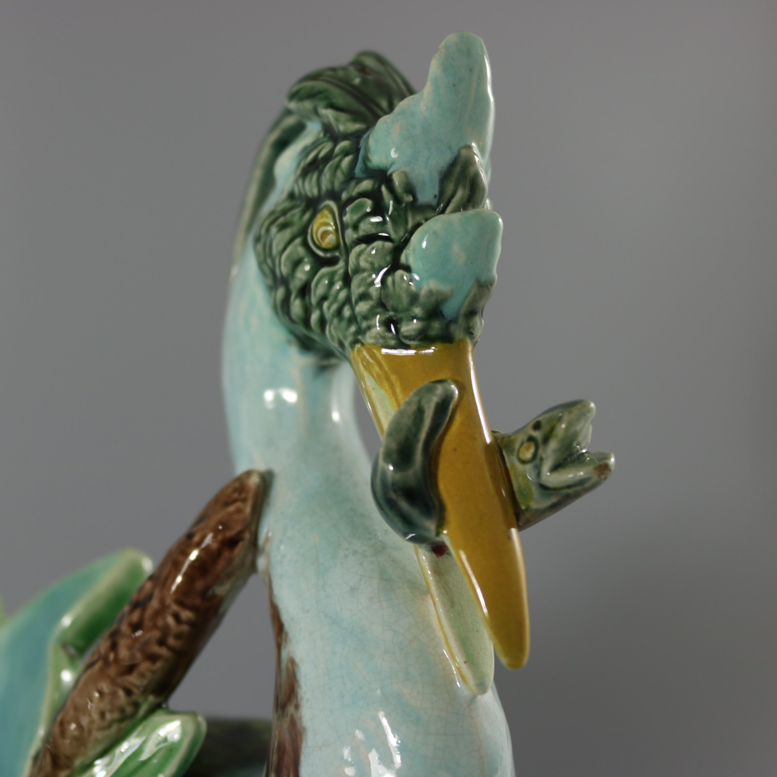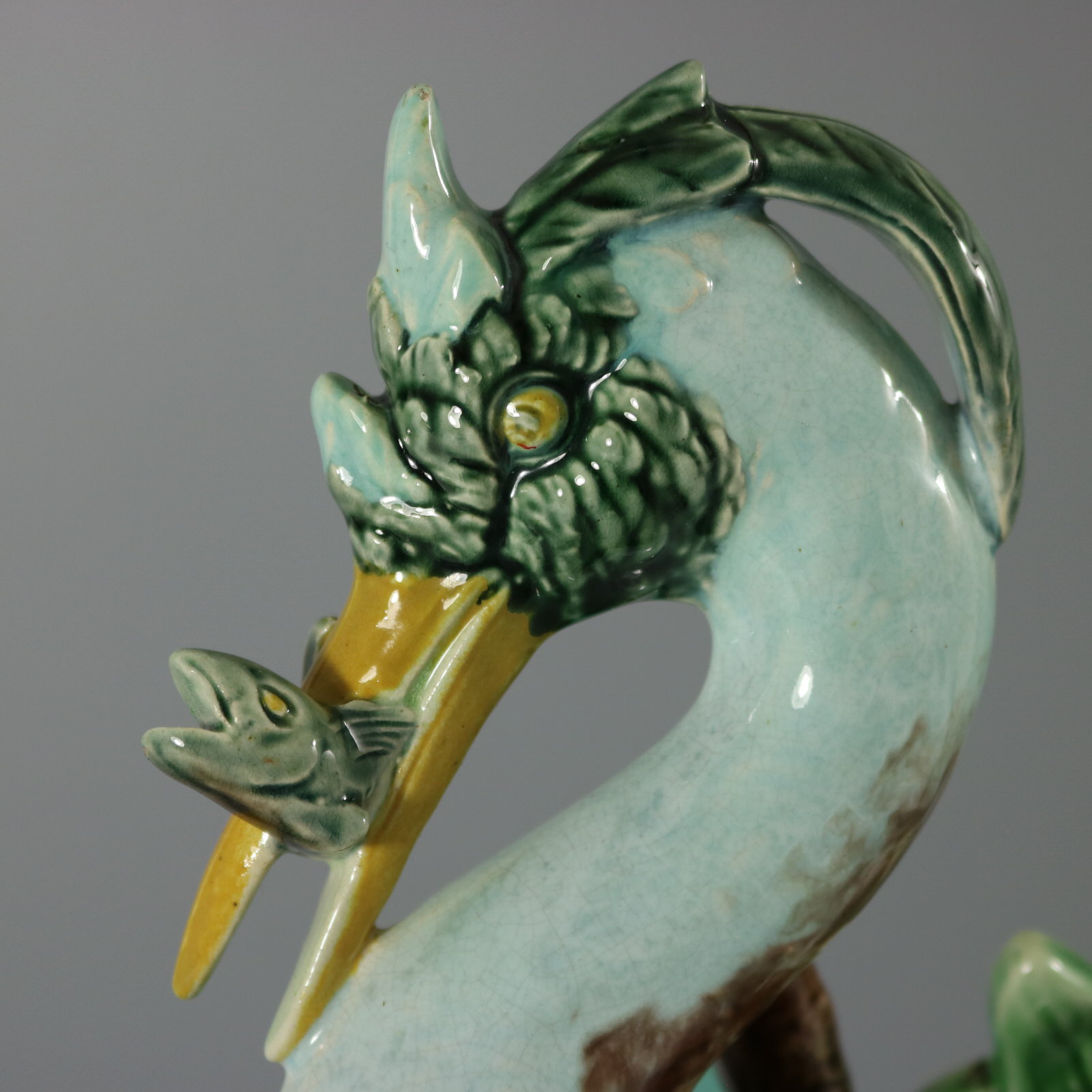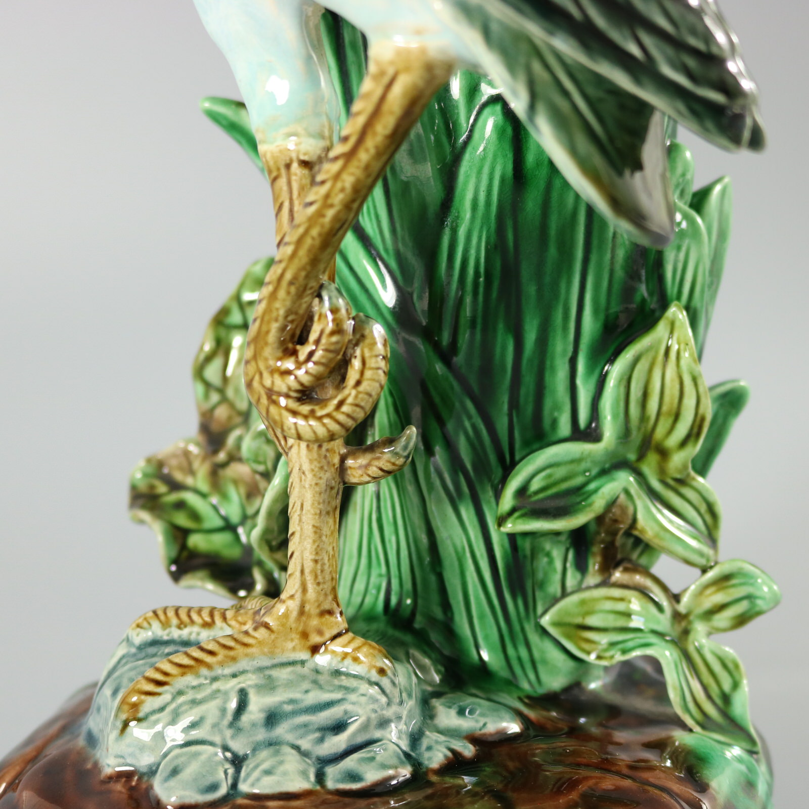 Victorian, circa 1880. 14.9ins high, 5.9ins wide, 7.1ins depth. Holdcroft Majolica figural vase which features a heron stood on one leg, upon a rock, holding a fish in its beak.