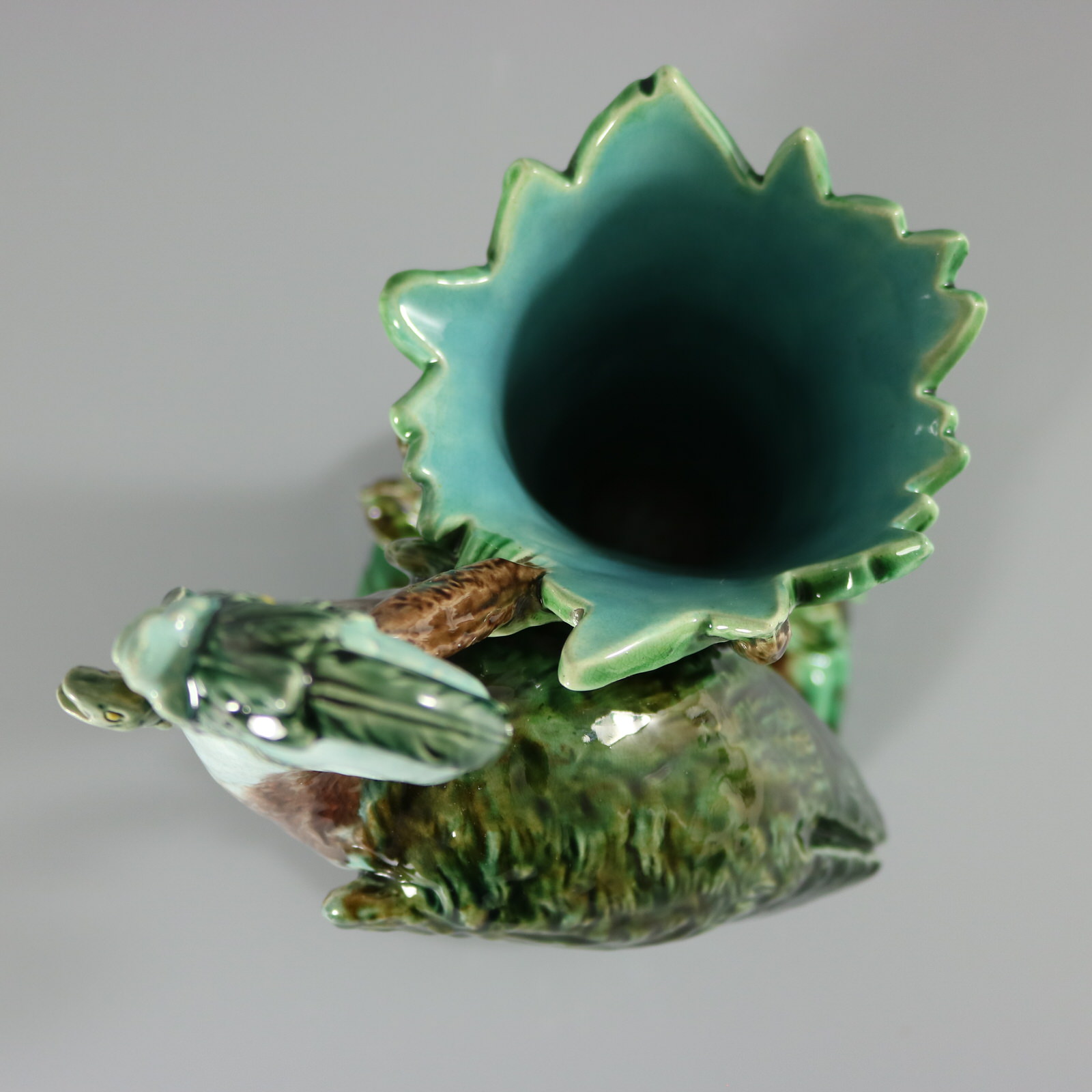 The trumpet shaped vase behind is modelled in the form of leaves, reeds and bulrushes/cattails.