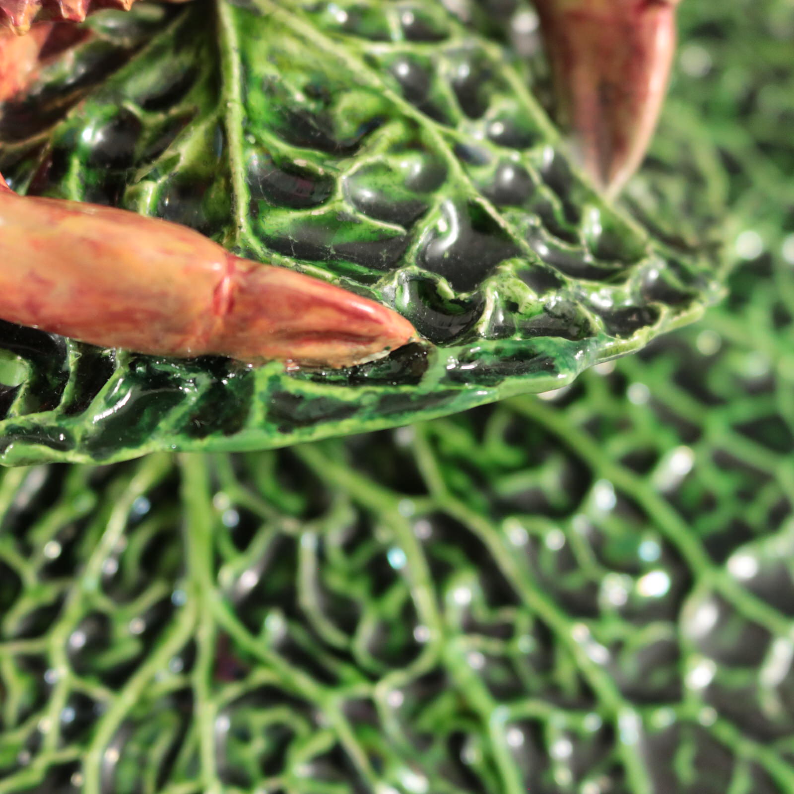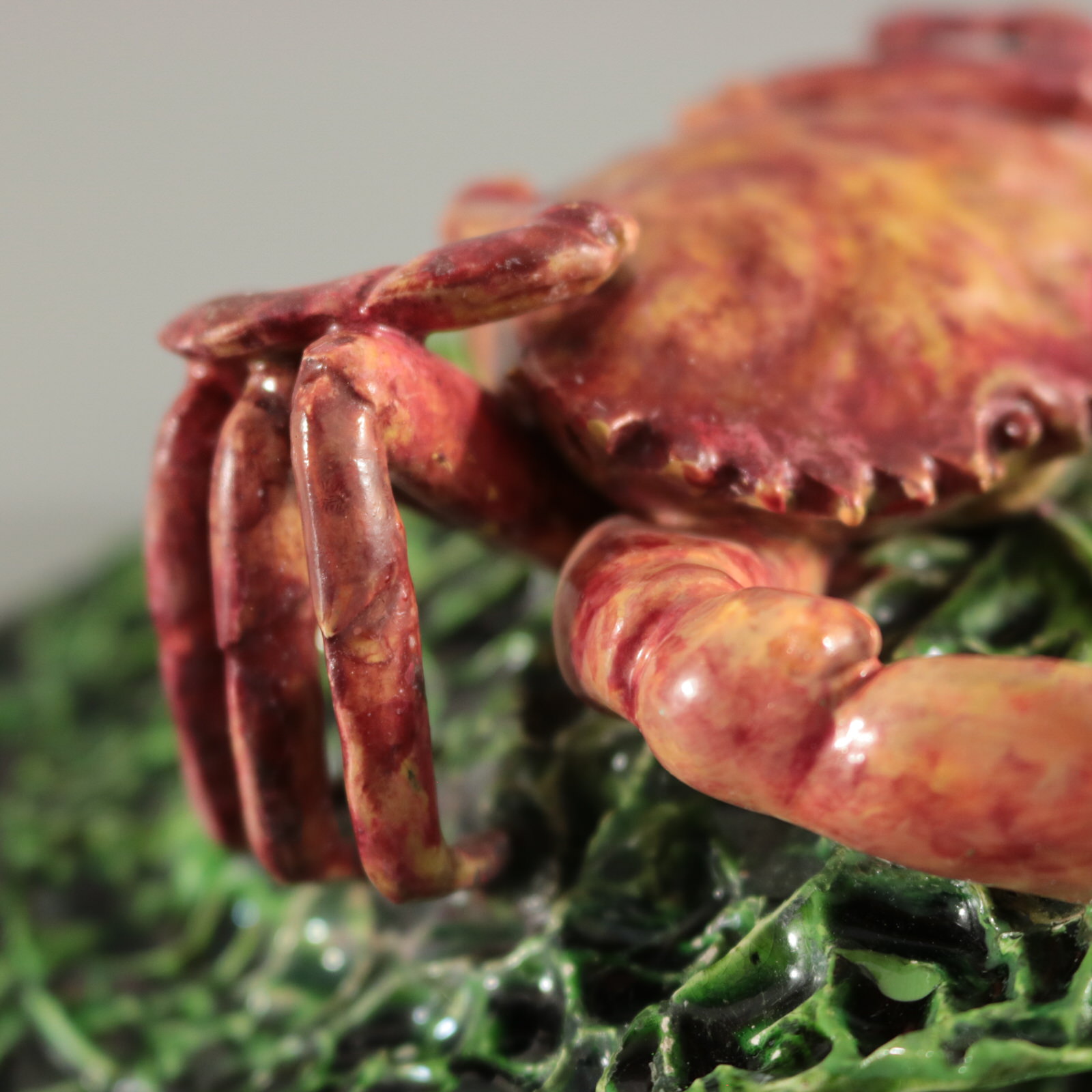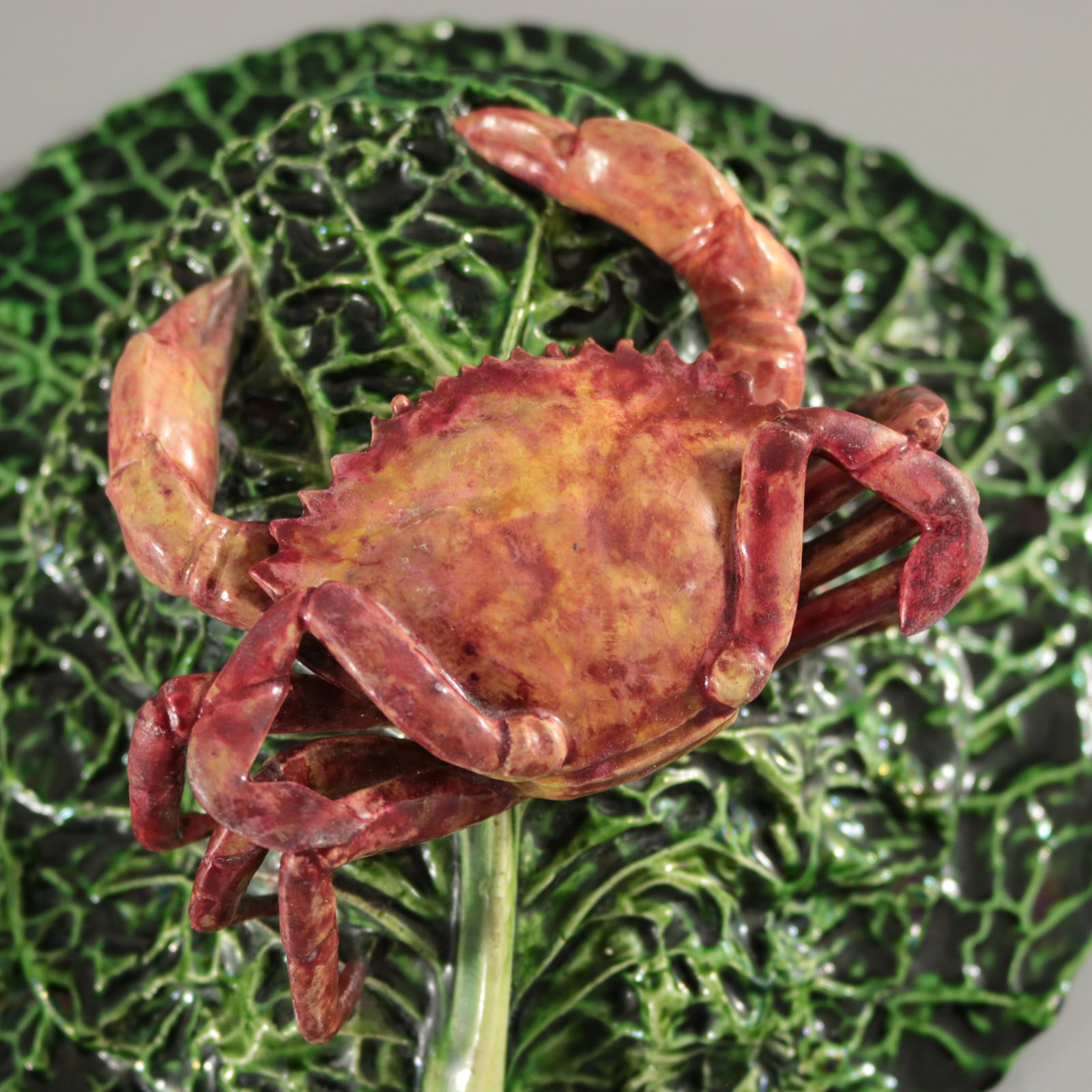 Circa 1890. 8.7ins high, 7.9ins wide, 3.1ins depth. Jose A Cunha Portuguese Palissy Majolica wall pocket which features a crab on cabbage leaves.