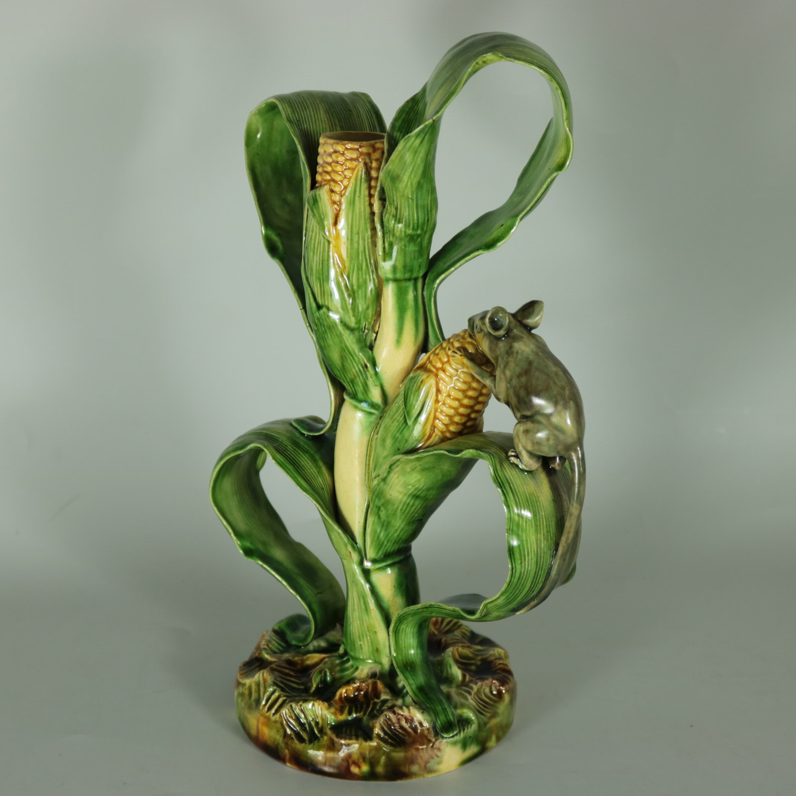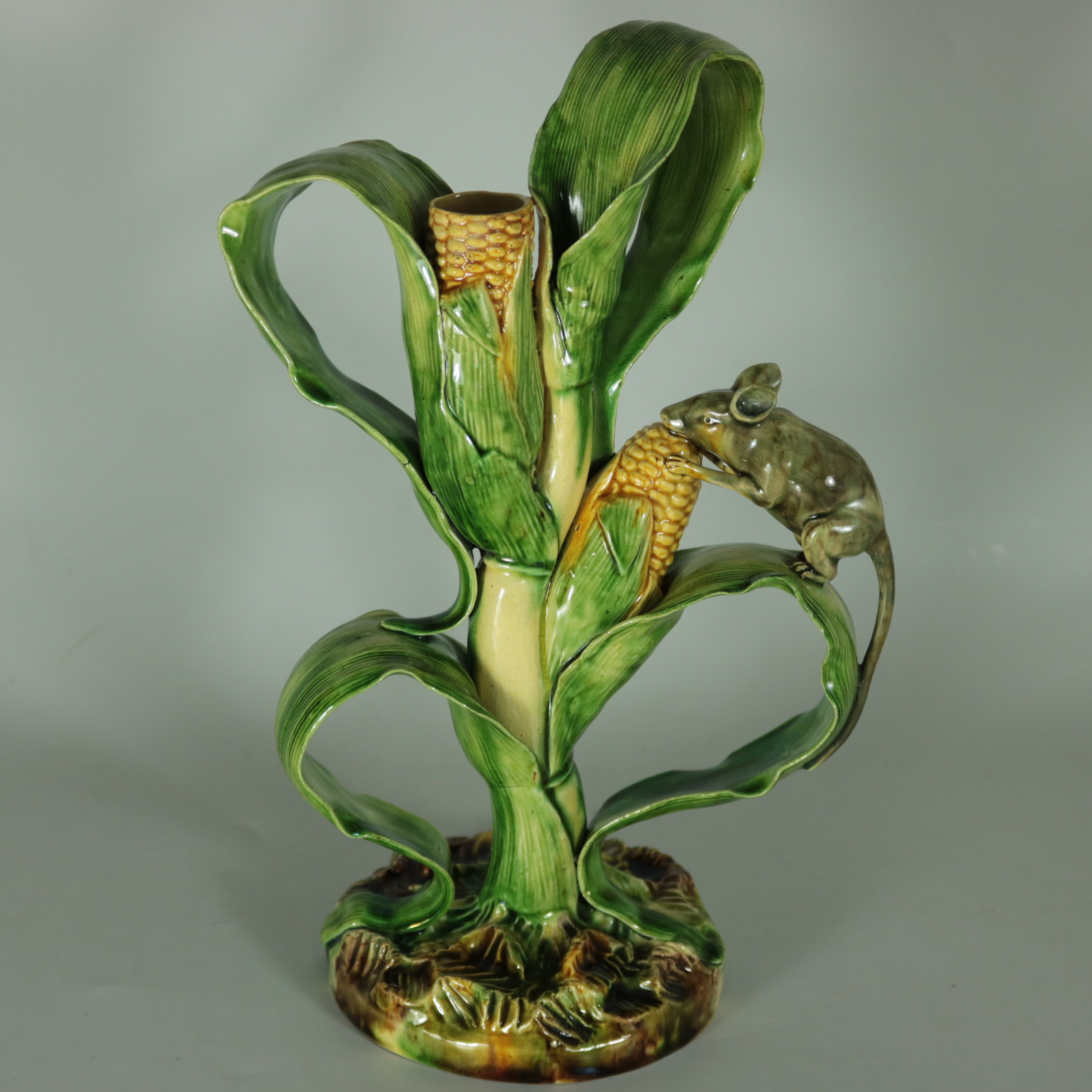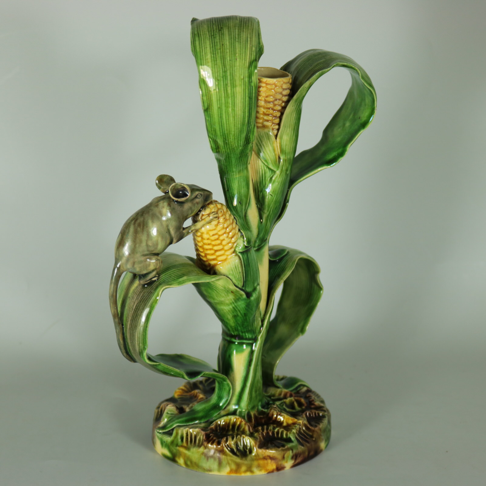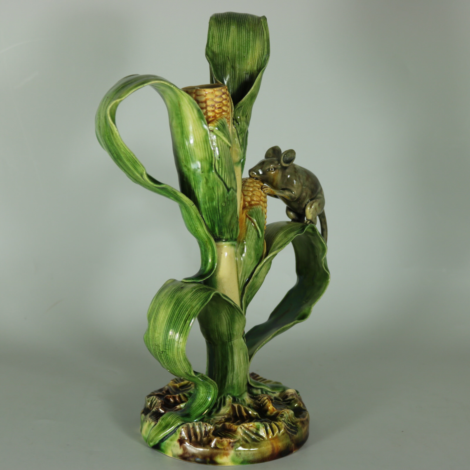 Circa 1890. 10ins high, 6.7ins wide, 4.2ins depth. Mafra Portuguese Palissy Majolica candlestick which features a mouse, nibbling on maize/sweetcorn cob plant.
