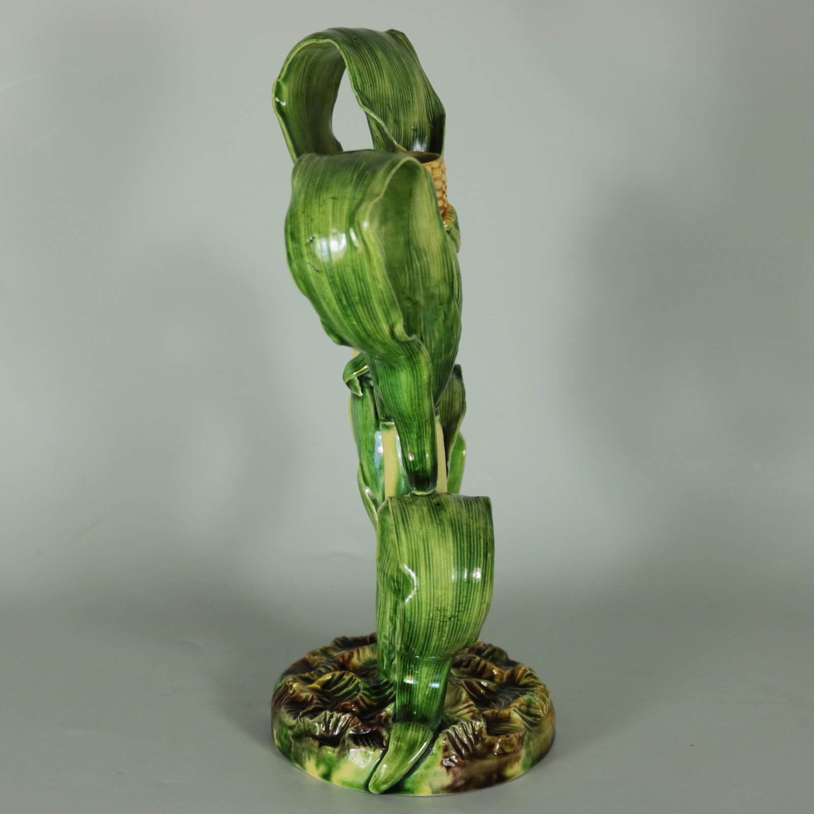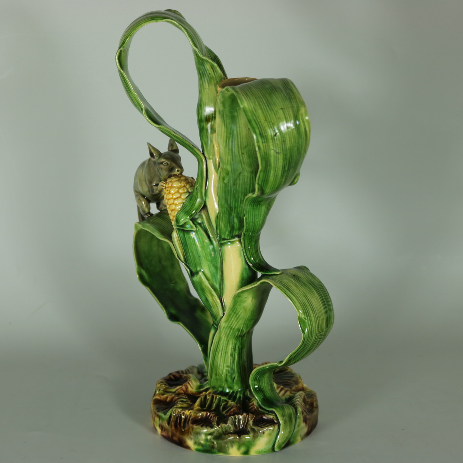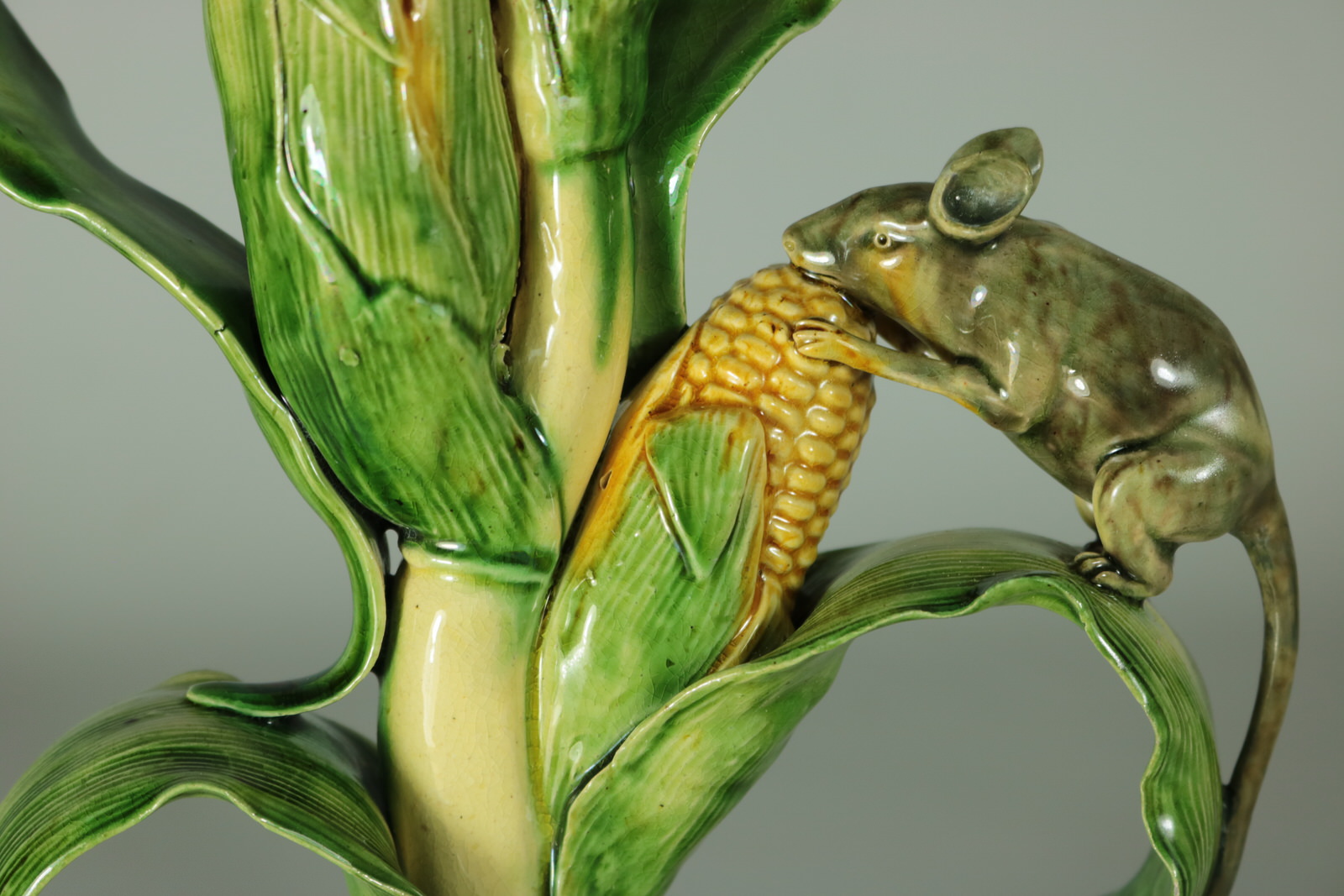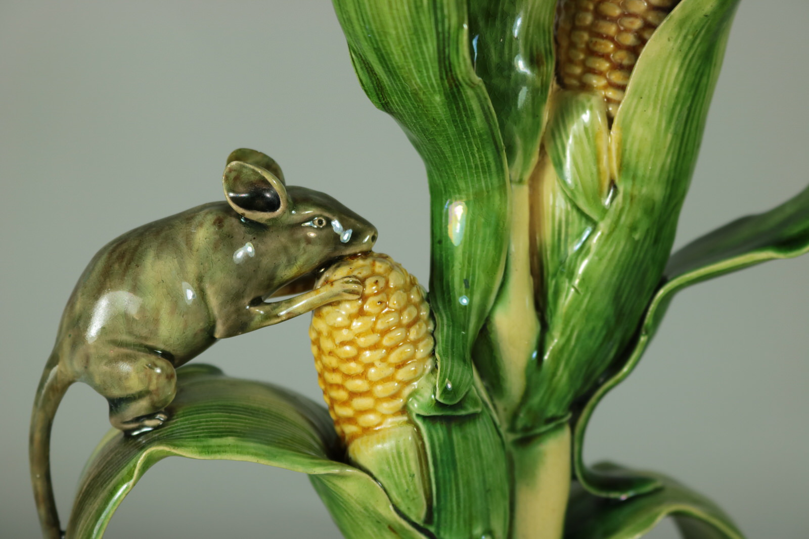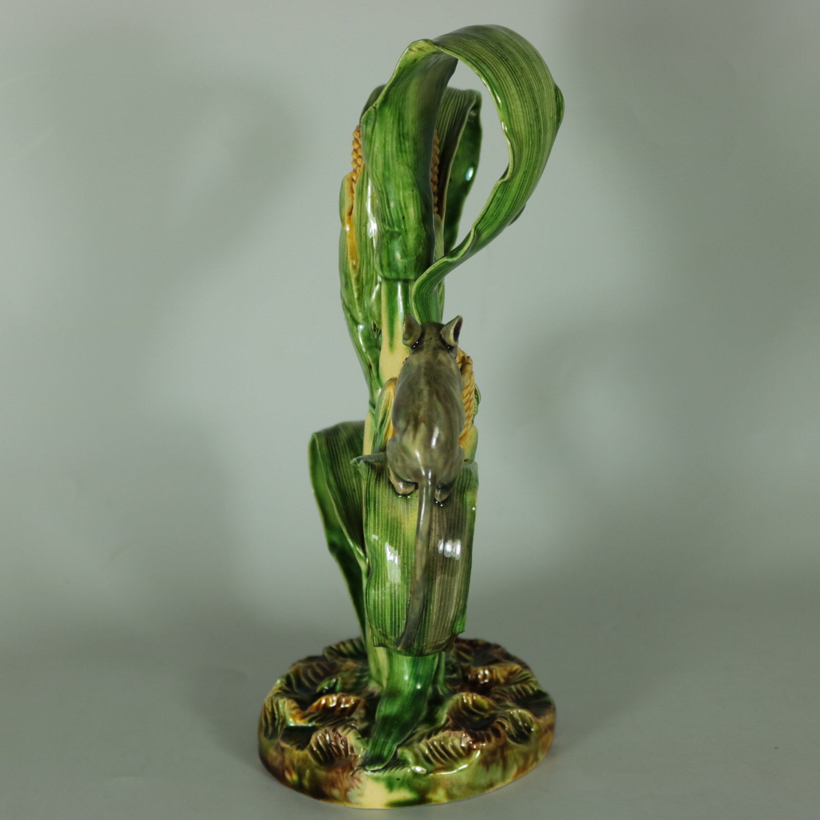Circa 1890. 10ins high, 6.7ins wide, 4.2ins depth. Mafra Portuguese Palissy Majolica candlestick which features a mouse, nibbling on maize/sweetcorn cob plant.