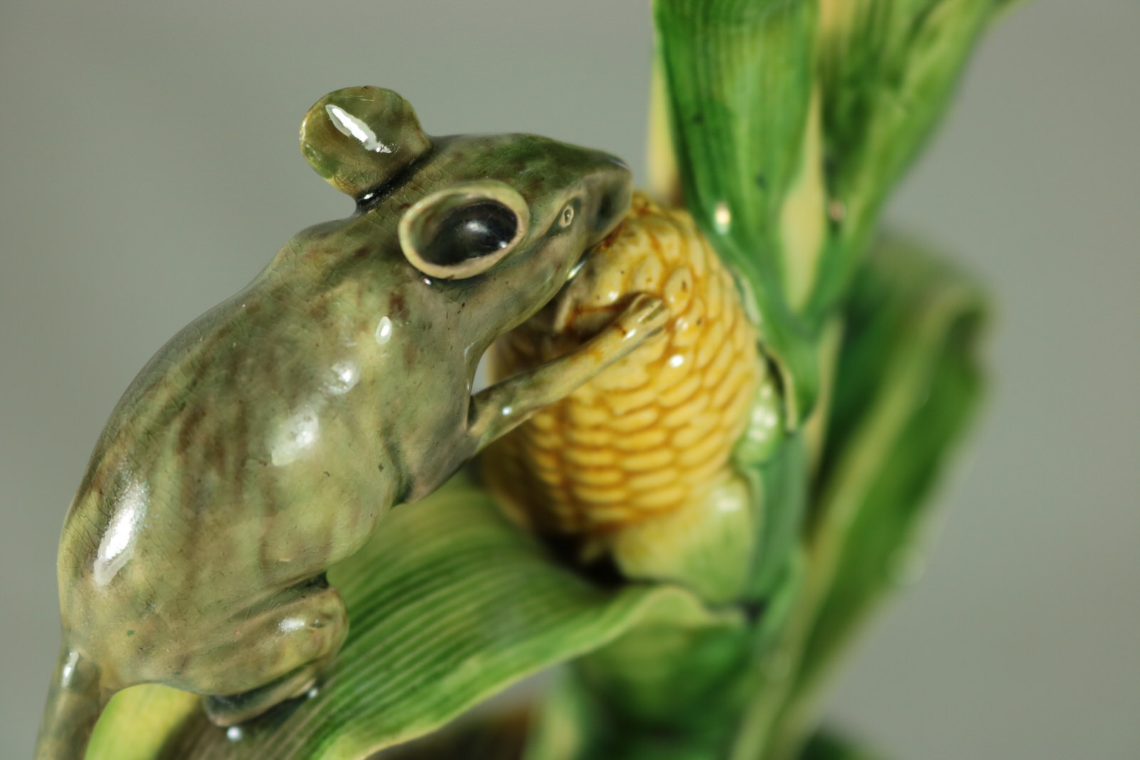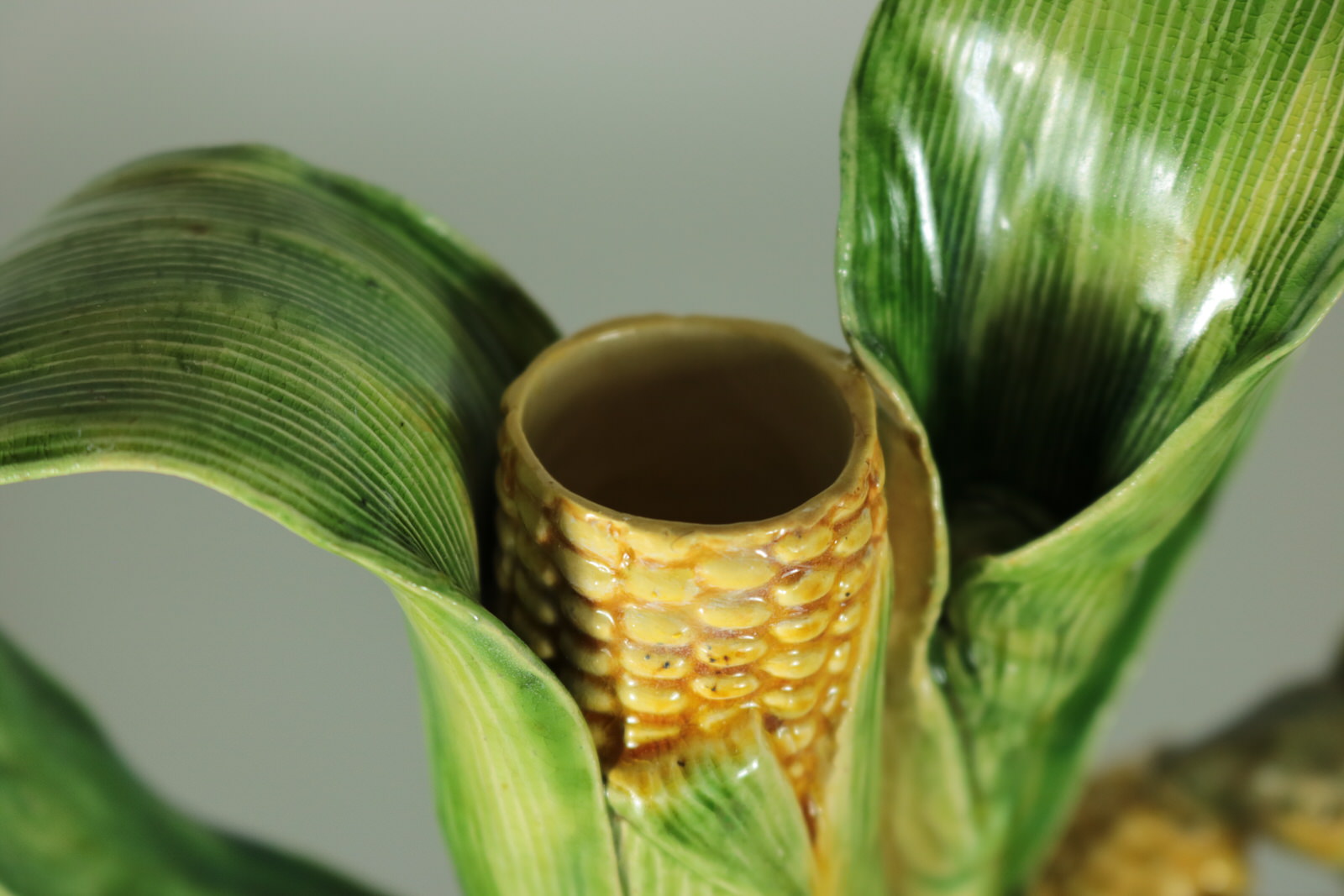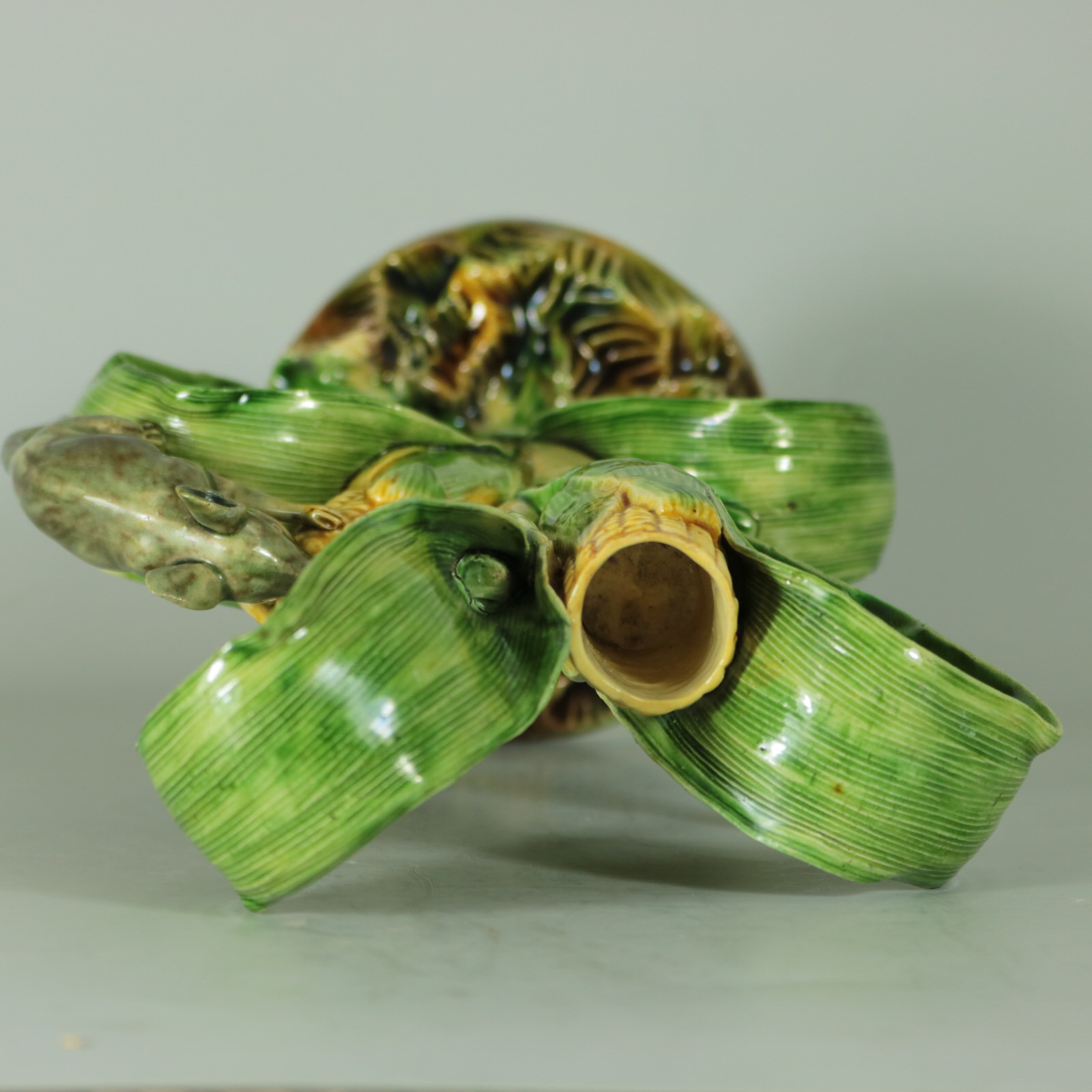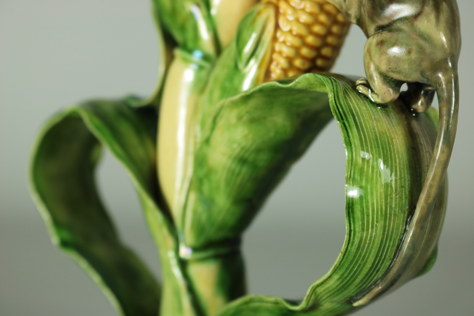 Circa 1890. 10ins high, 6.7ins wide, 4.2ins depth. Mafra Portuguese Palissy Majolica candlestick which features a mouse, nibbling on maize/sweetcorn cob plant.