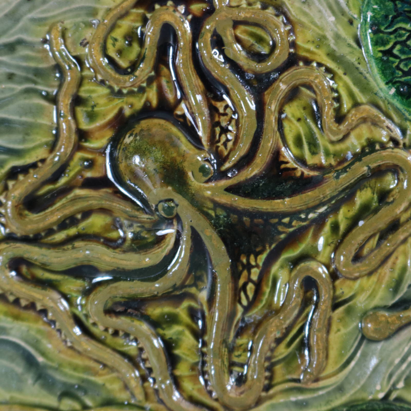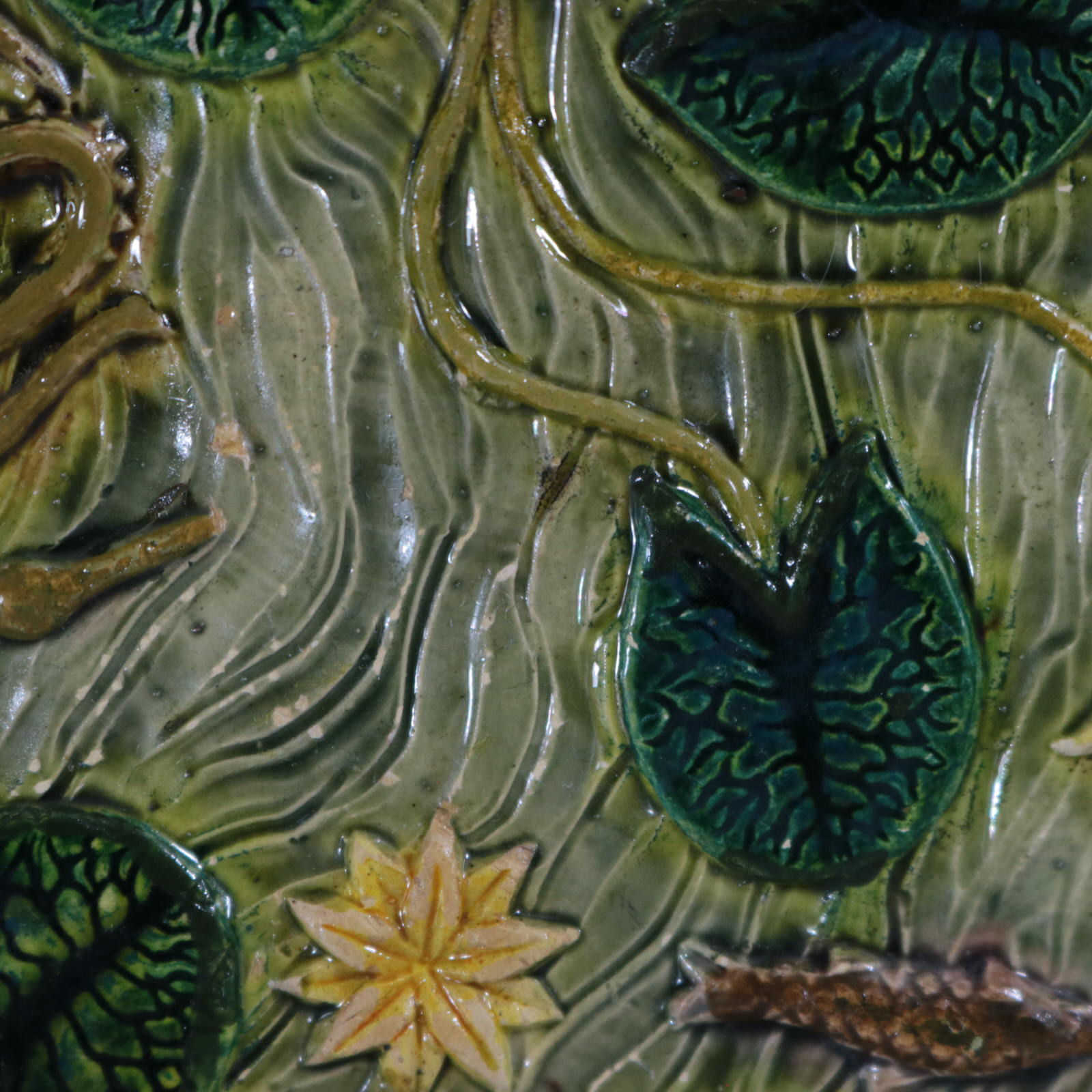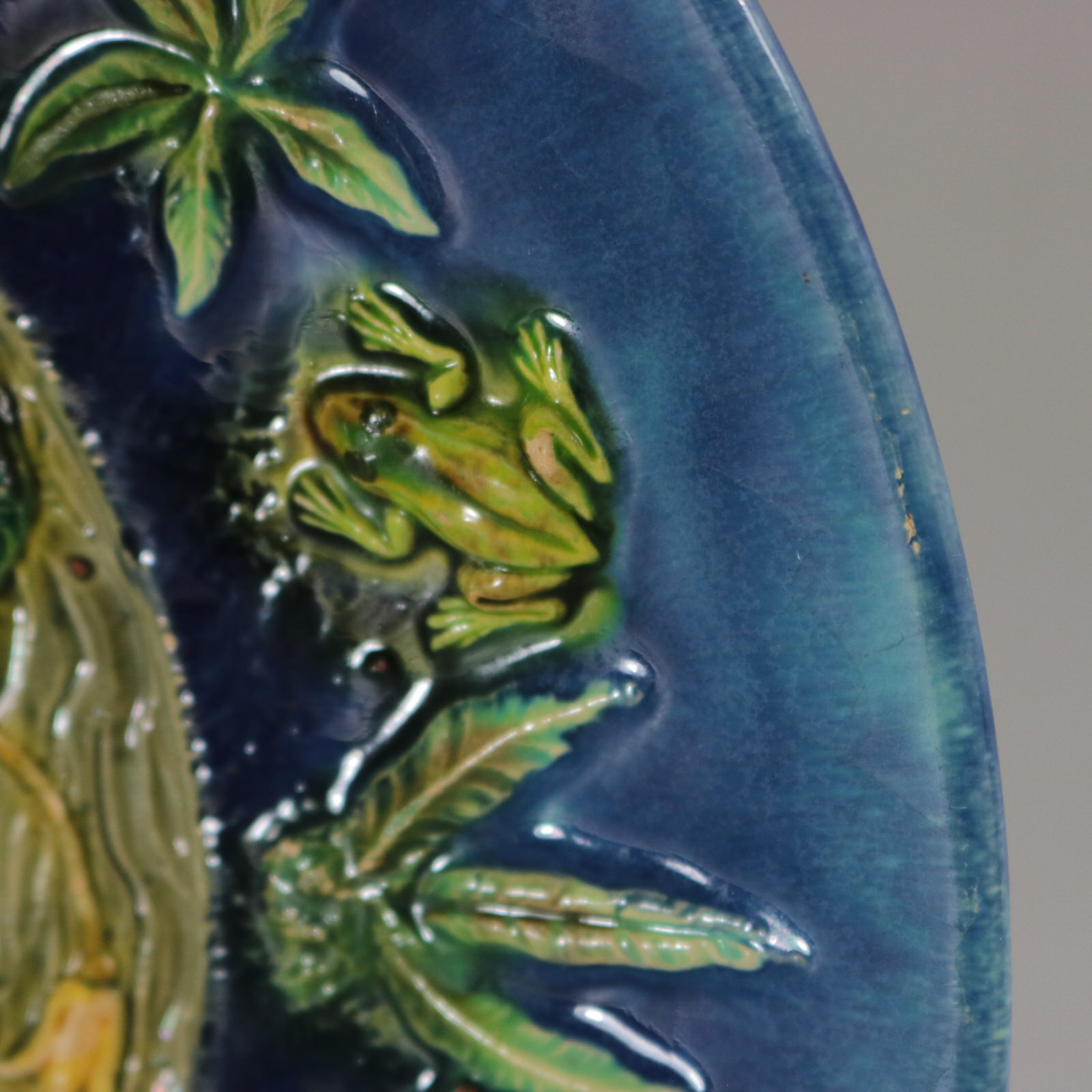 Circa 1880. 9.3ins high, 9.3ins wide, 1.2ins depth. Unidentified French French Palissy Majolica plate.