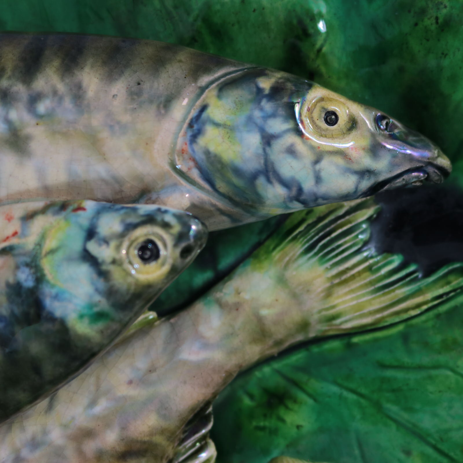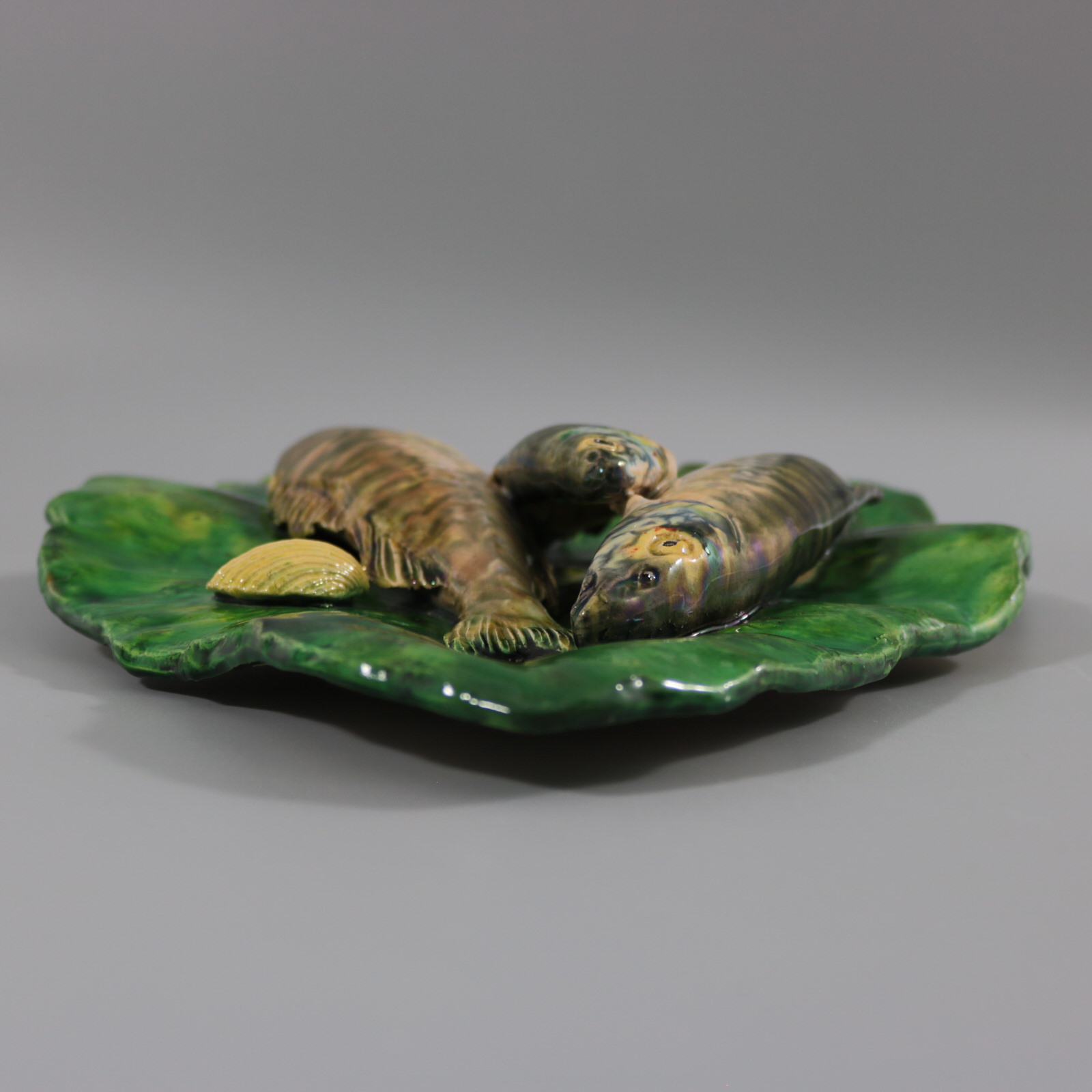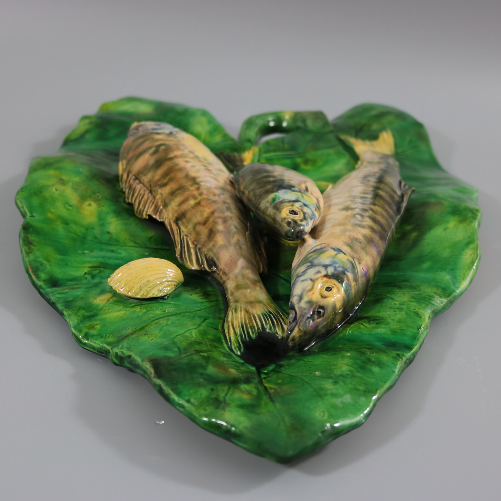 Circa 1890. 17.1ins high, 11.6ins wide, 2.2ins depth. Alfred Renoleau French Palissy Majolica wall plaque which features three overlapping fish laid onto a large leaf.