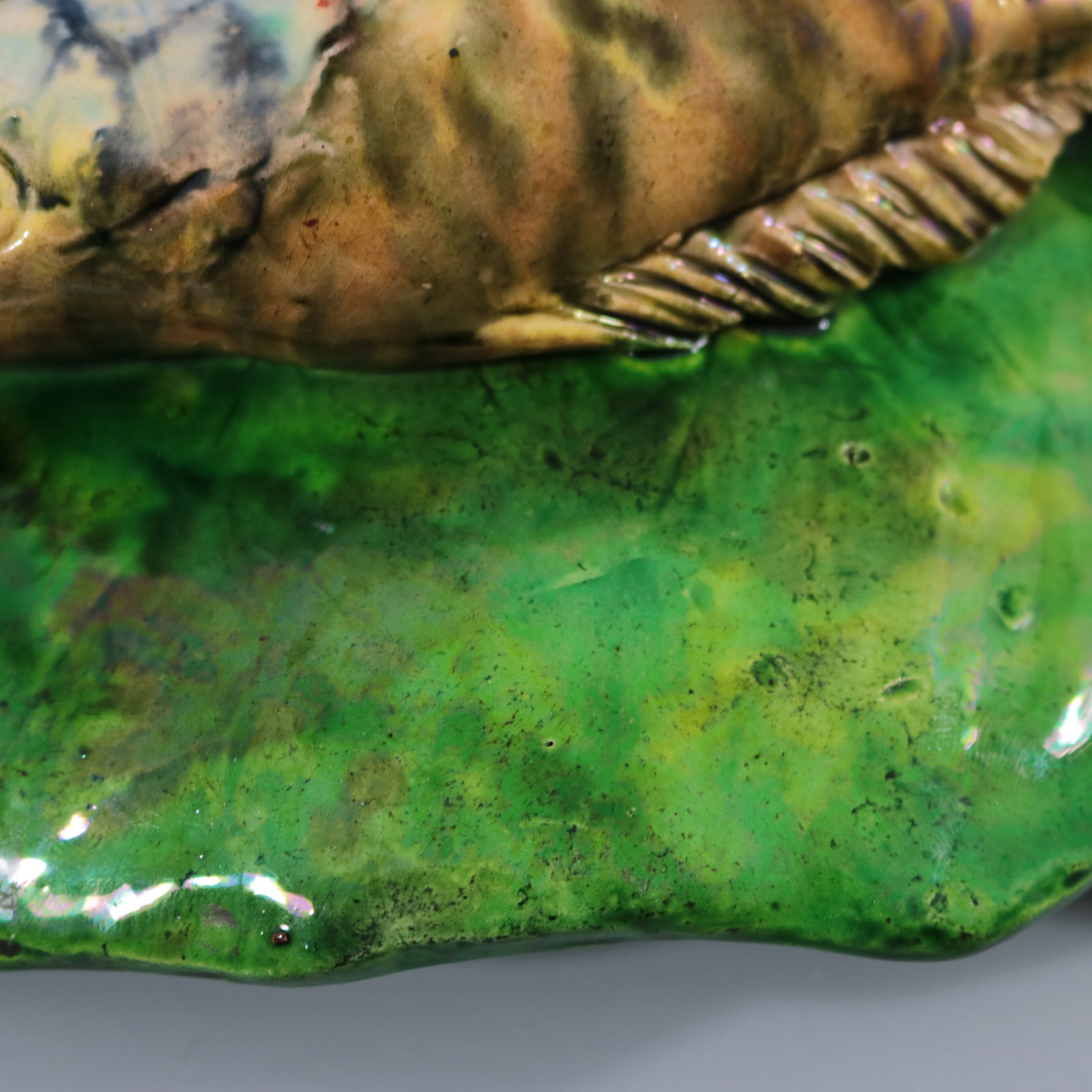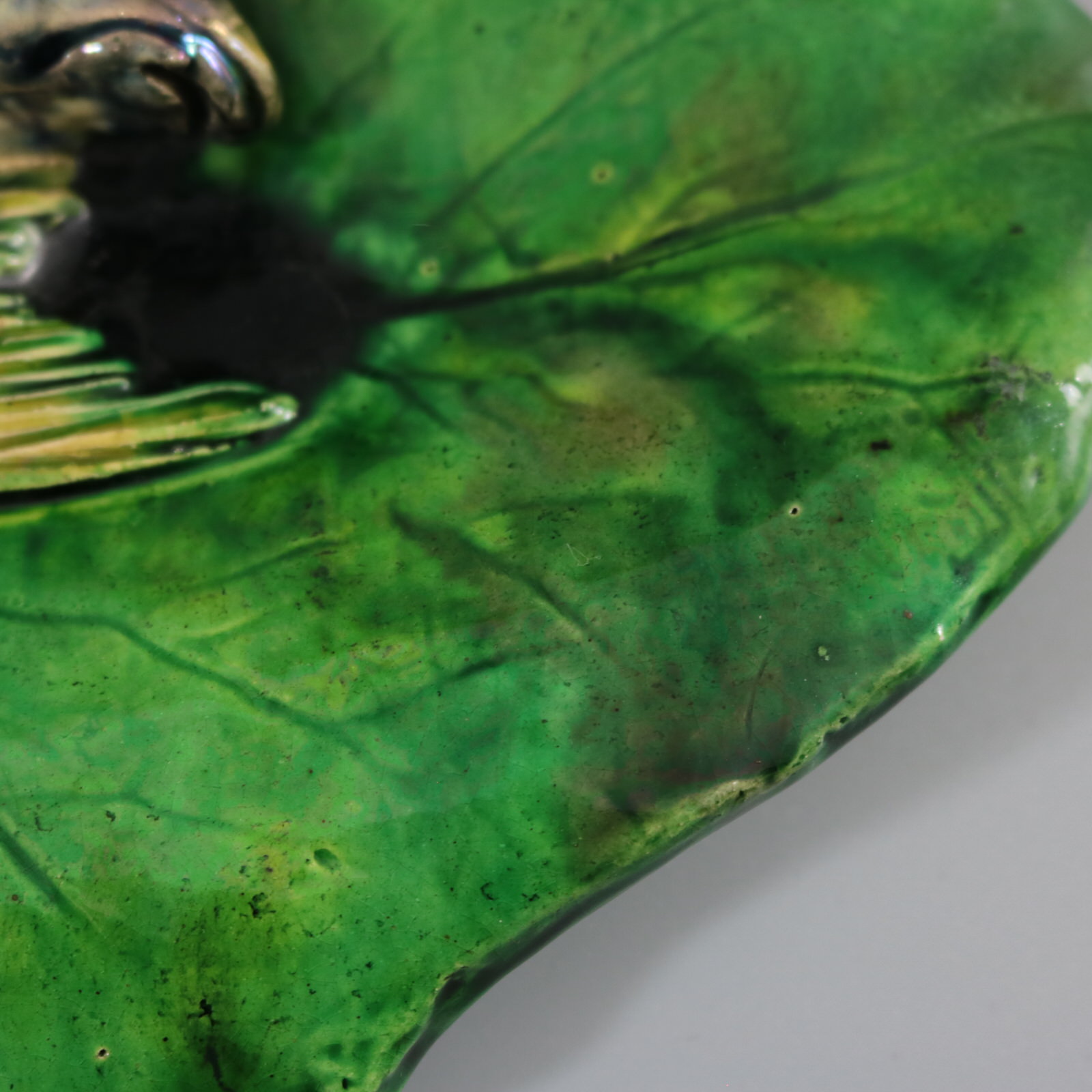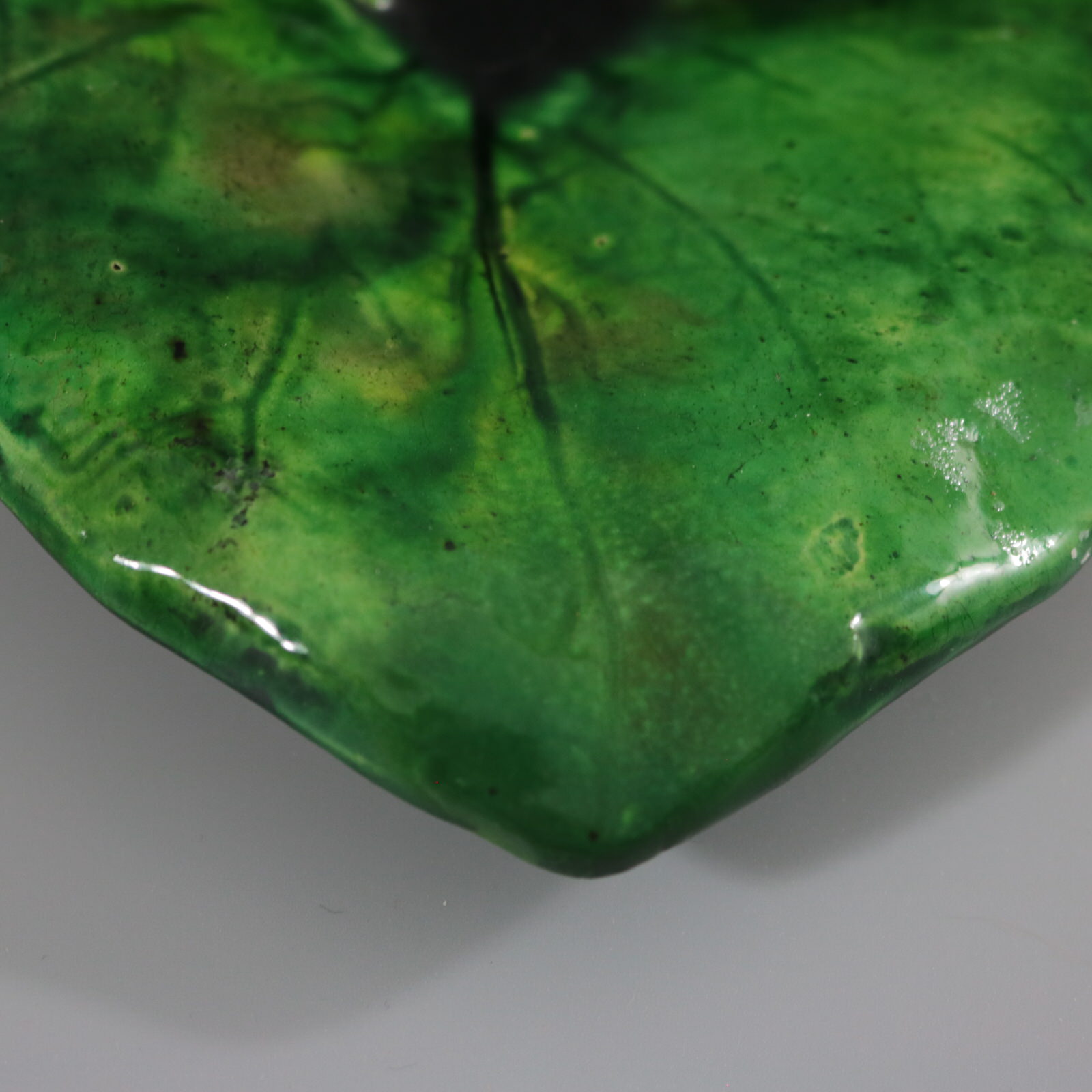 patches of stray coloured glaze to the leaf.