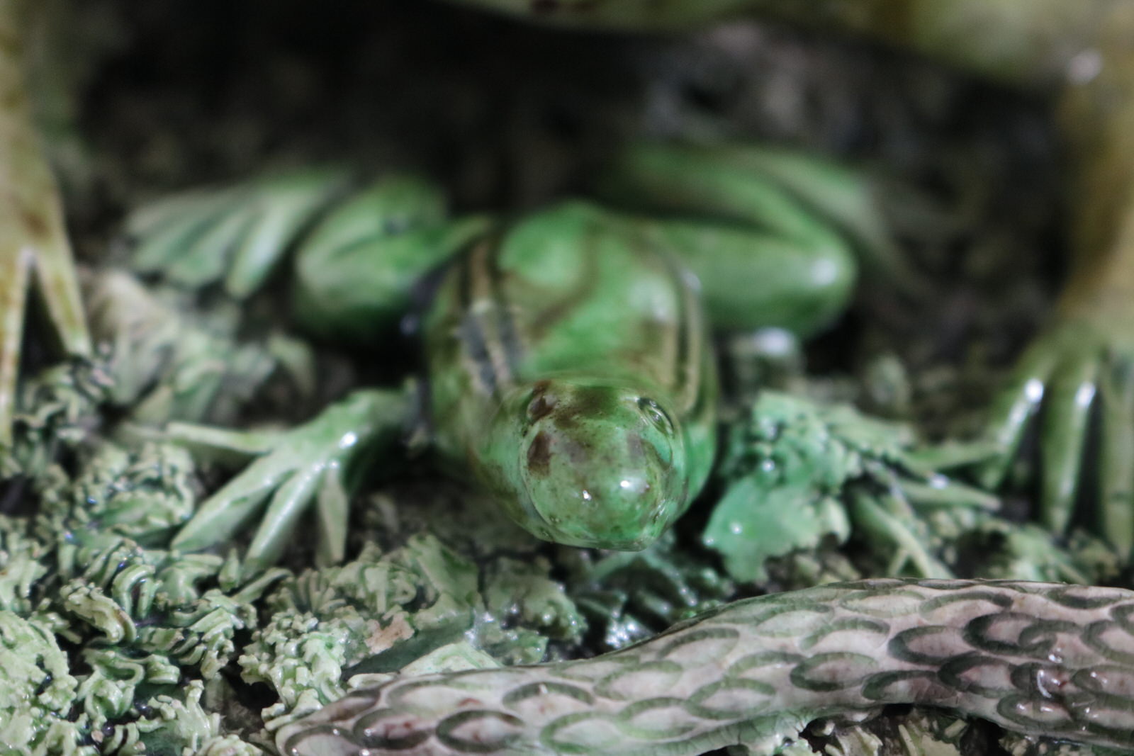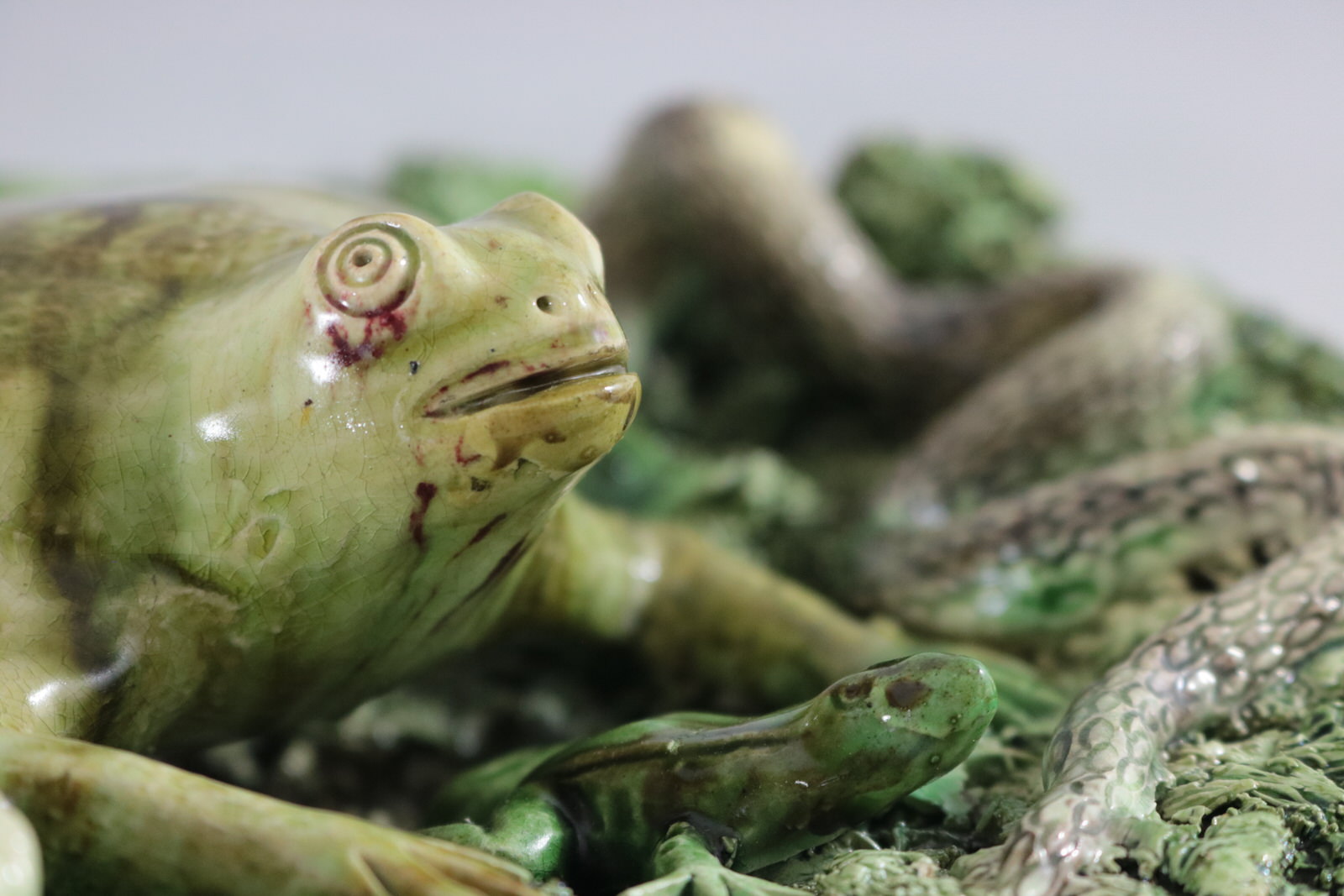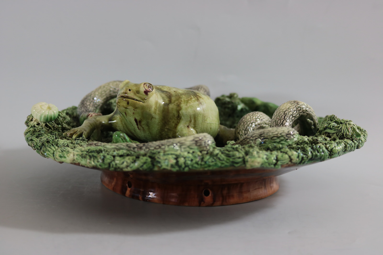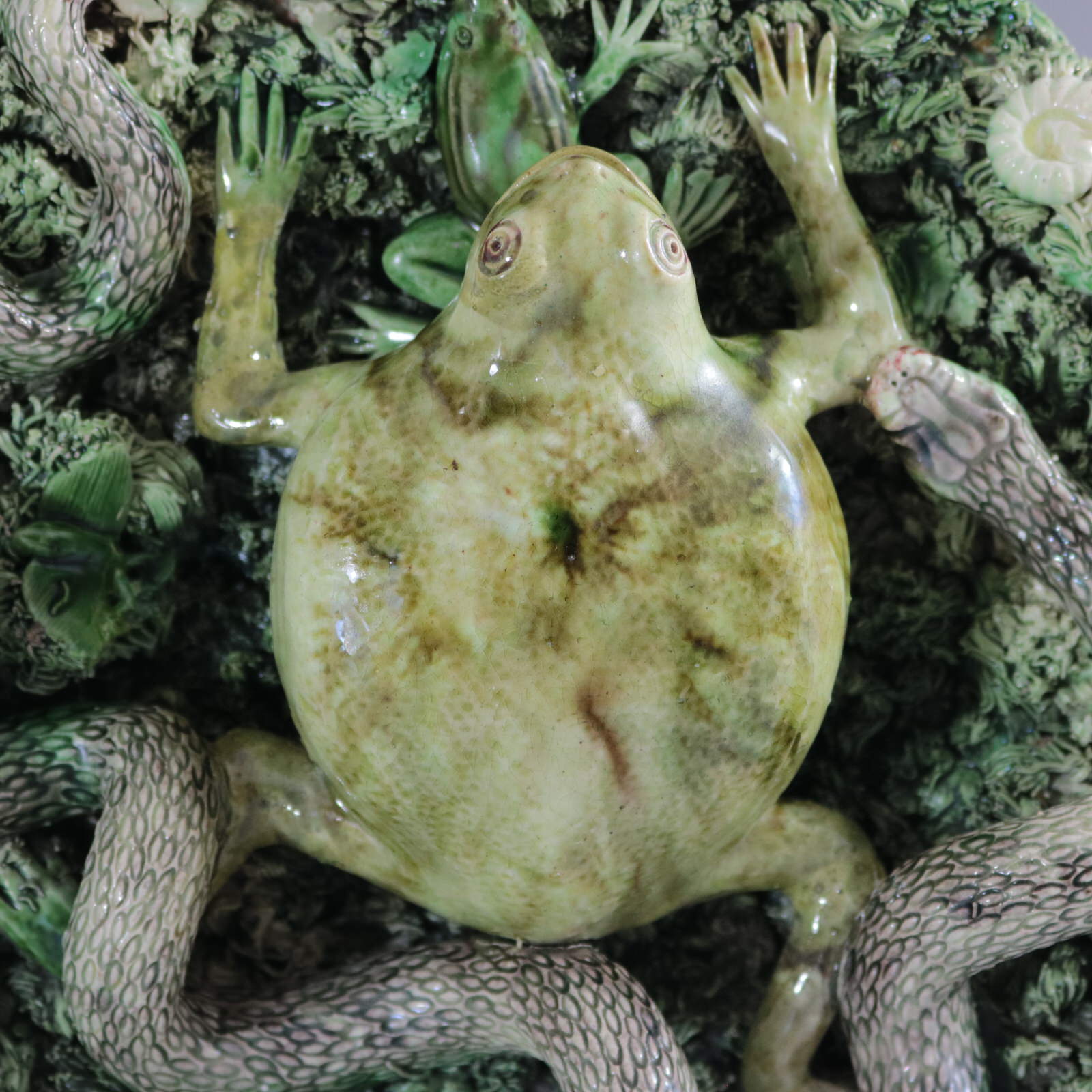 Circa 1890. 11.2ins high, 11.2ins wide, 3.2ins depth. Jose A Cunha Portuguese Palissy Majolica wall plate which features a large, puffed-up frog (or toad) in the centre. Surrounded by a snake, a frog, moths, a lizard and a worm.