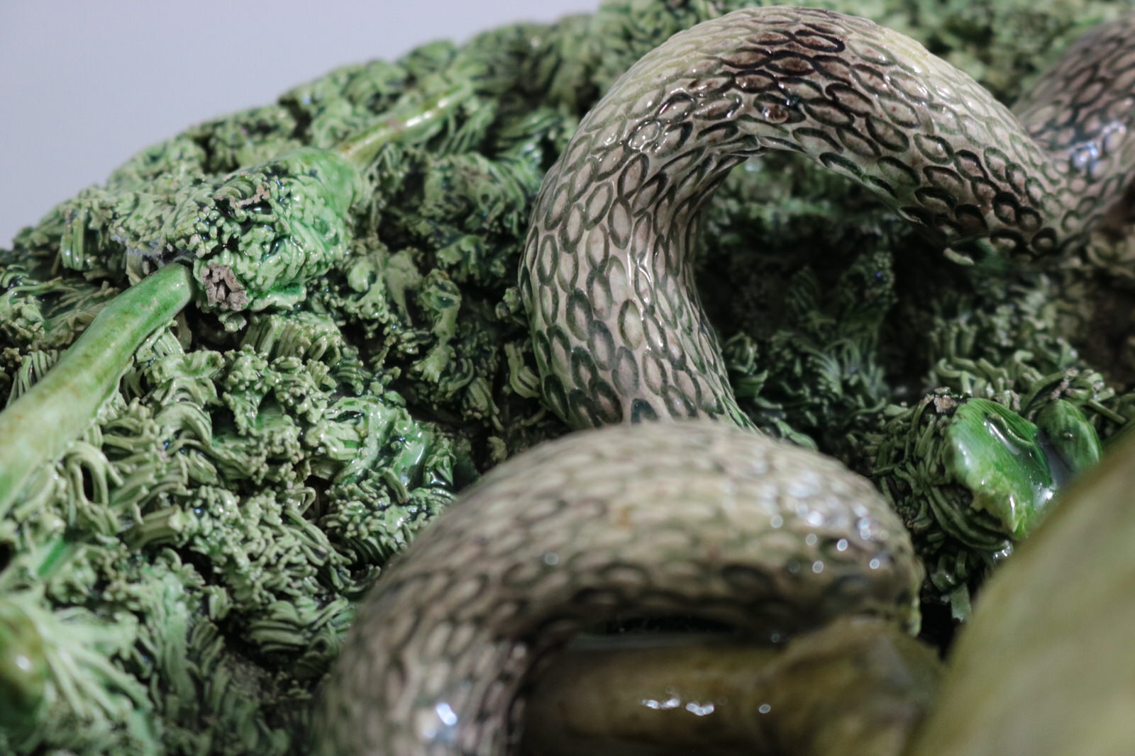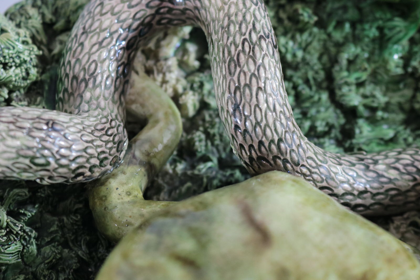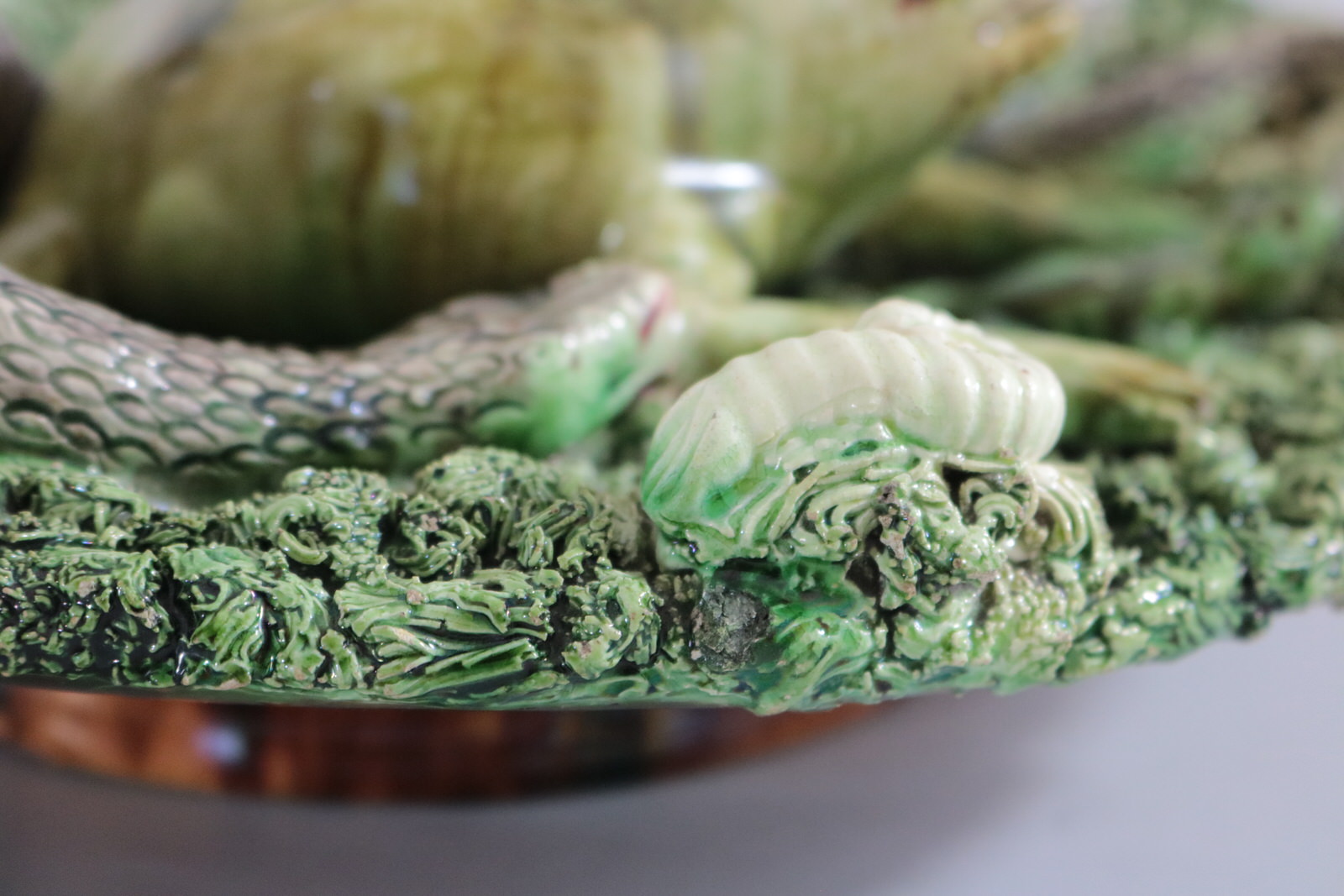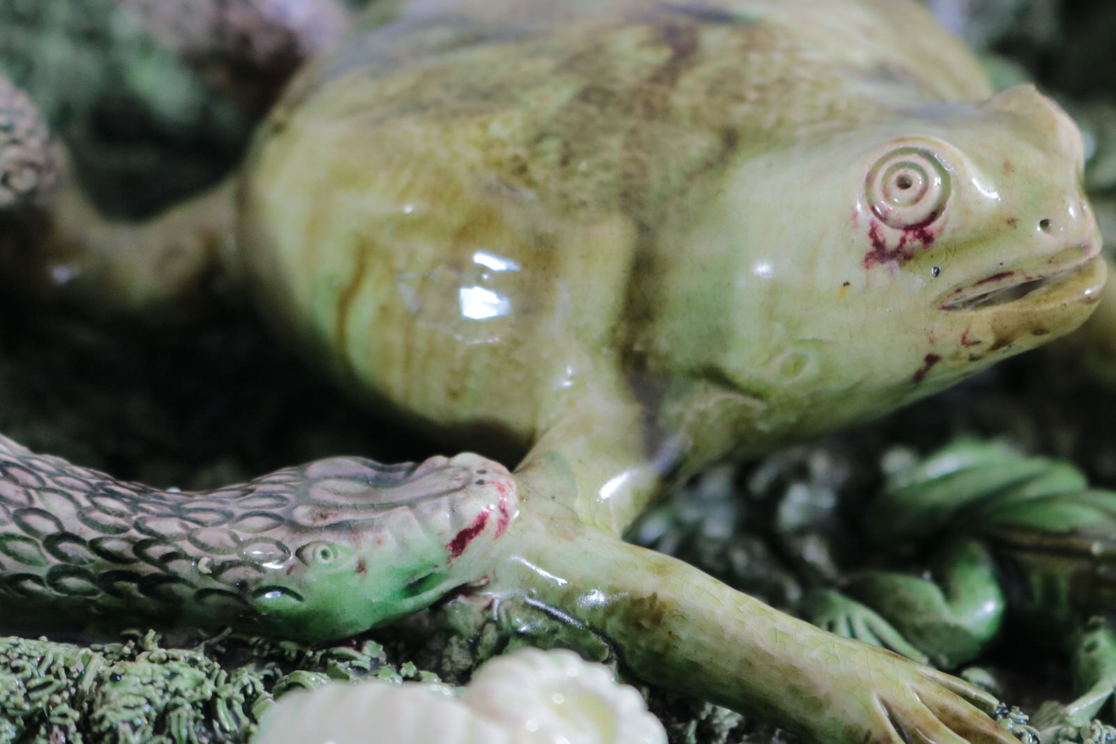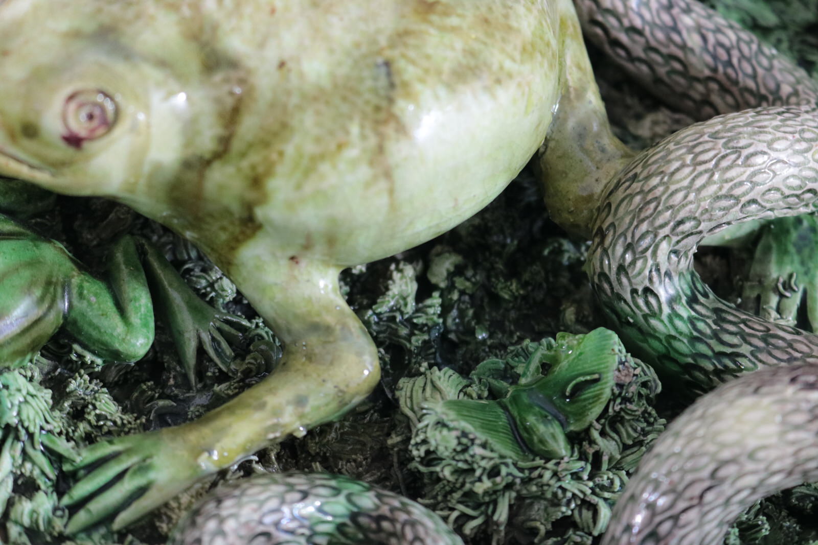 Circa 1890. 11.2ins high, 11.2ins wide, 3.2ins depth. Jose A Cunha Portuguese Palissy Majolica wall plate which features a large, puffed-up frog (or toad) in the centre. Surrounded by a snake, a frog, moths, a lizard and a worm.