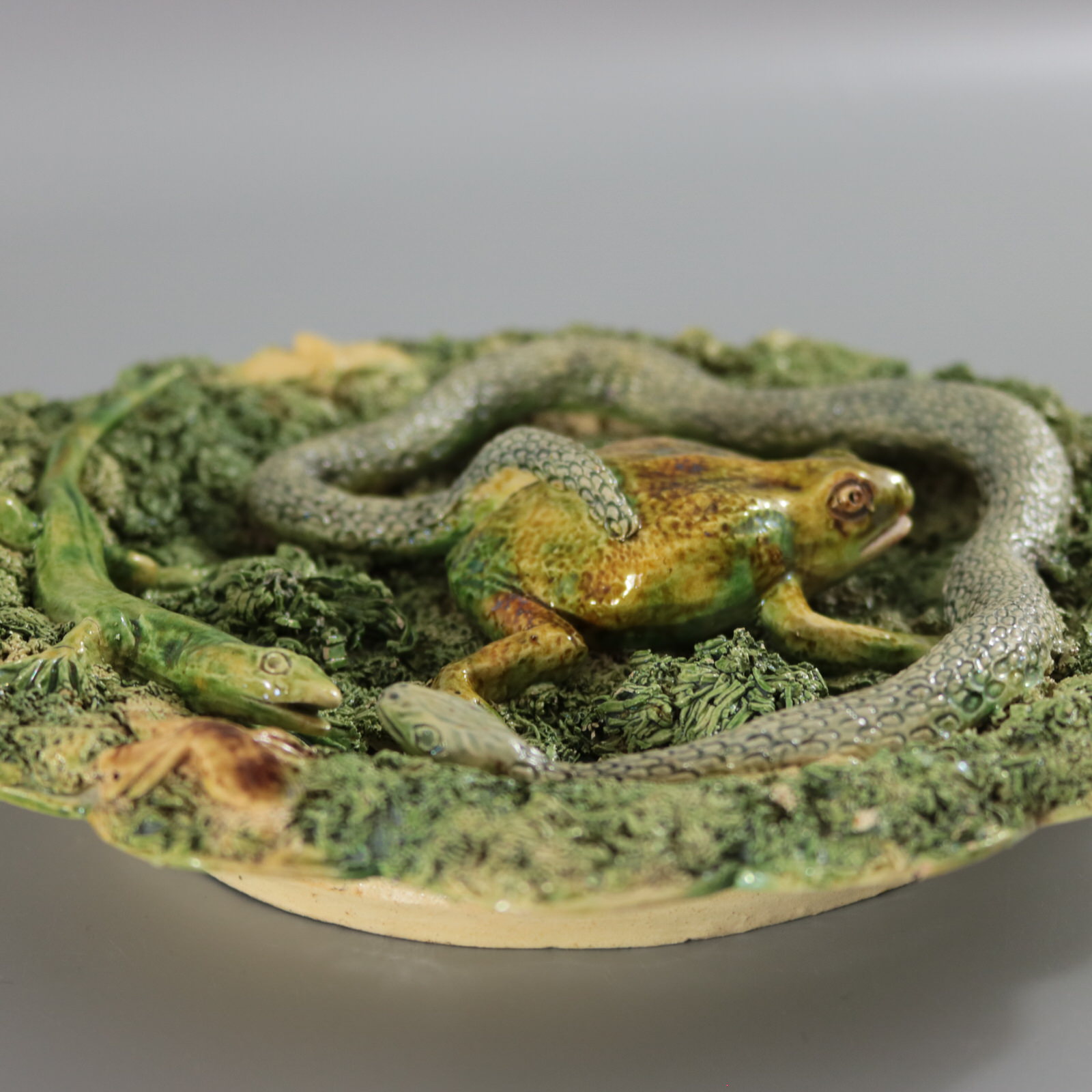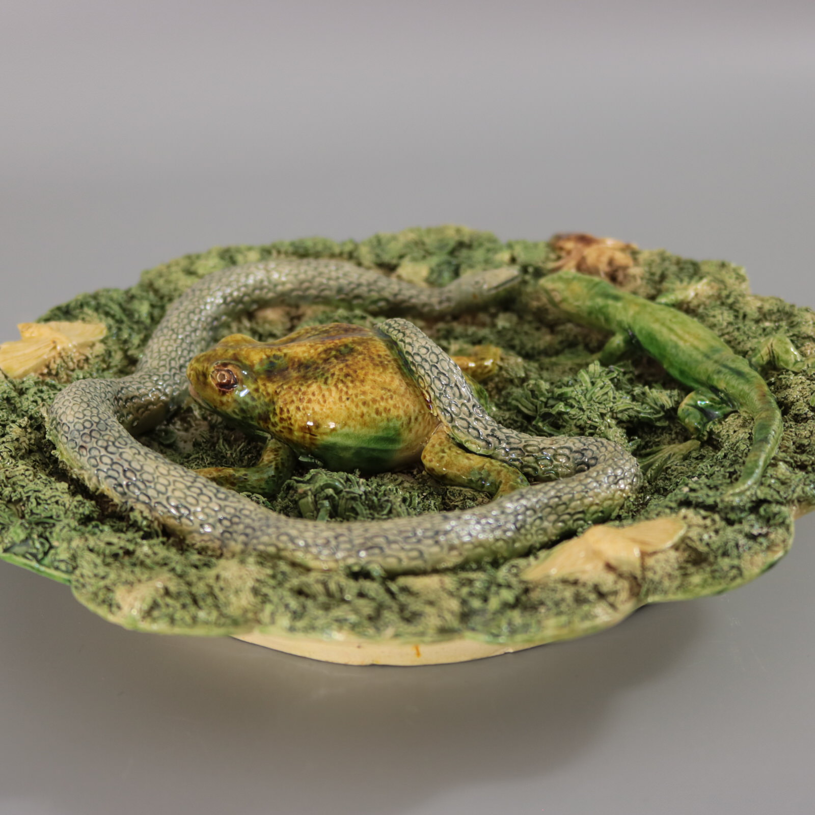 Circa 1890. 8.7ins high, 8.7ins wide, 1.4ins depth. Jose A Cunha Portuguese Palissy Majolica wall plate which features a frog, snake, lizard, beetle and moths. Scalloped rim.