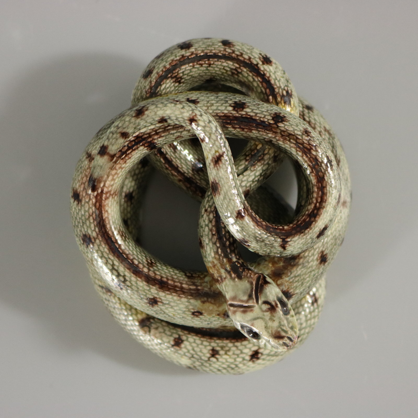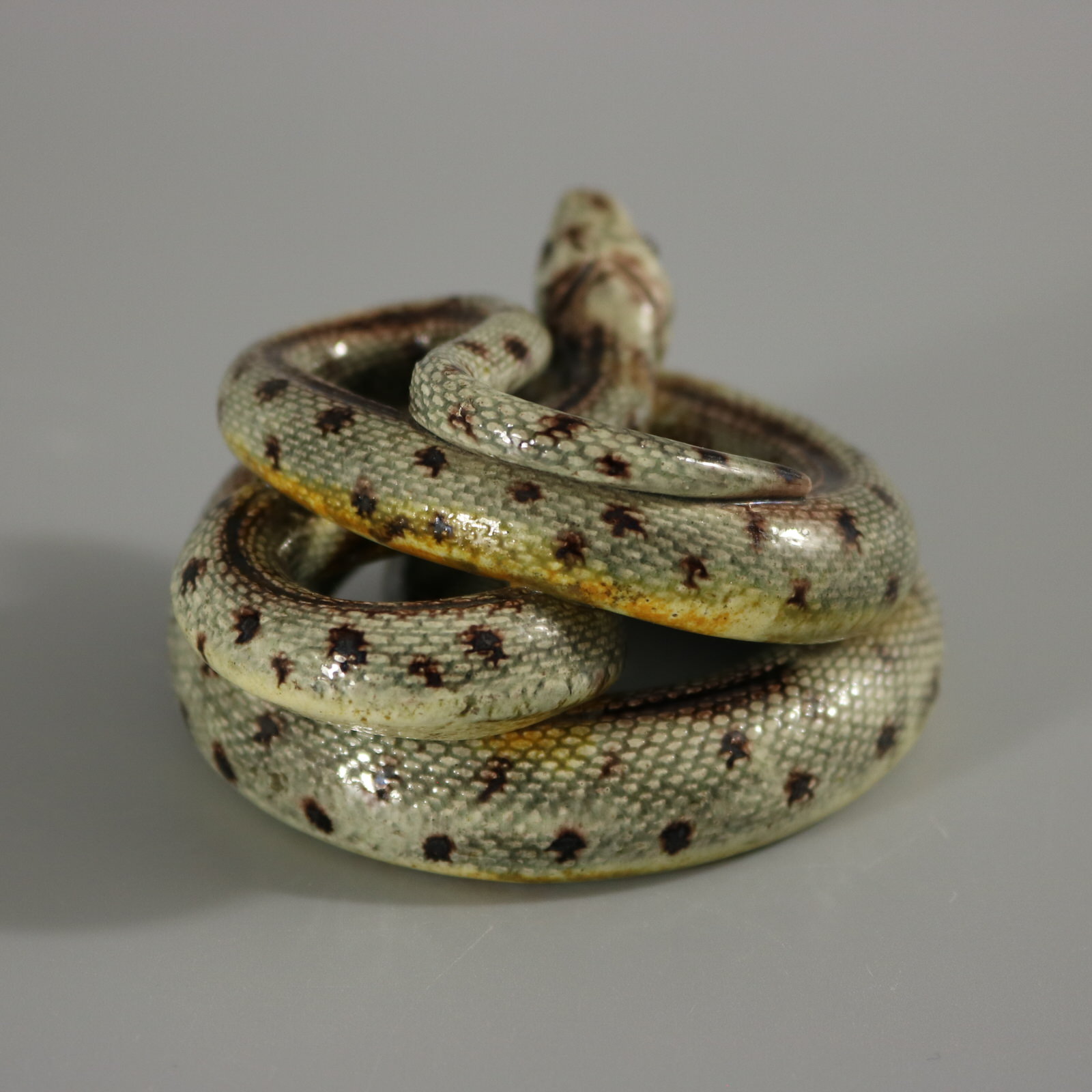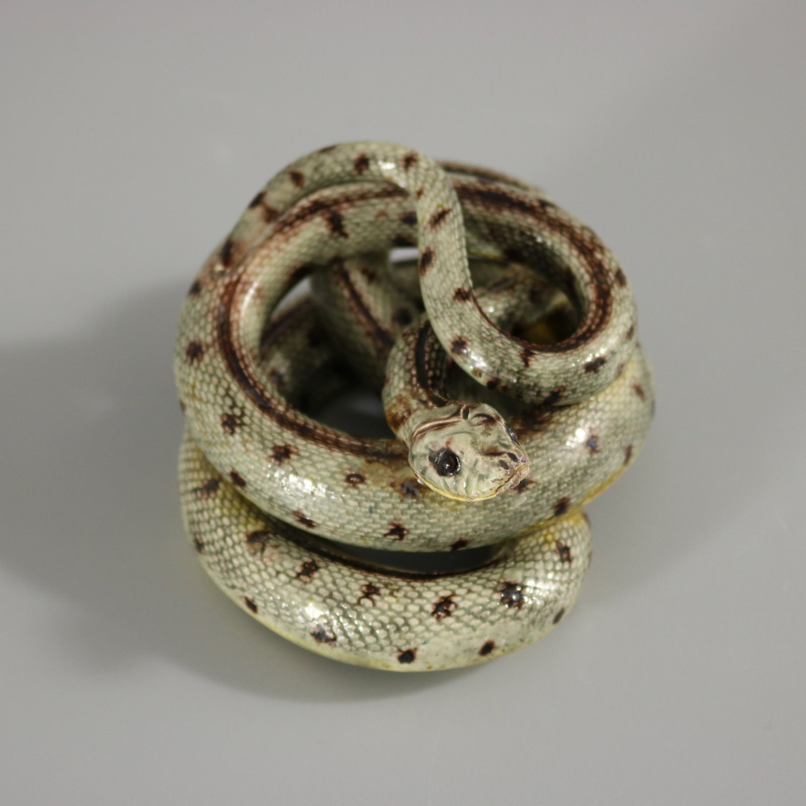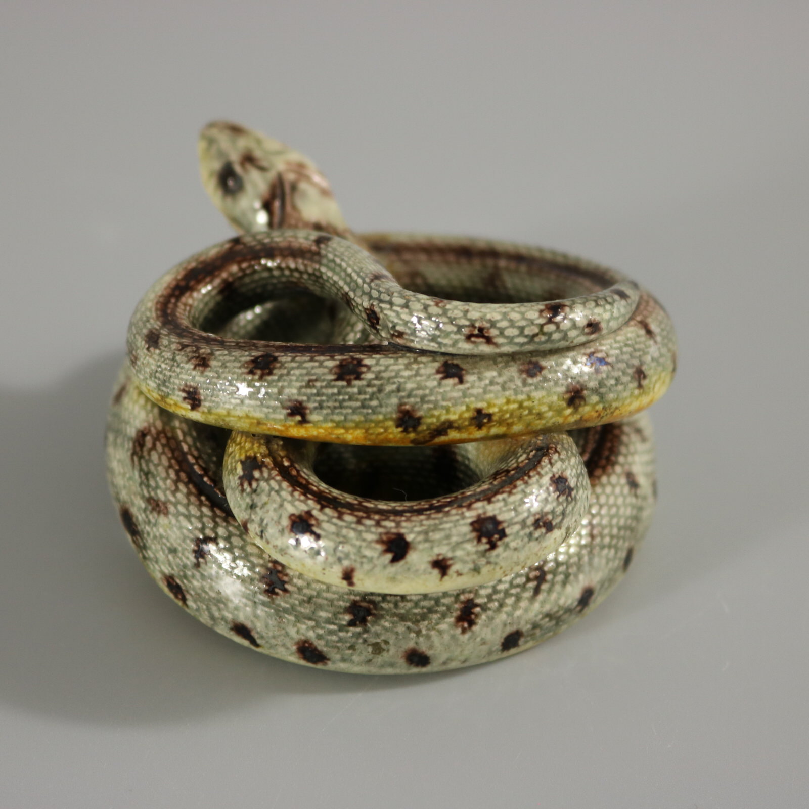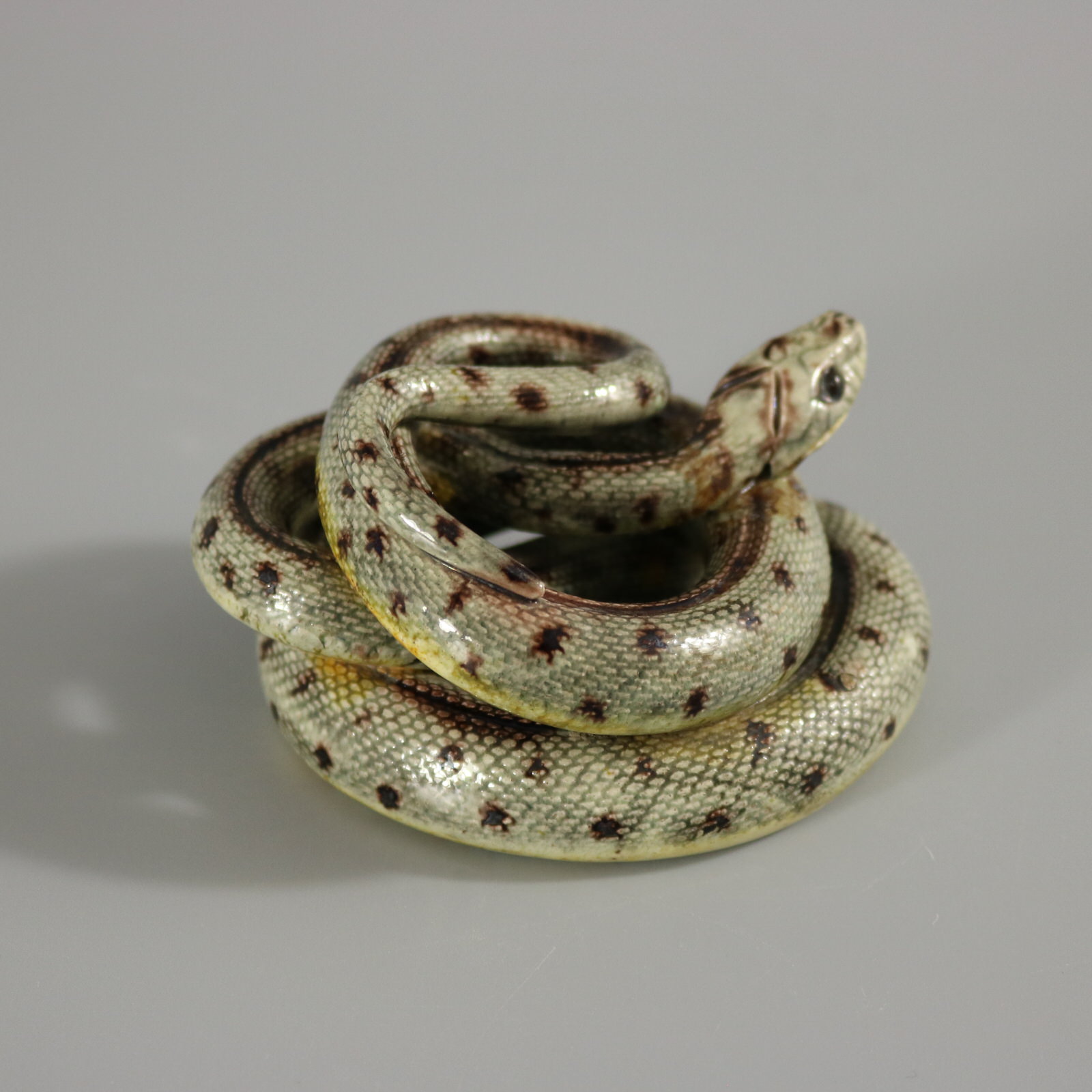 Circa 1880. 1.8ins high, 2.8ins wide, 3.3ins depth. French French Palissy Majolica figure which features a coiled snake.