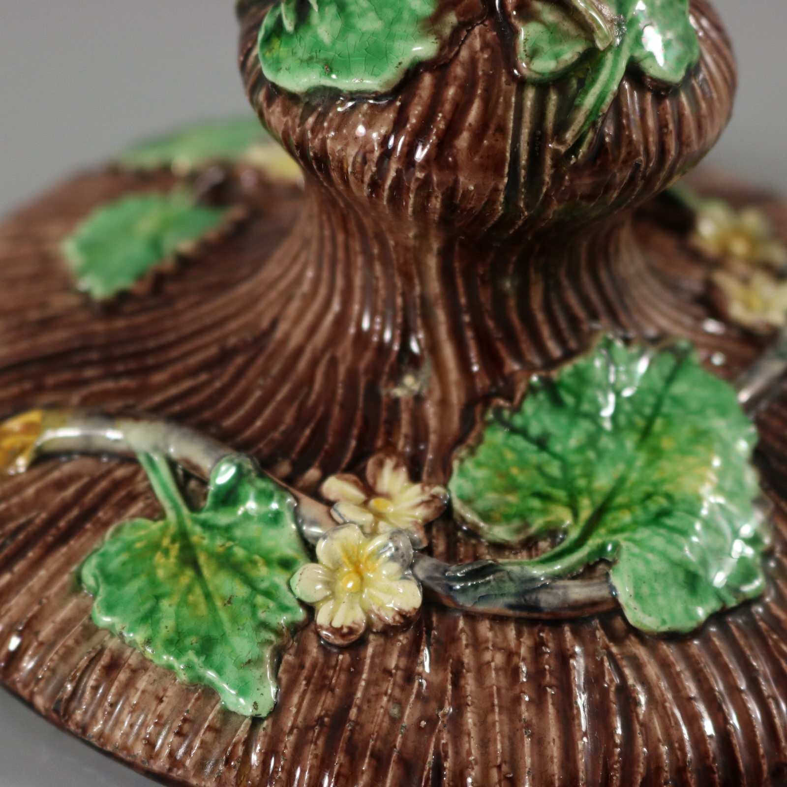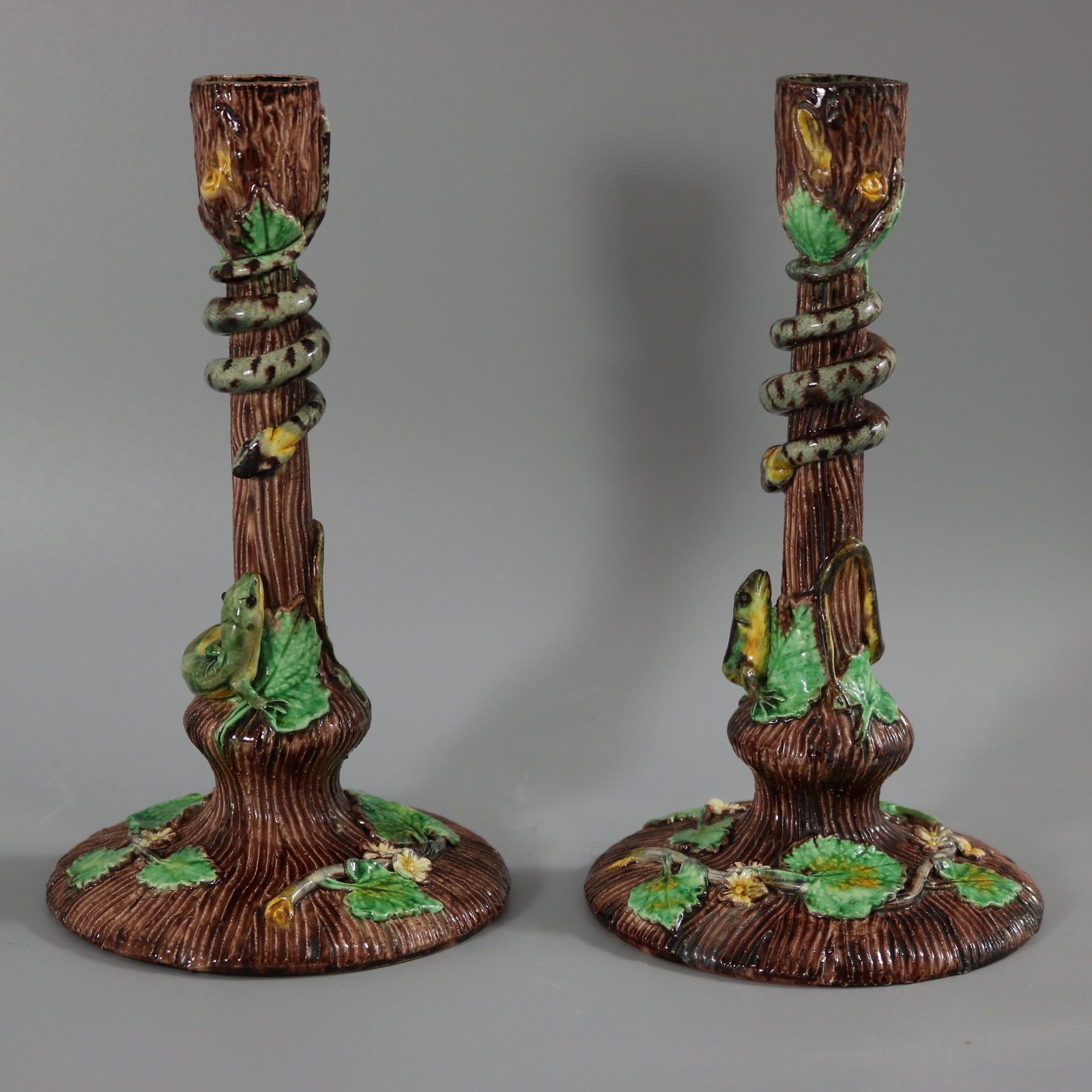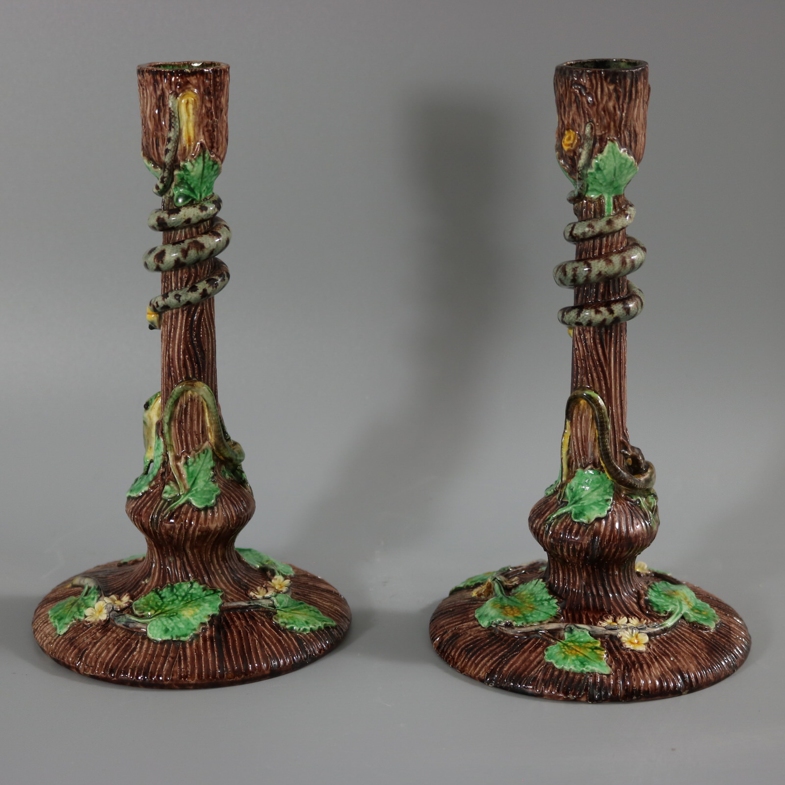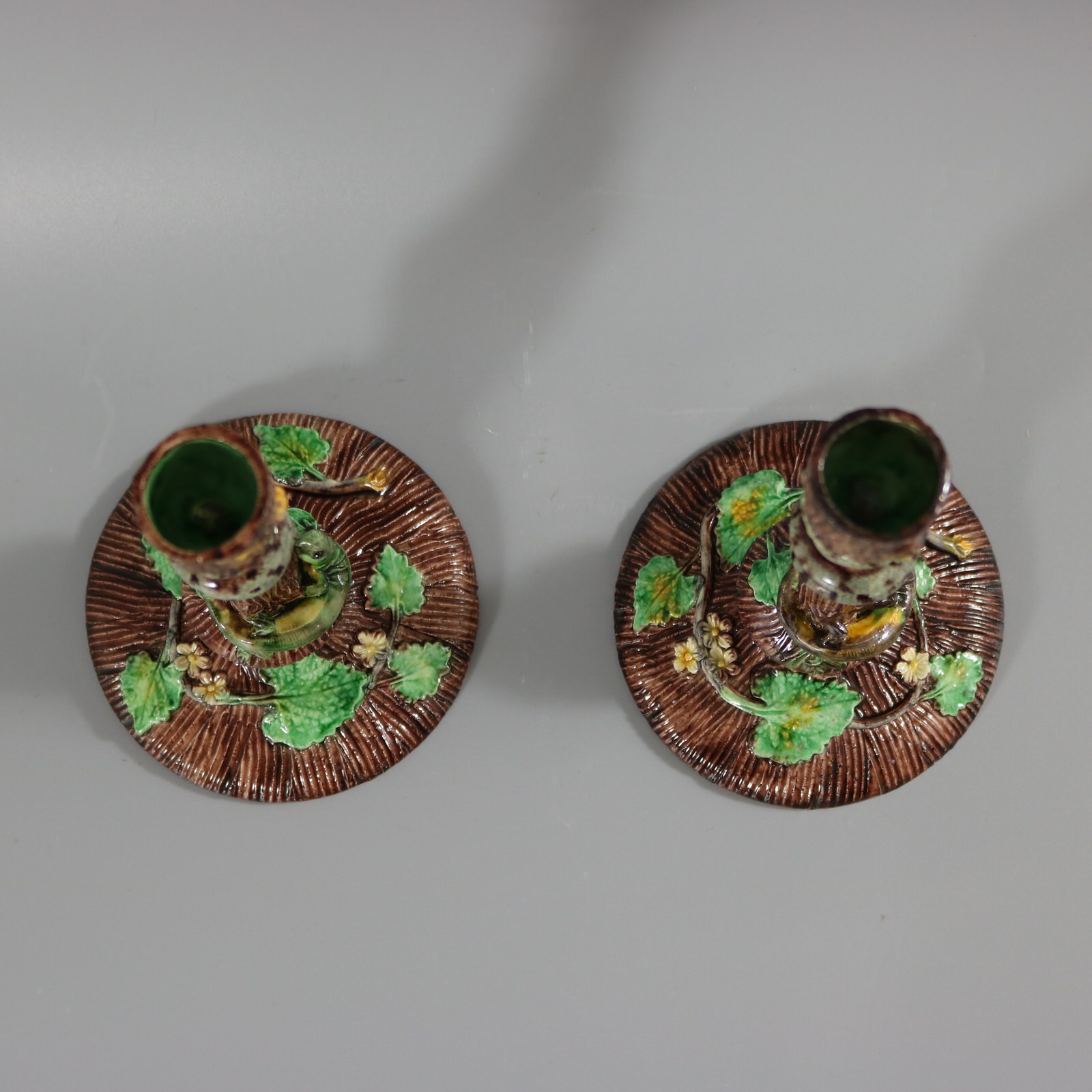 Circa 1875. Tallest is 8.5ins high, 4.7ins wide, 4.7ins depth. Pair of Thomas Sergent French Palissy Majolica candlesticks which feature blossom and leaves around the base.