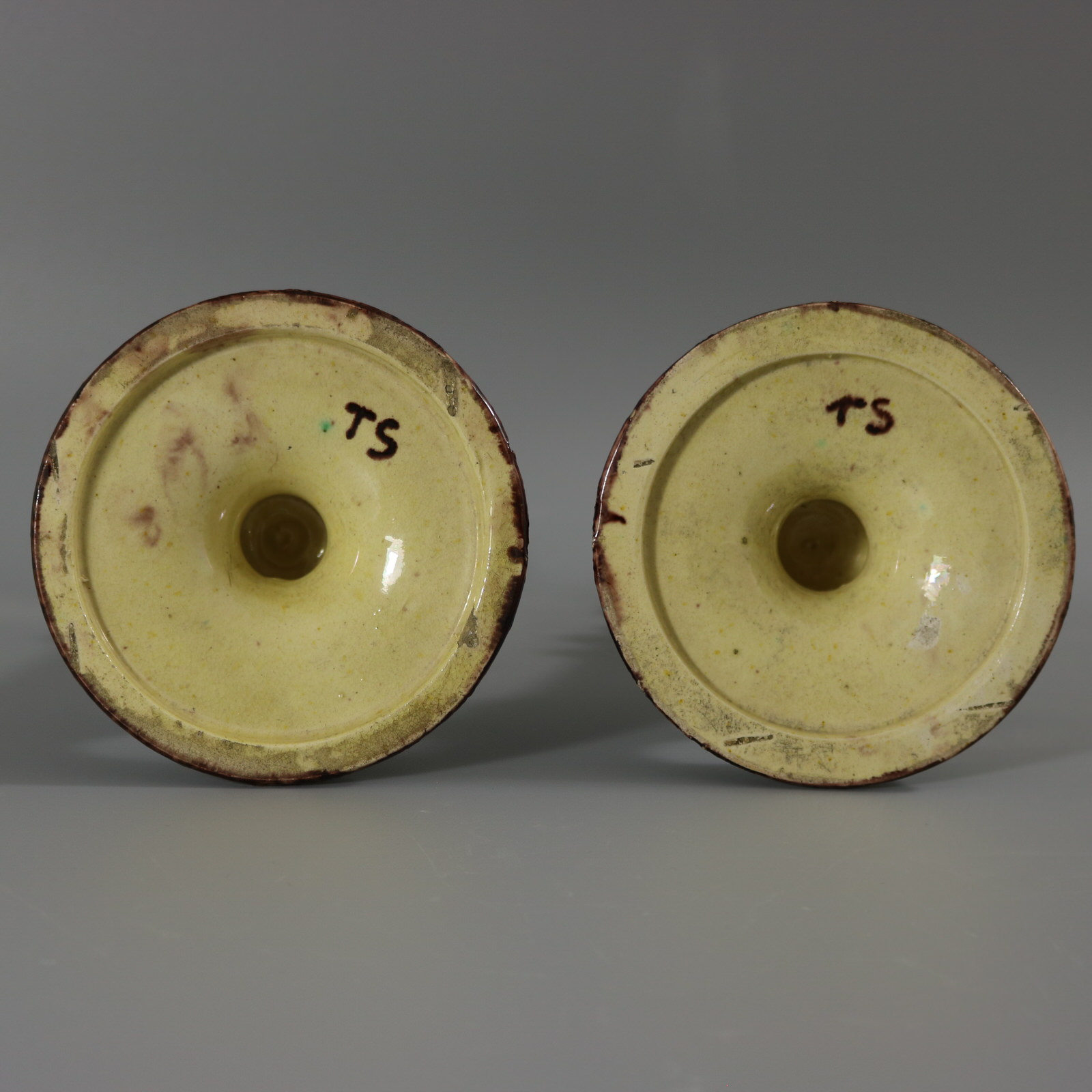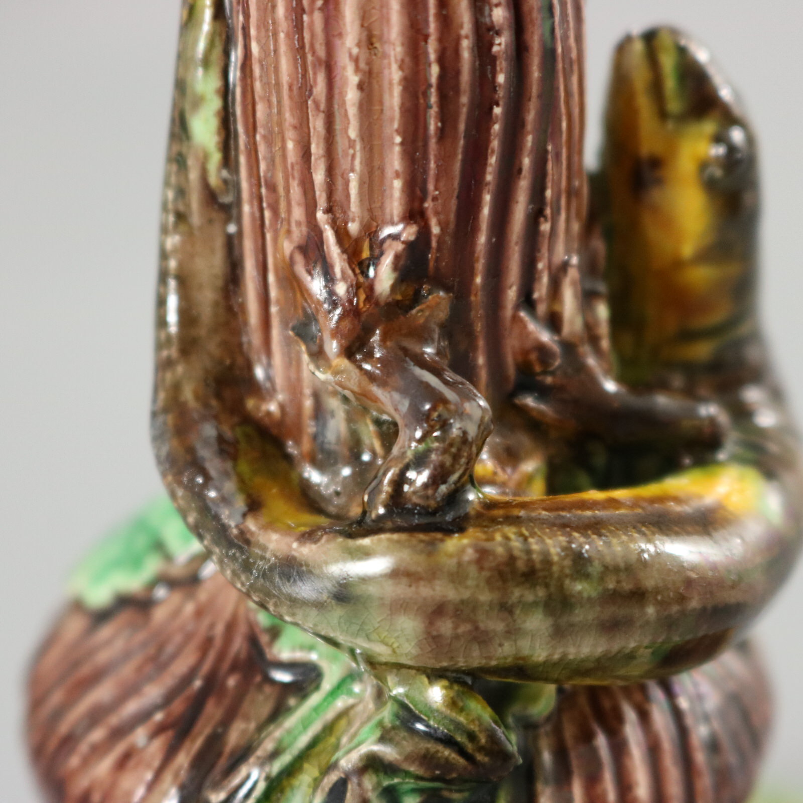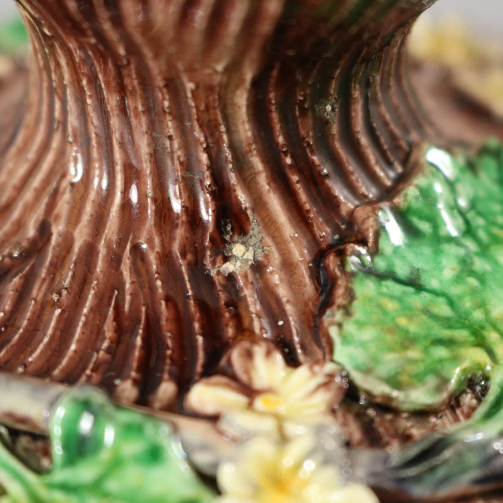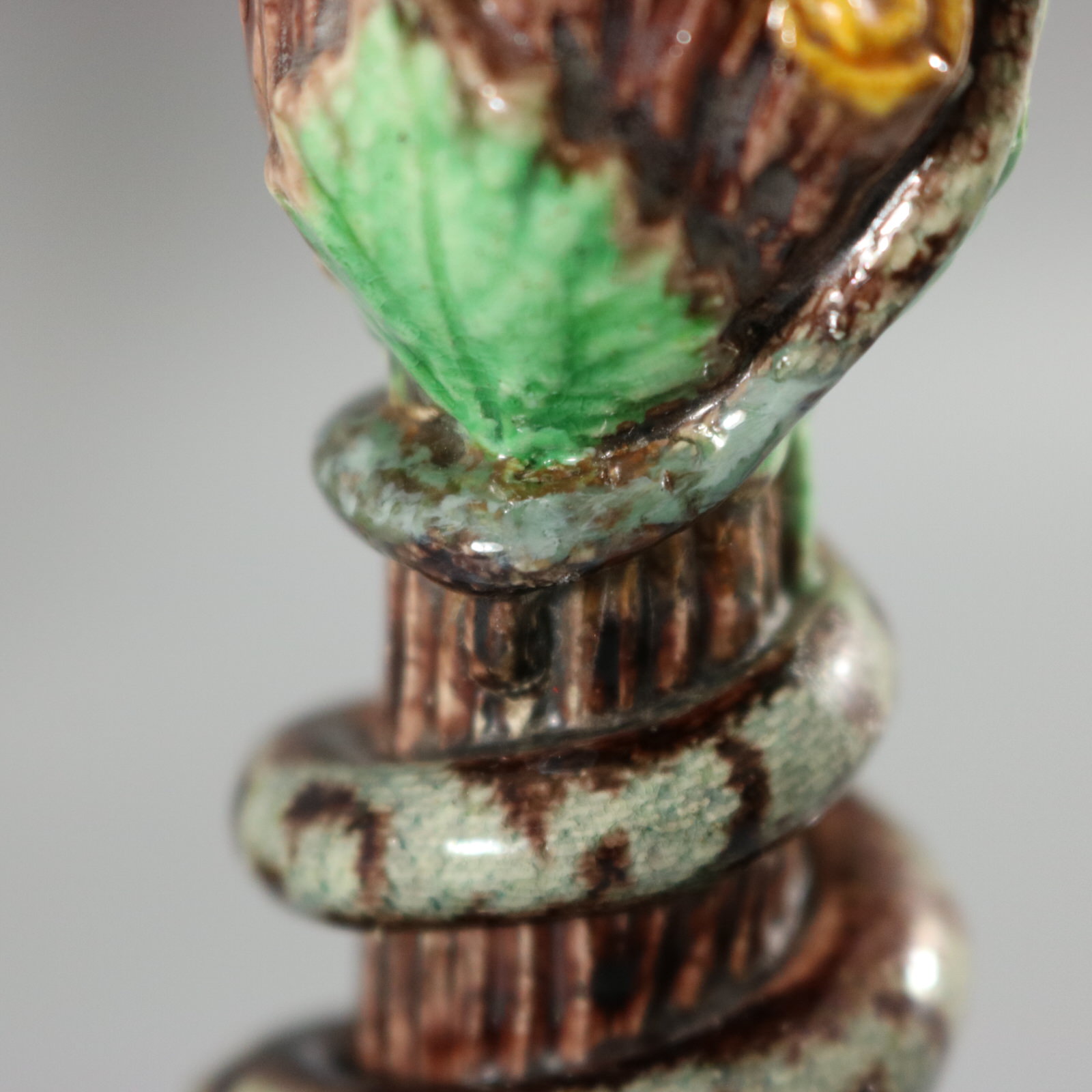 Circa 1875. Tallest is 8.5ins high, 4.7ins wide, 4.7ins depth. Pair of Thomas Sergent French Palissy Majolica candlesticks which feature blossom and leaves around the base.