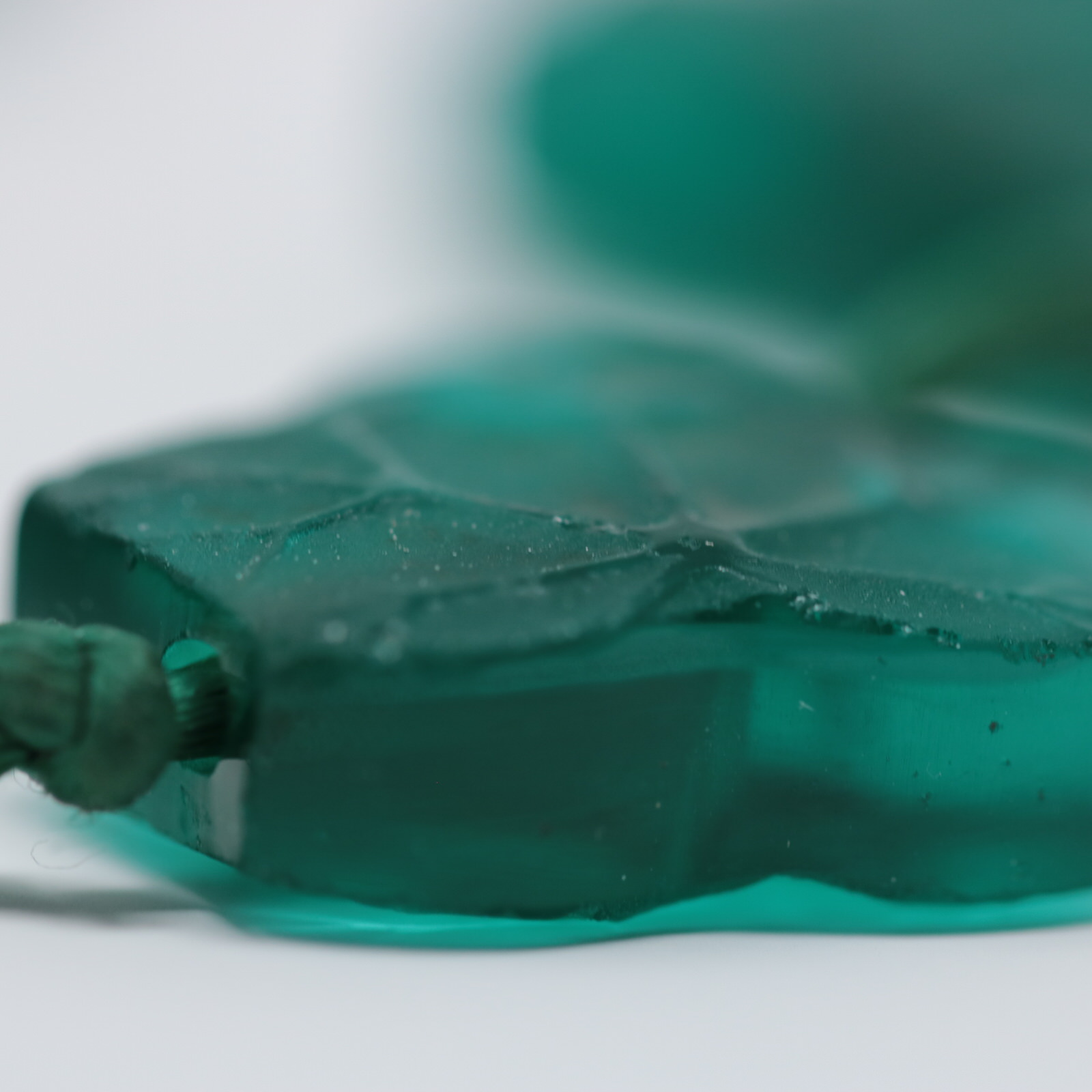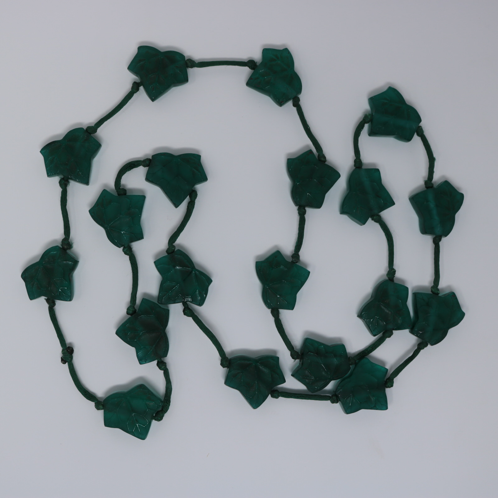 Necklace features 19 green glass ivy leaves, strung onto a silk cord.