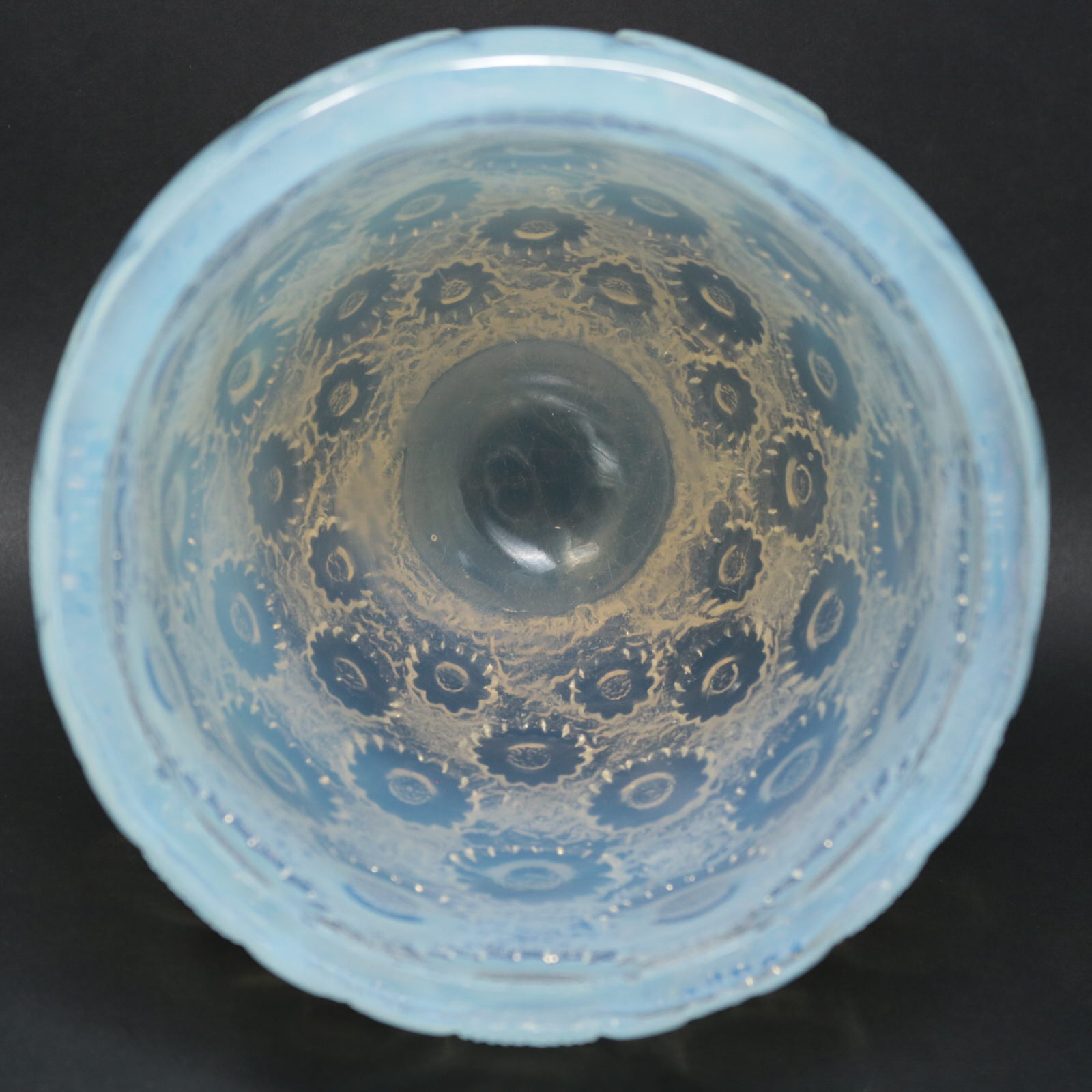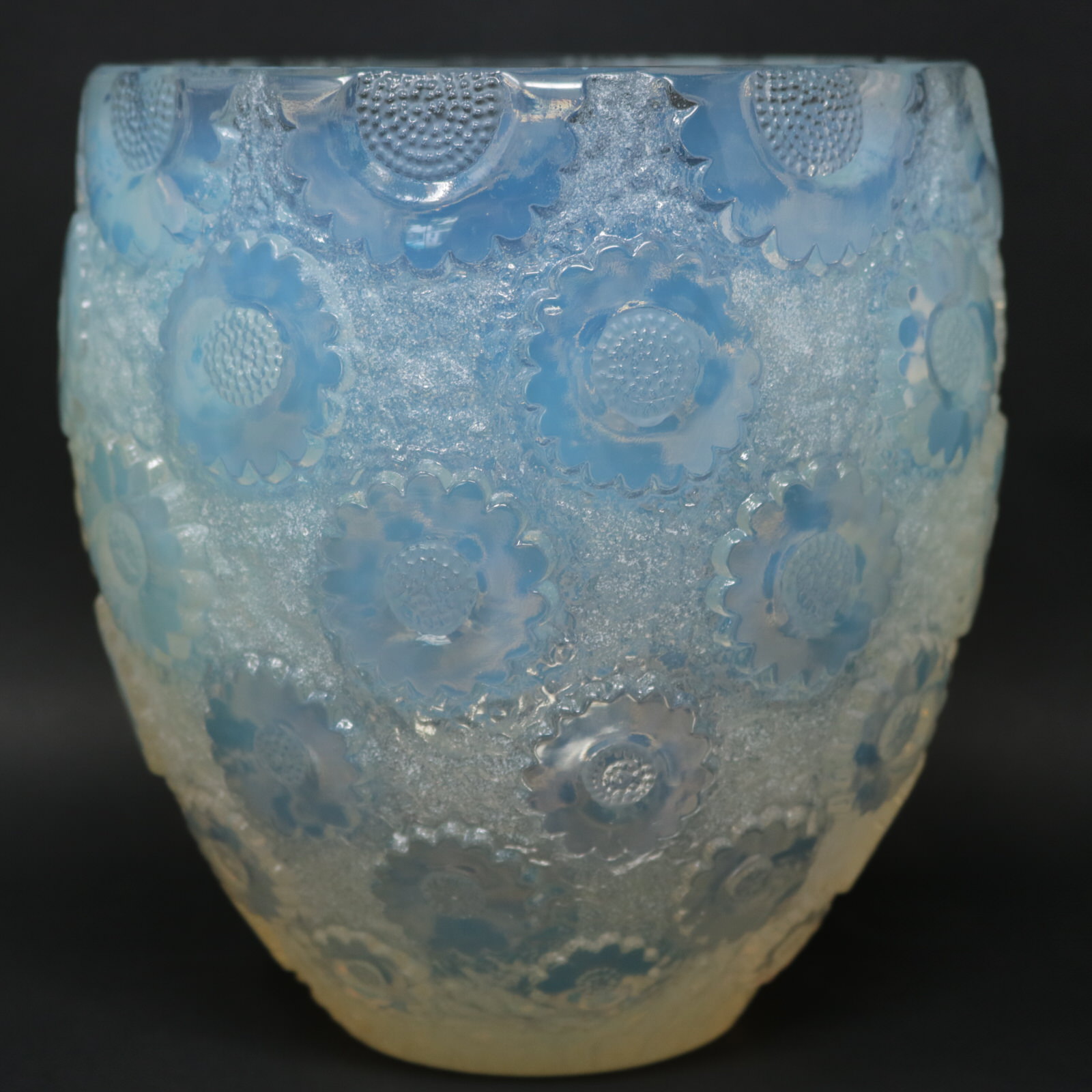 Introduced in 1934. Height: 18.3cm (7.2ins). Diameter: 16.5cm (6.5ins). Rene Lalique opalescent glass 'Paquerettes' vase.