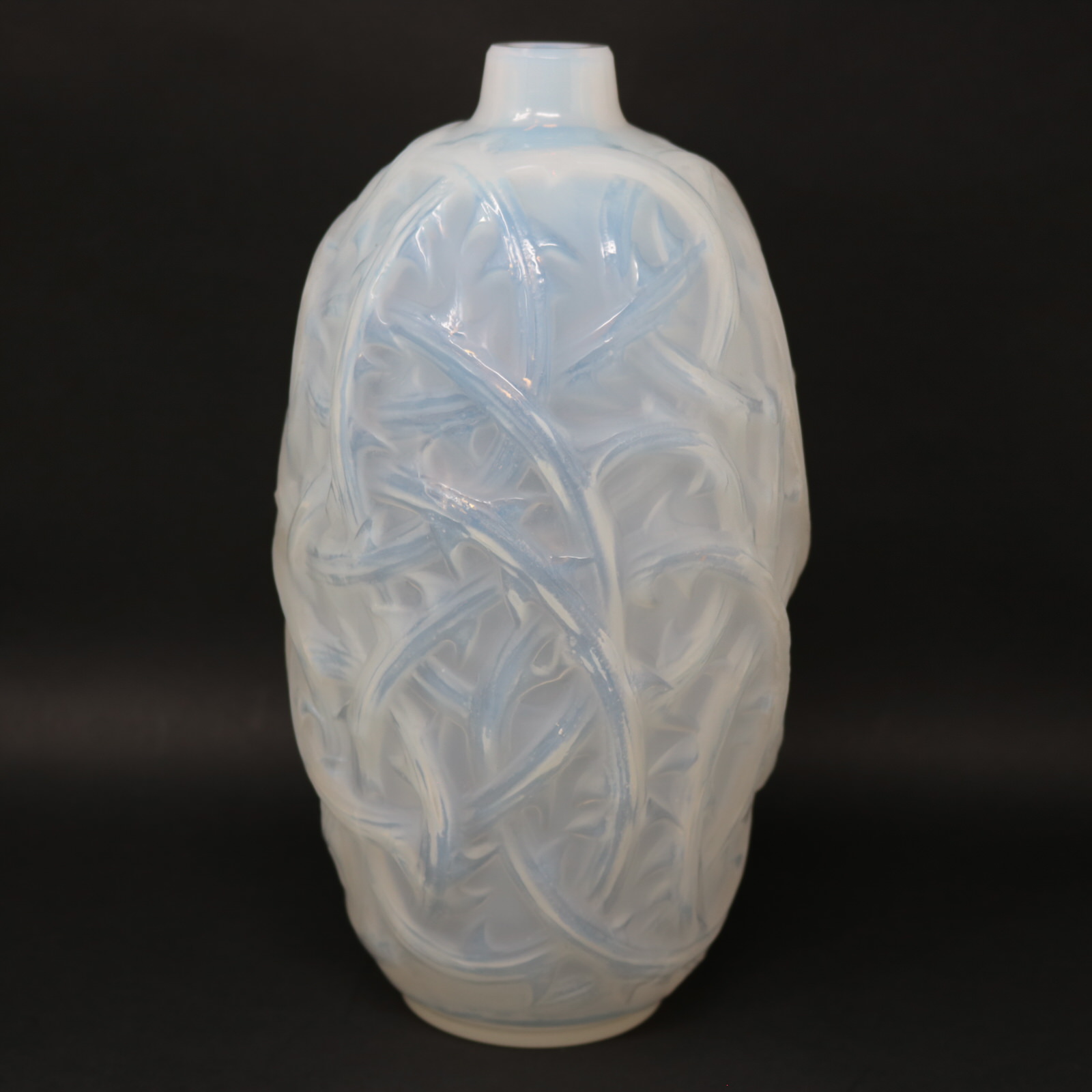 Introduced in 1921. Height: 23.4cm (9.21ins). Diameter: 11.5cm (4.53ins). Rene Lalique Opalescent Glass 'Ronces' Vase.