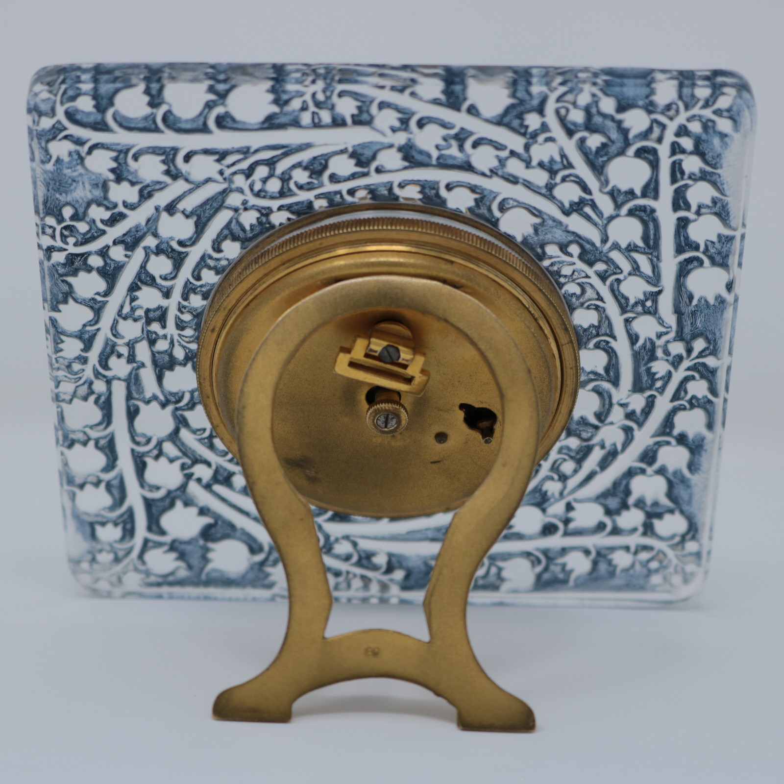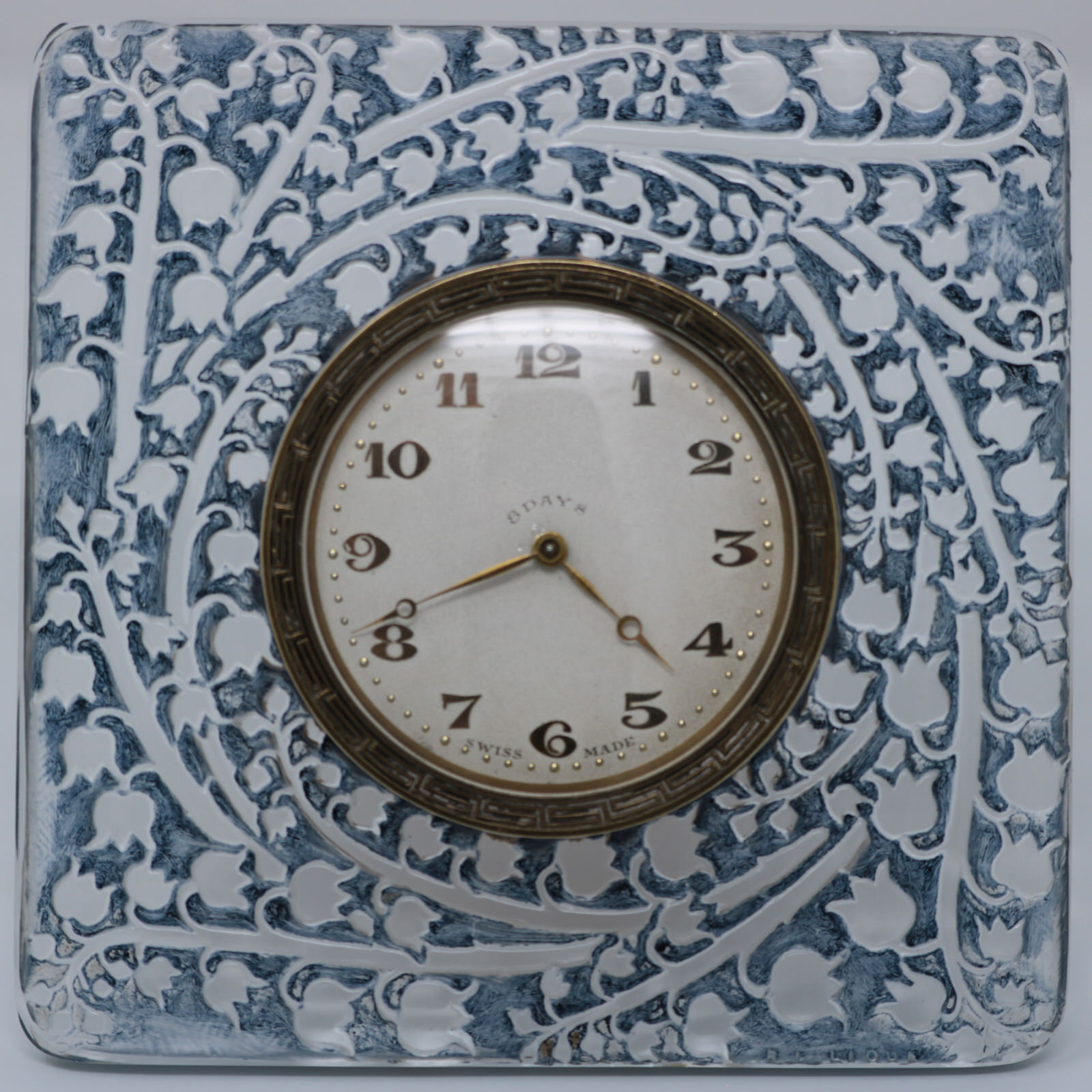 Introduced in 1926. 4ins high, 4ins wide, 0.8ins deep. Rene Lalique clear glass 'Muguet' Clock with blue staining.