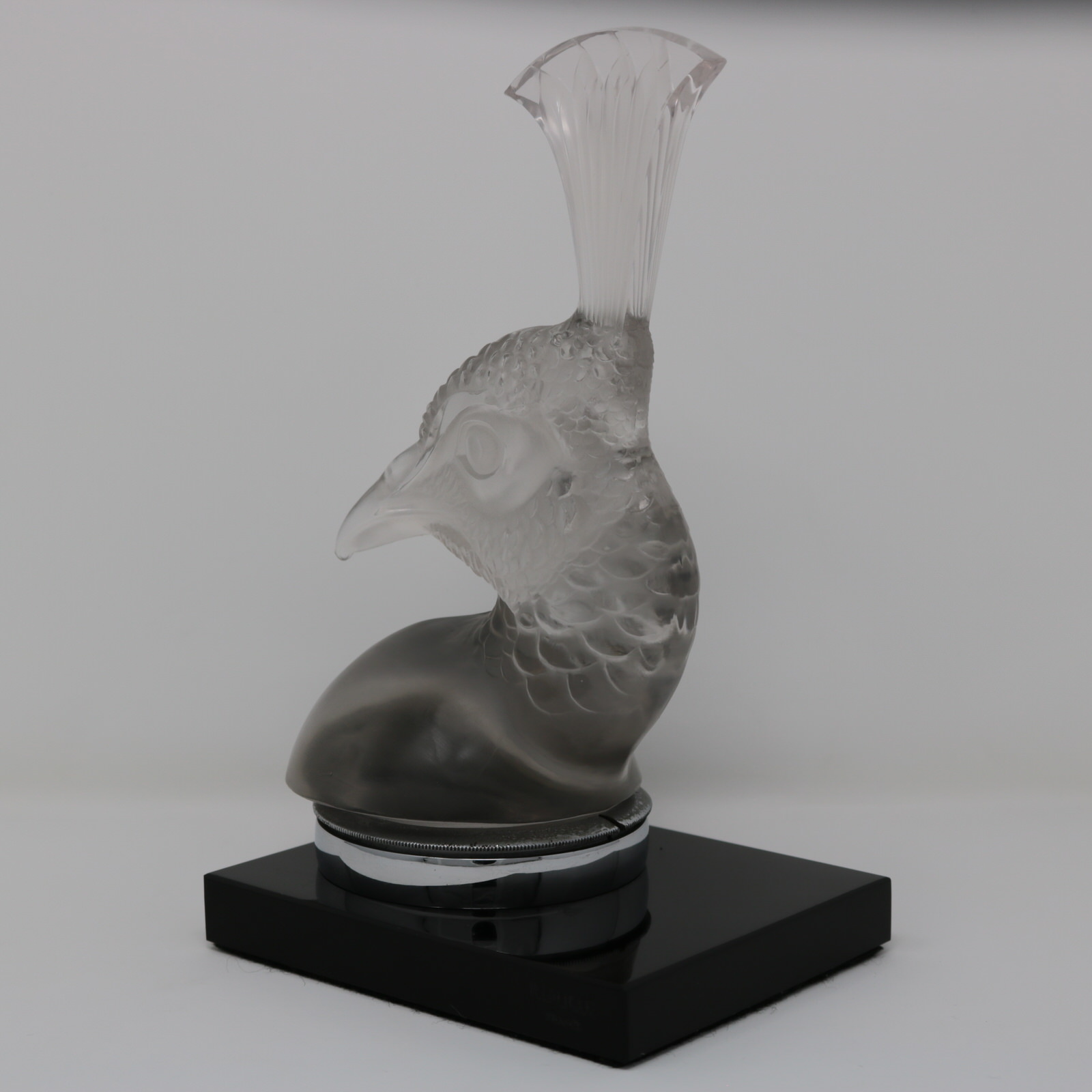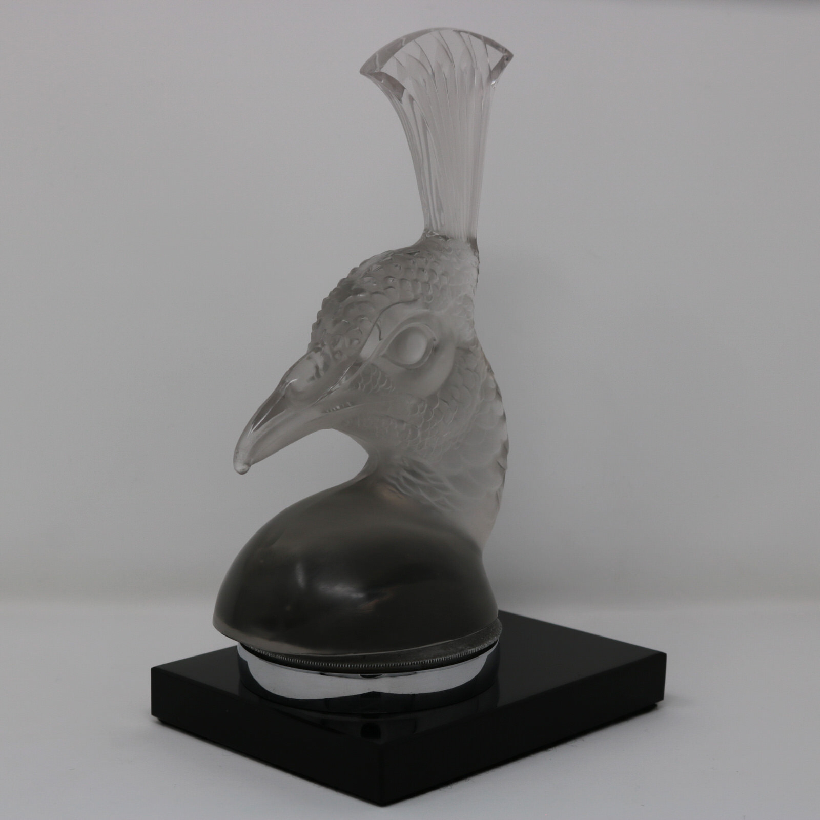Introduced in 1928. 8.2ins (20.9cm) high, 4.9ins (12.5) wide, 3.9ins (10cm) deep. Rene Lalique clear & frosted glass 'Tete De Paon' car mascot. This model features the head of a peacock.