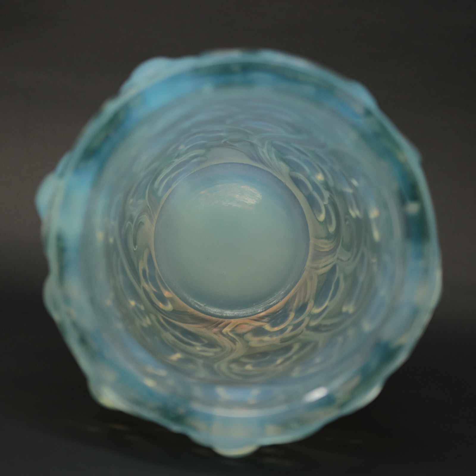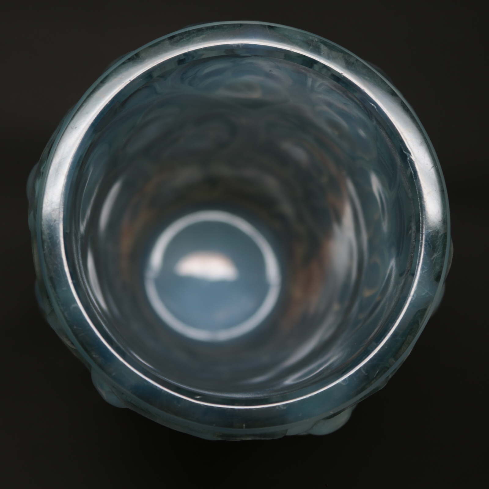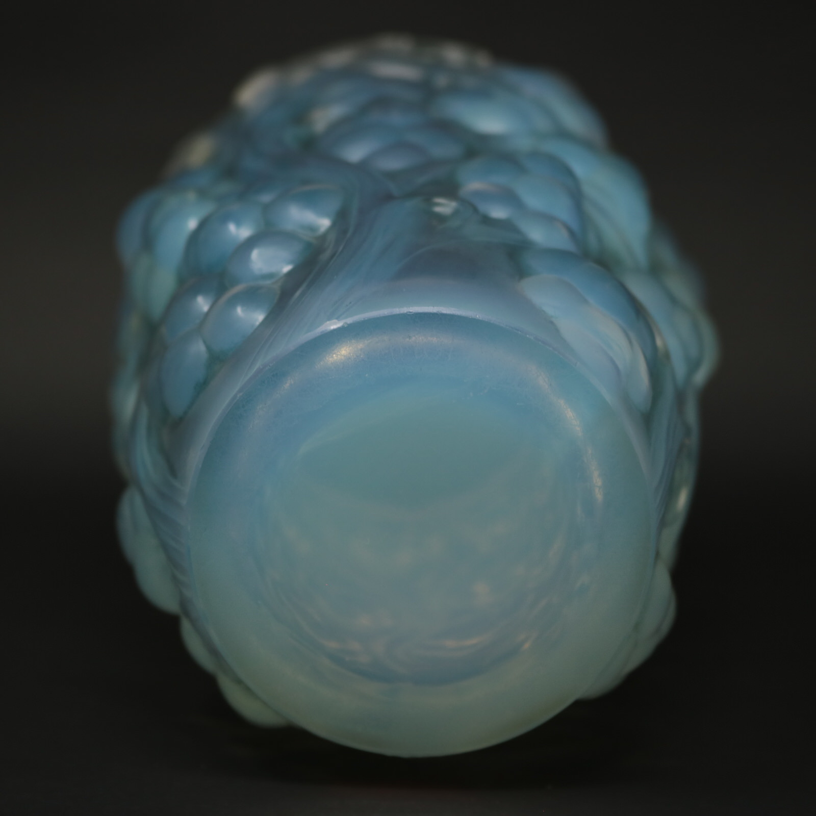 Introduced in 1928. Height: 15.9cm (6.26ins). Width: 10cm (3.94ins). Depth: 10cm (3.94ins). Rene Lalique Opalescent Glass 'Raisins' Vase, with blue stained details. This pattern features deep relief grape bunches, hanging from vines.