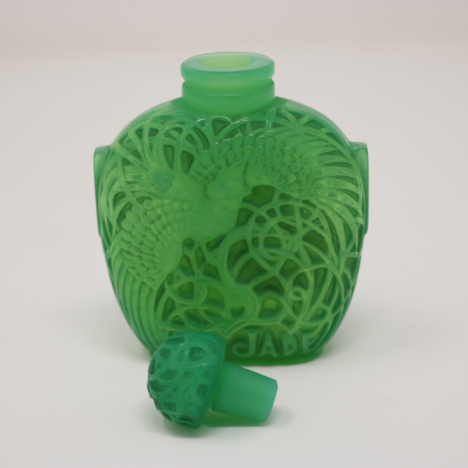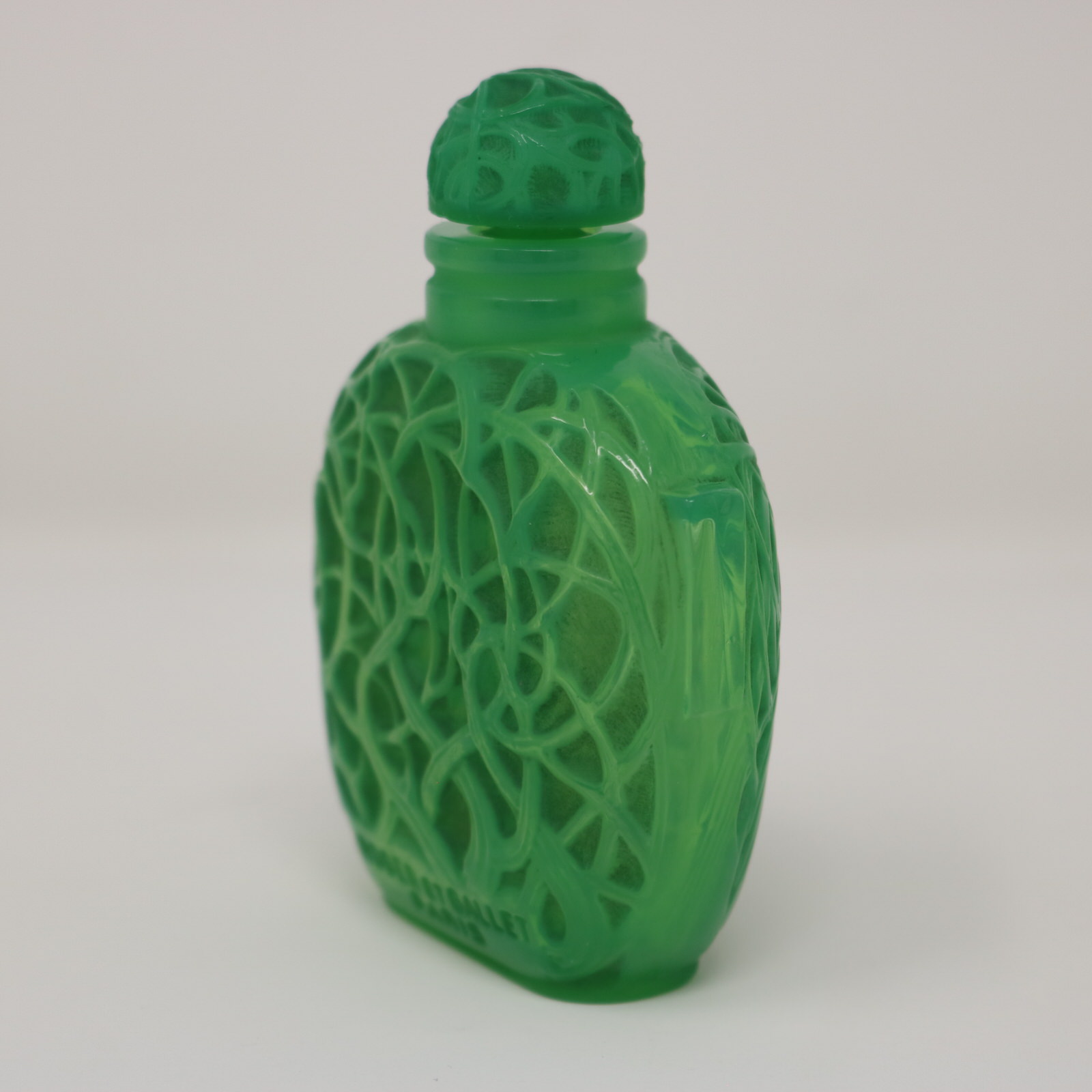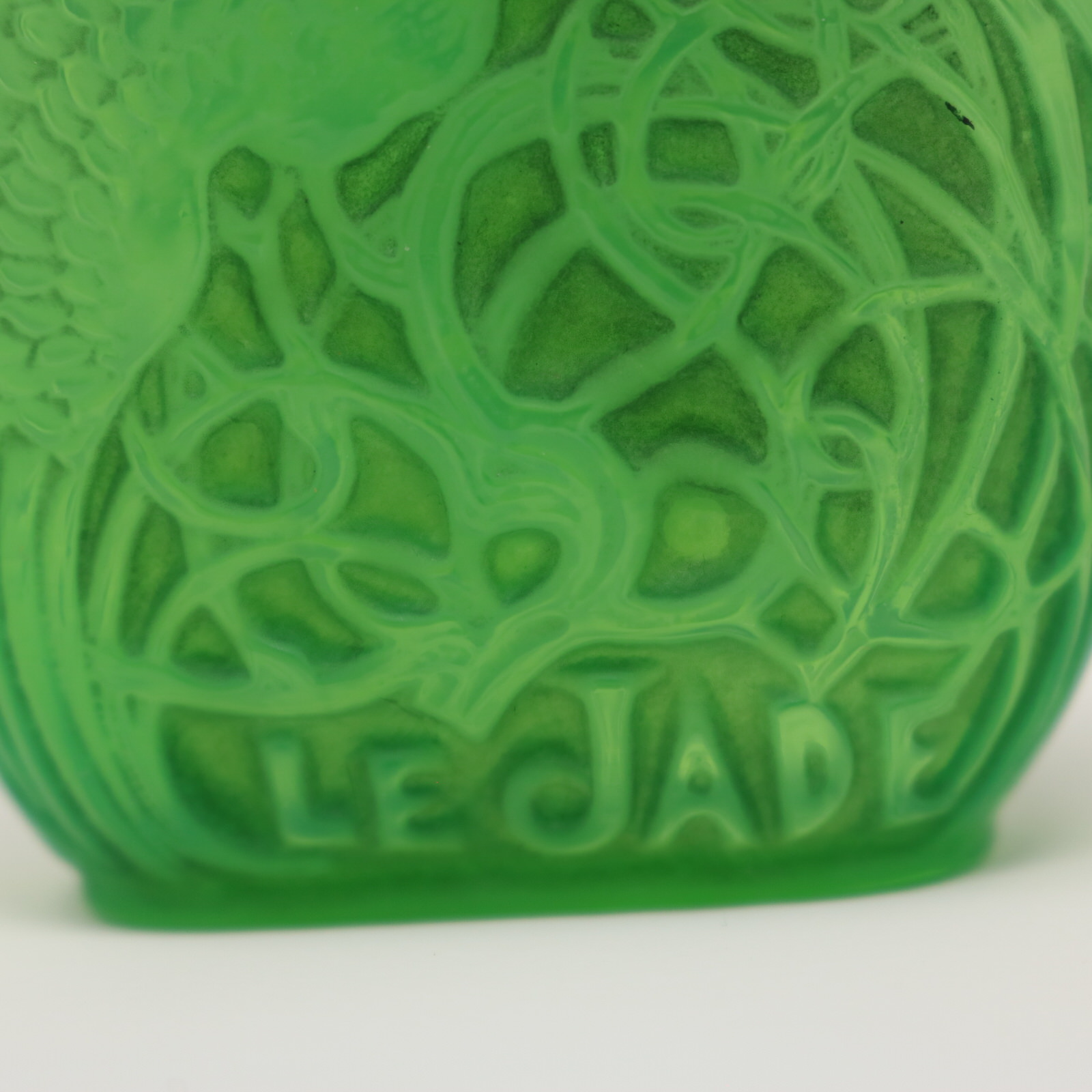 Introduced in 1926. 3.3ins high, 2.4ins wide, 1.2ins deep. Rene Lalique Green Glass Perfume Bottle. Made for Roger & Gallet of Paris for 'Le Jade' perfume.