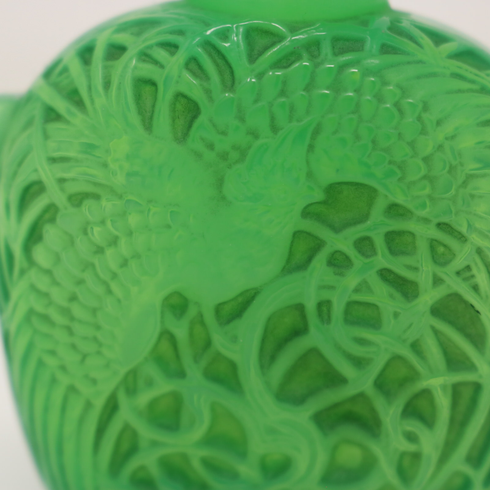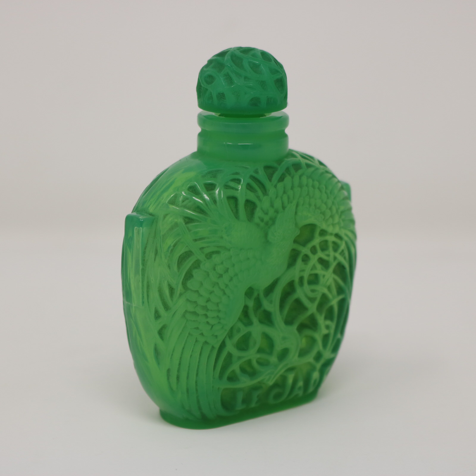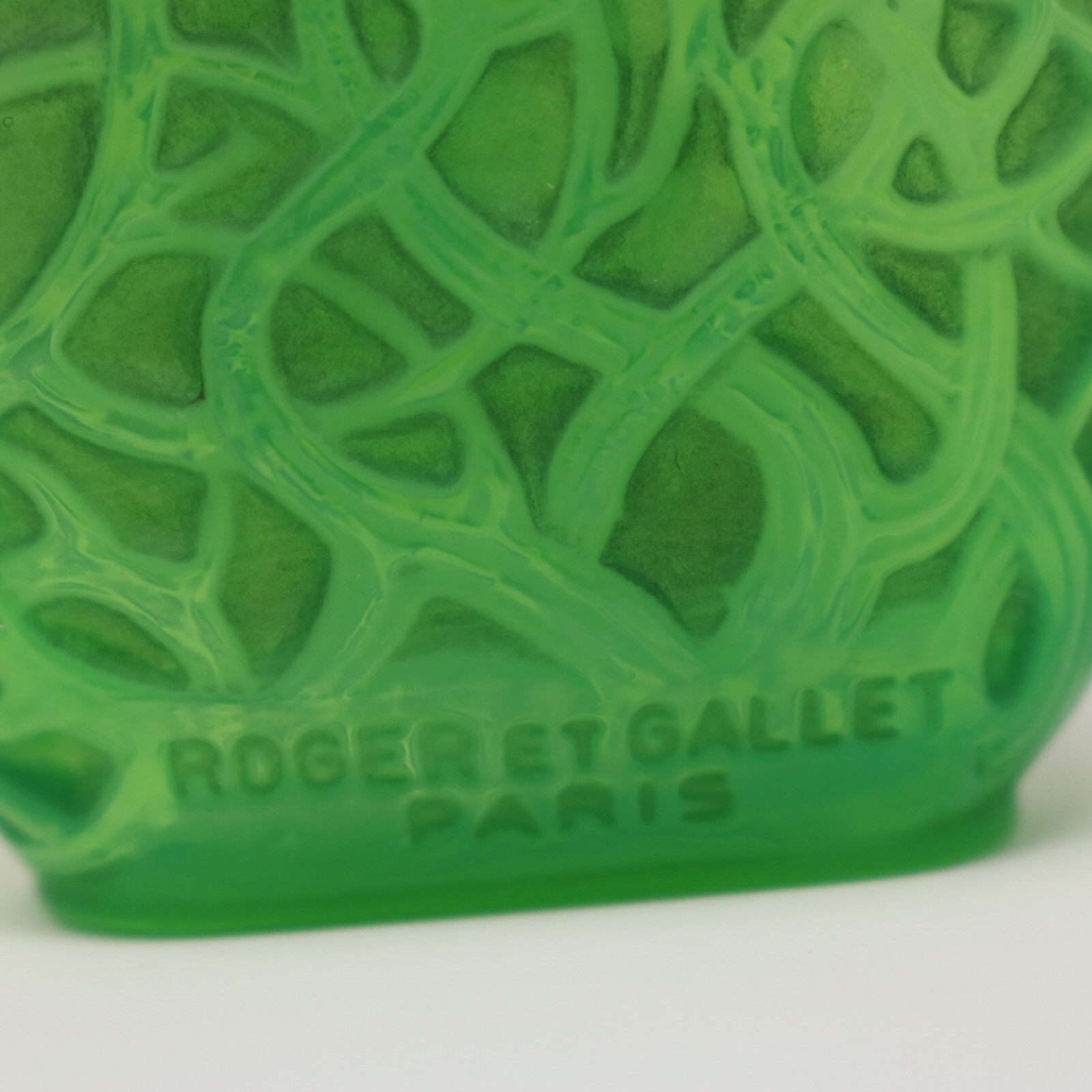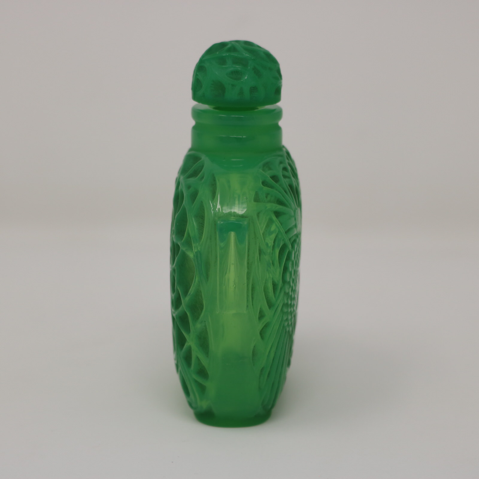 Introduced in 1926. 3.3ins high, 2.4ins wide, 1.2ins deep. Rene Lalique Green Glass Perfume Bottle. Made for Roger & Gallet of Paris for 'Le Jade' perfume.