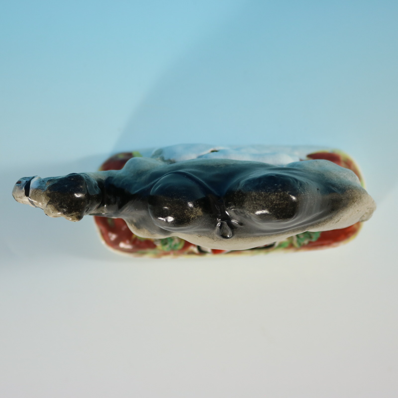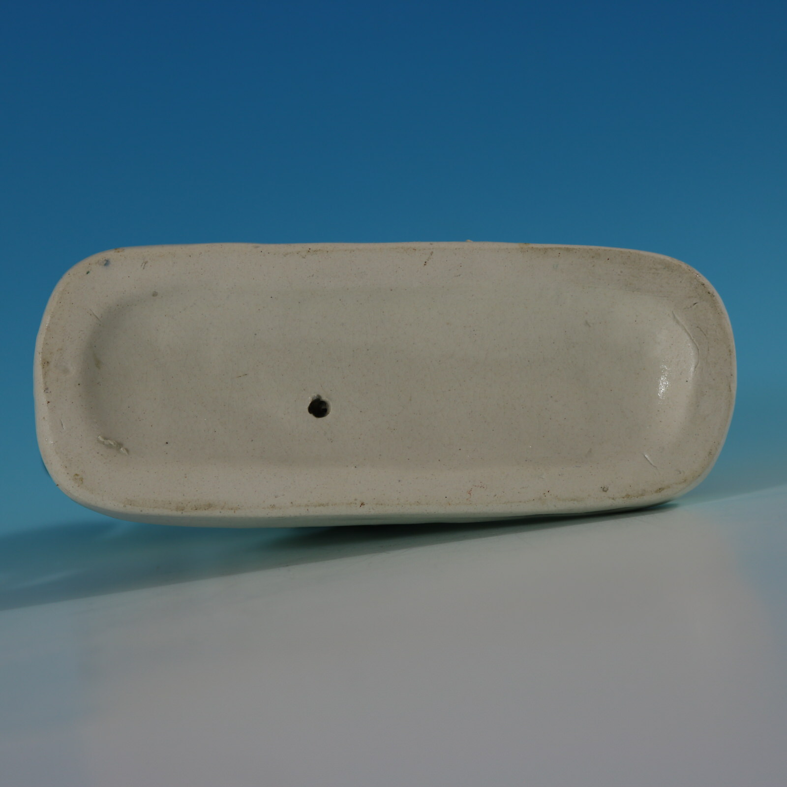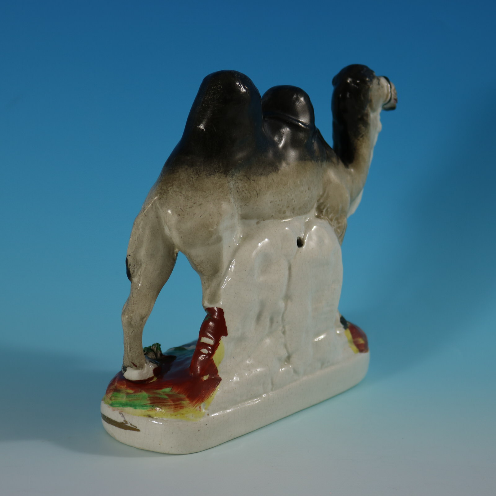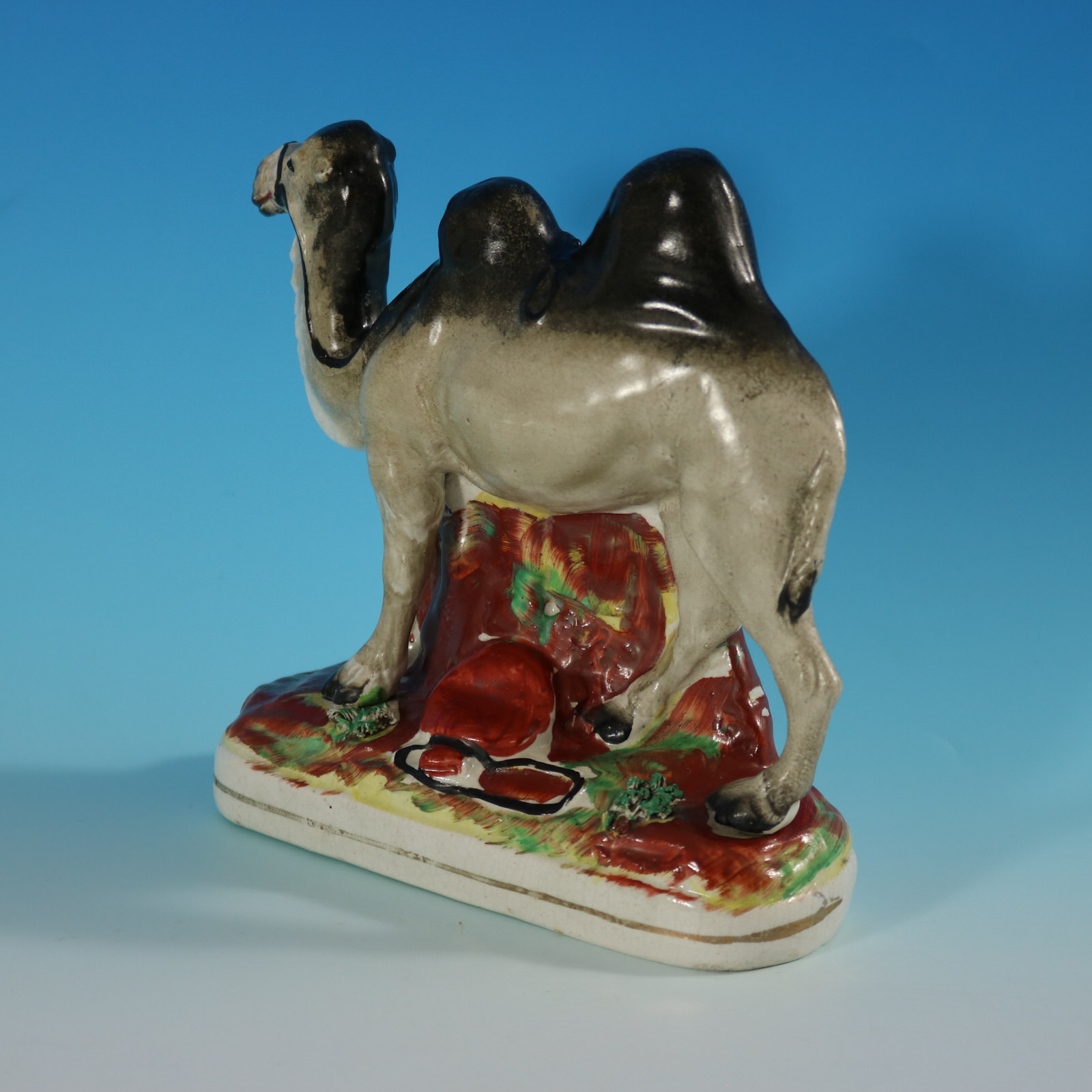 Victorian, circa 1875. 6.3ins high, 6.7ins wide, 2.4ins depth. Staffordshire Pottery figure which features a Bactrian camel with a leather water bottle at its feet, stood on an oblong base.