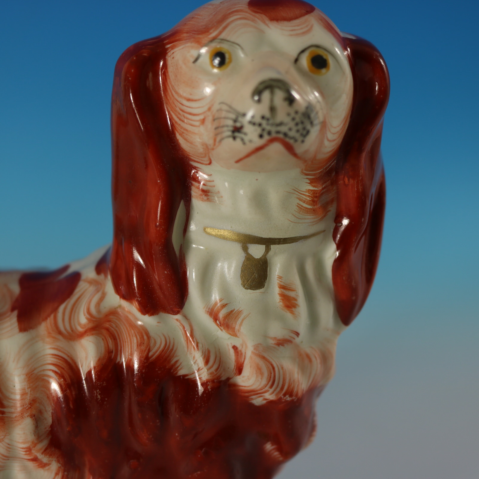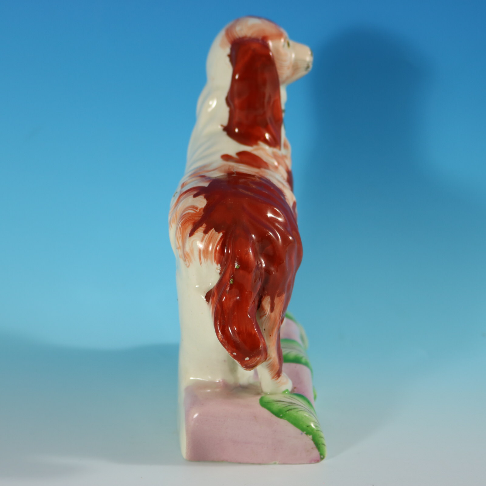 Victorian, circa 1860. 7.5ins high, 6.9ins wide, 3ins depth. Staffordshire Pottery figure which features a King Charles spaniel, stood on a leaf embellished base.