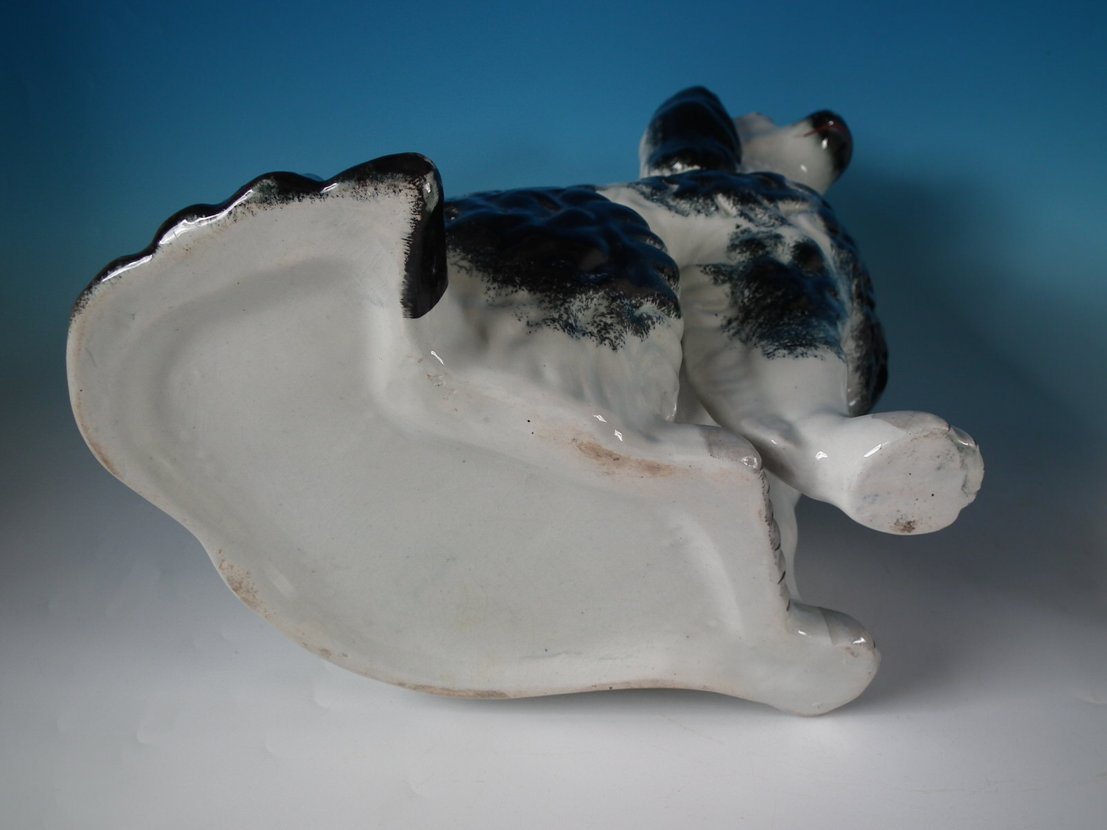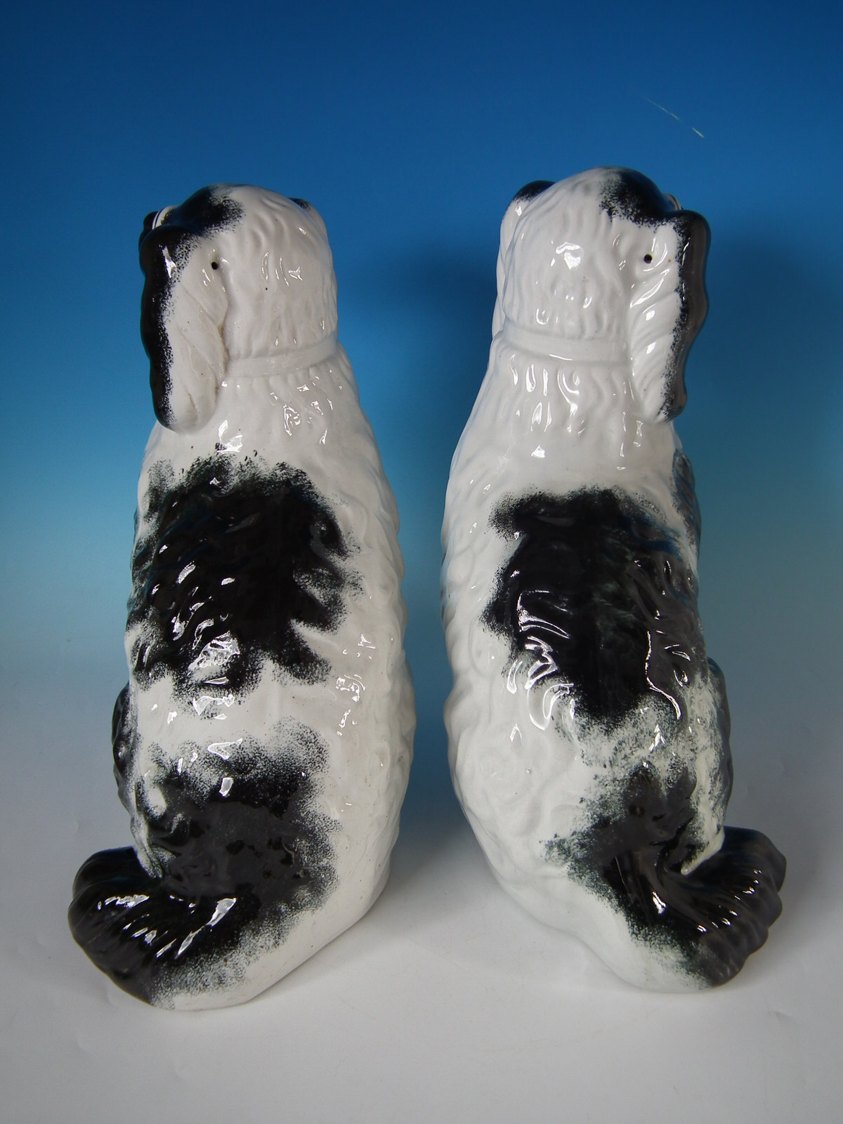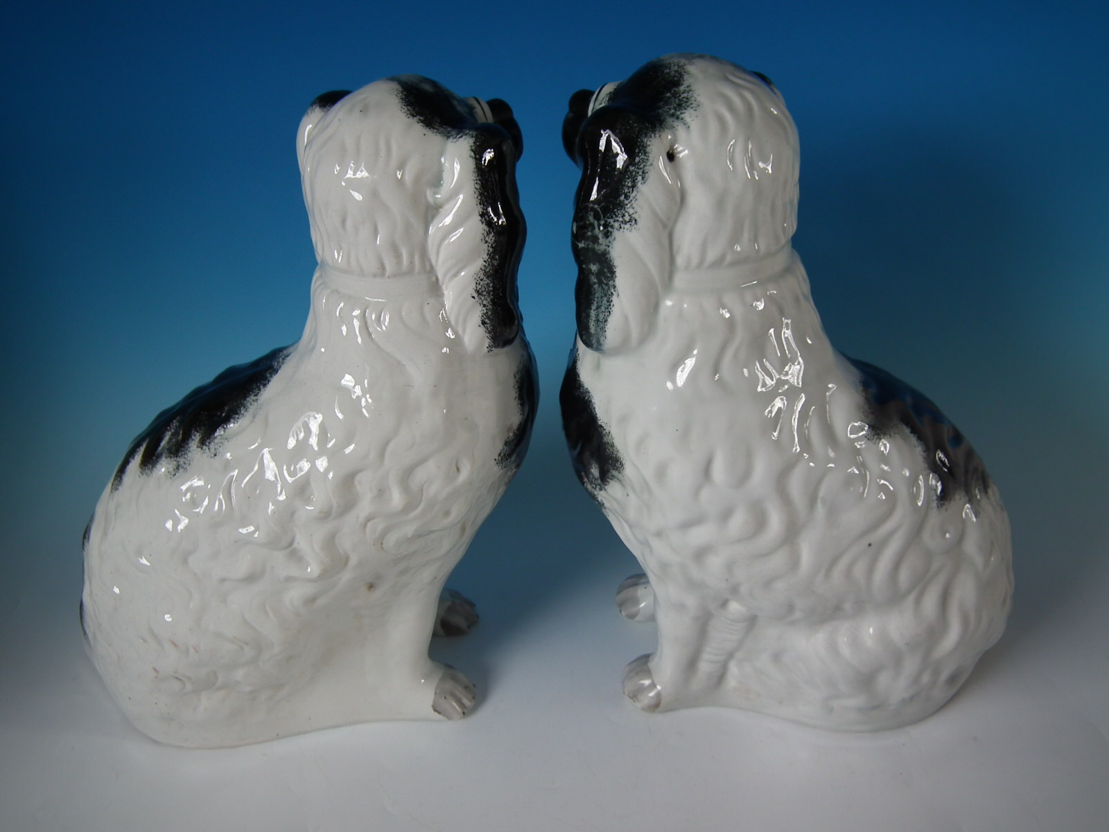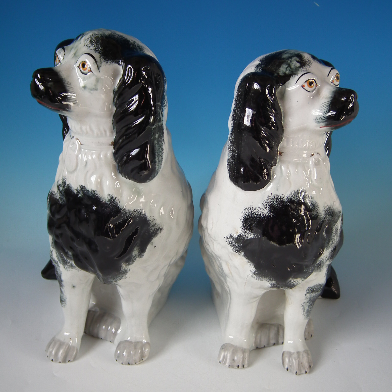 Victorian, circa 1880. Tallest is 15.4ins high, 10.6ins wide, 6.9ins depth. Pair of Staffordshire Pottery figures which feature a very large spaniel,