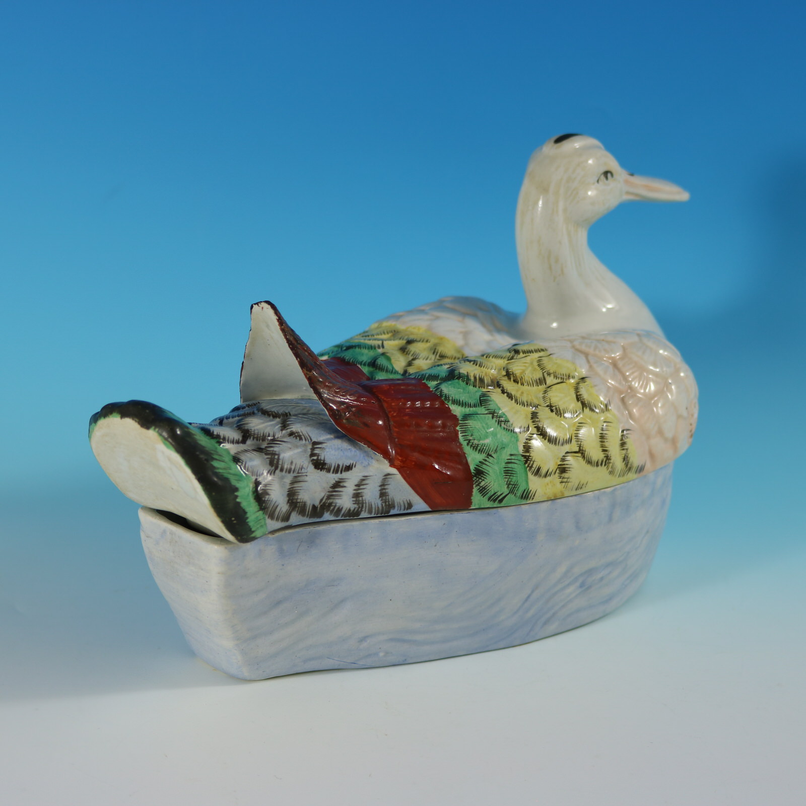 Victorian, circa 1860. 6.9ins high, 11ins wide, 5.3ins depth. Staffordshire Pottery tureen with cover which features a duck forming the lid, sitting on a base molded with a rippling water effect.