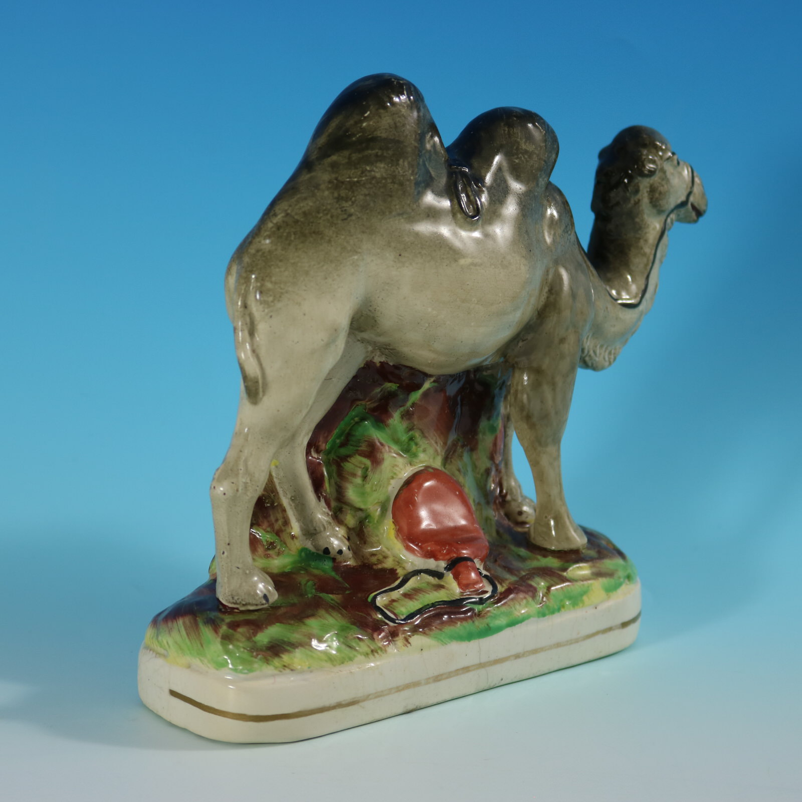 Victorian, circa 1870. 6.4ins high, 7.1ins wide, 2.4ins depth. Staffordshire Pottery figure which features a Bactrian camel with a leather water bottle at its feet, stood on an oblong base.
