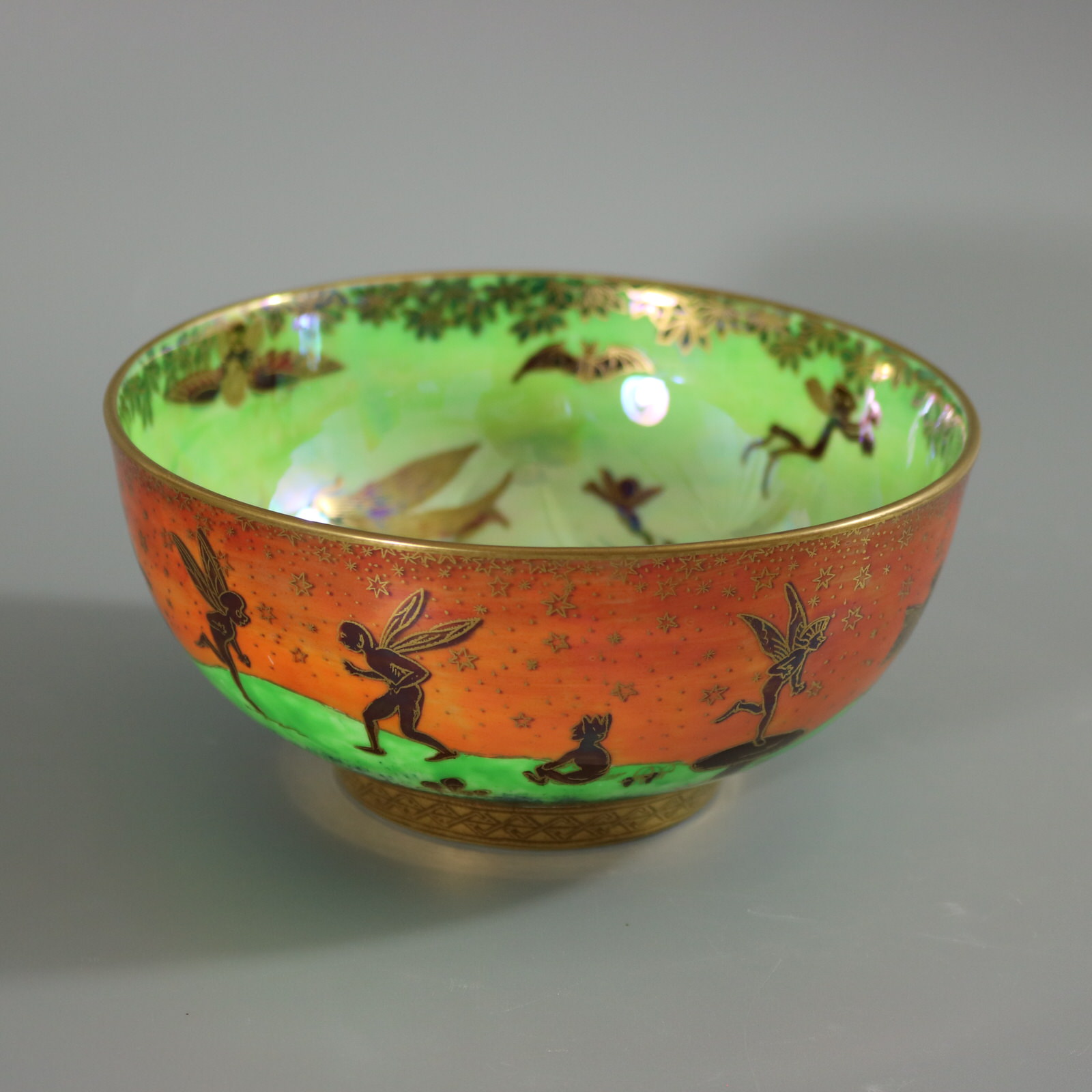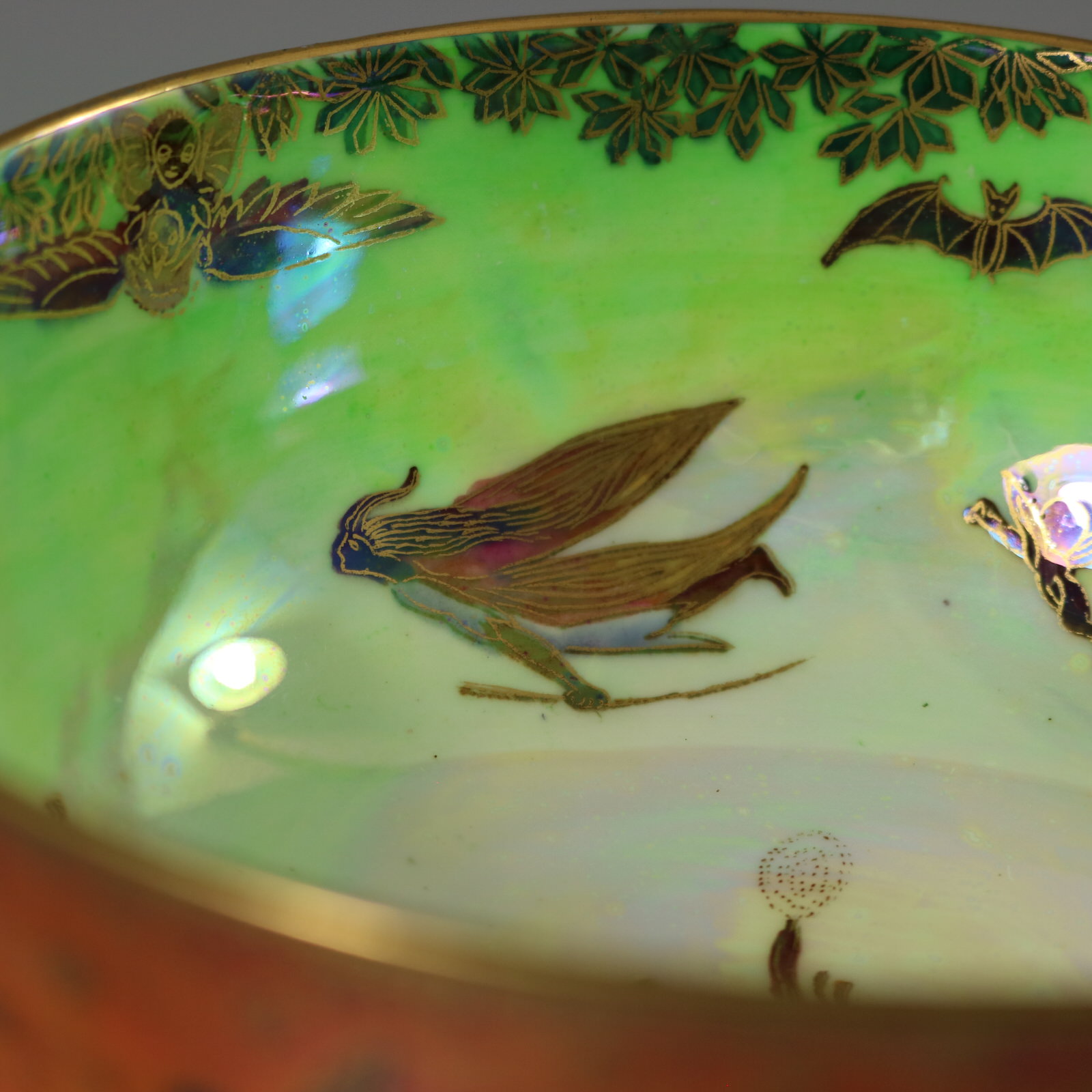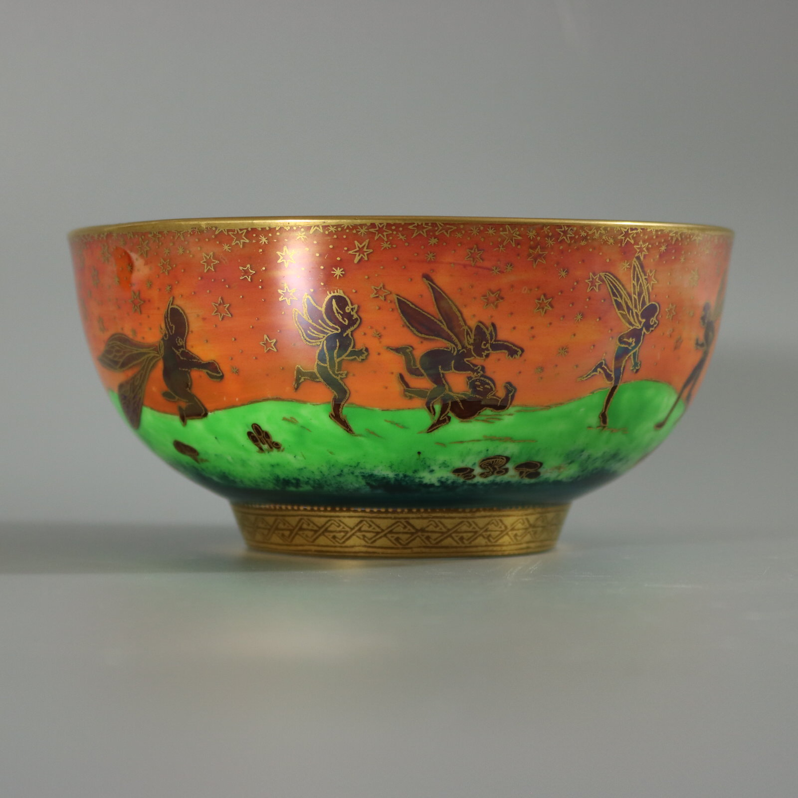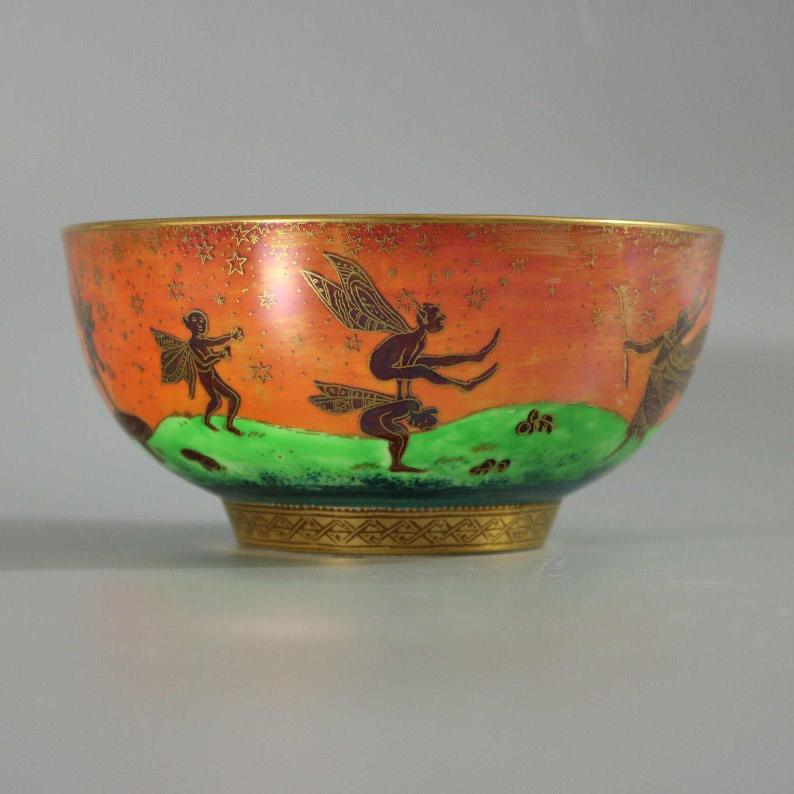 Circa 1920. 2.7ins high, 5.6ins diameter. Wedgwood Fairyland Lustre imperial bowl, the exterior decorated in, 'Leapfrogging Elves' design on a sunset sky, flame ground.