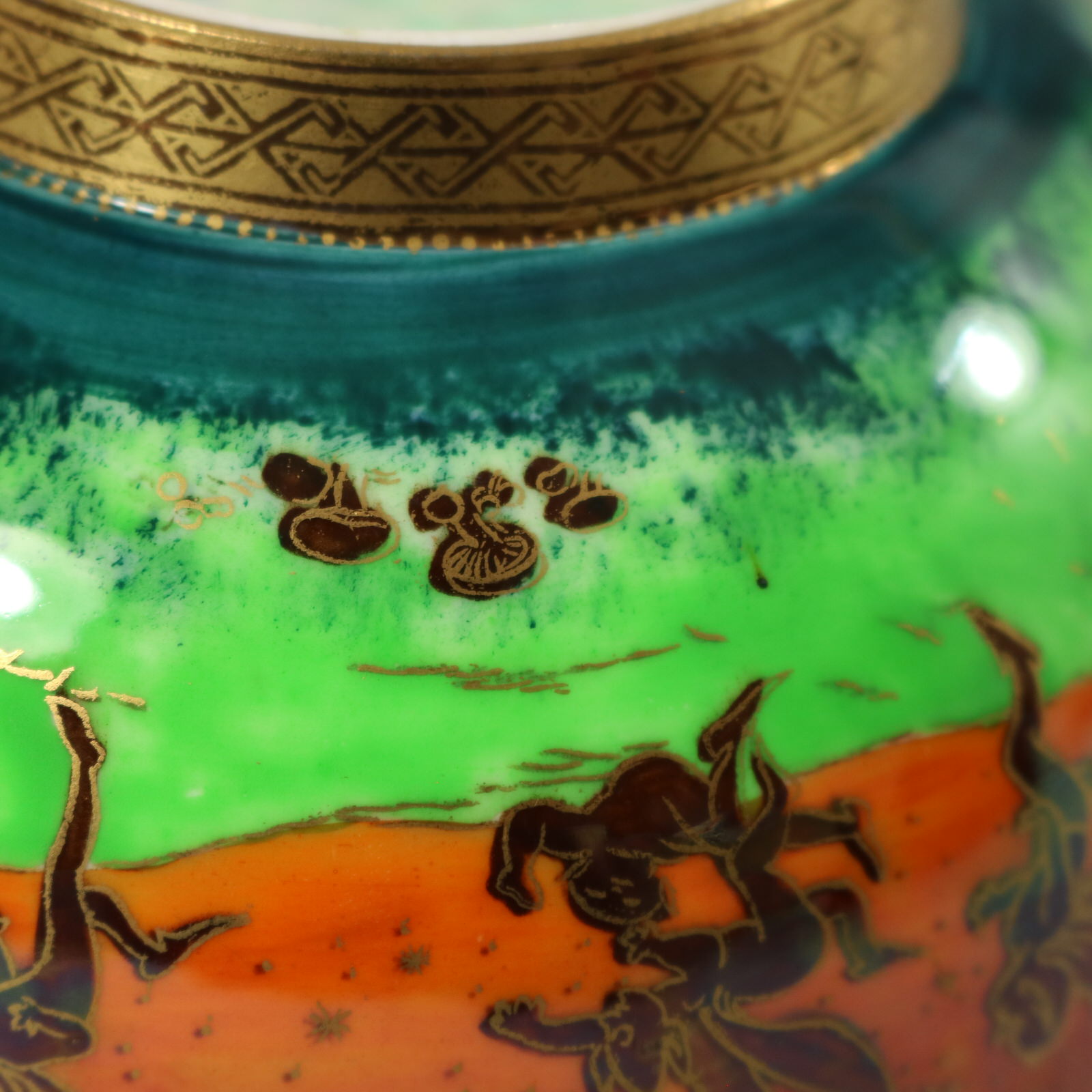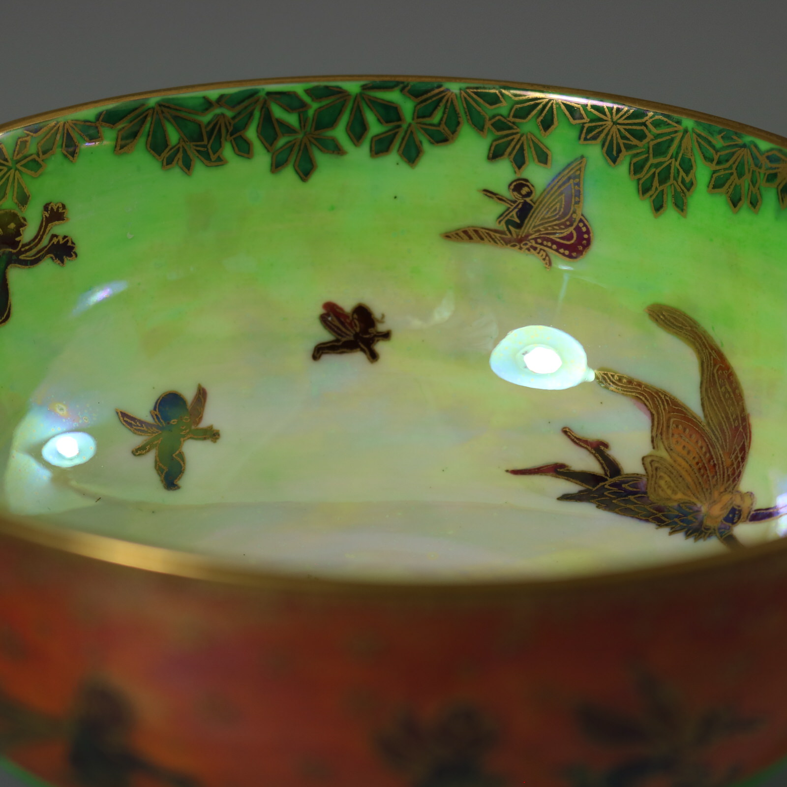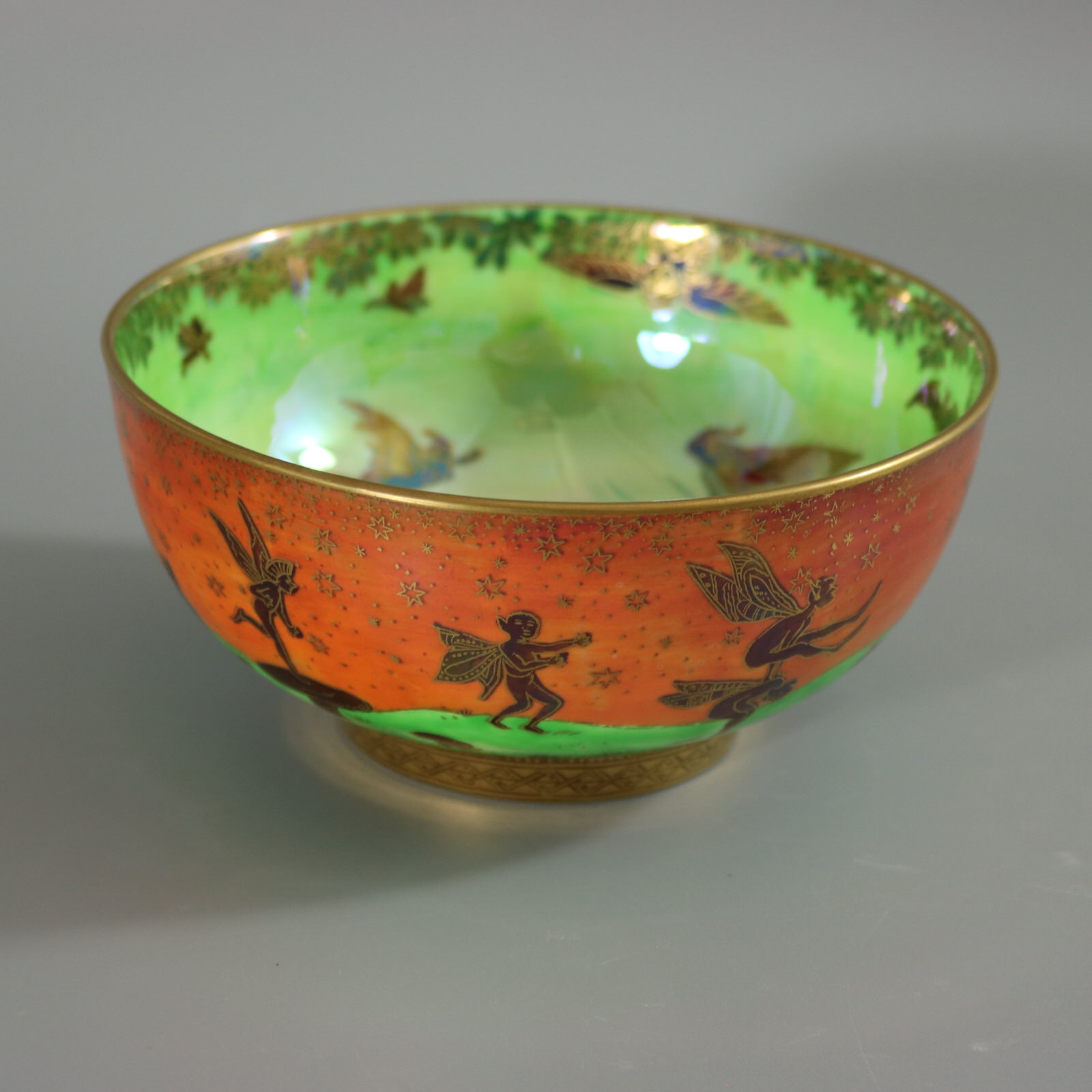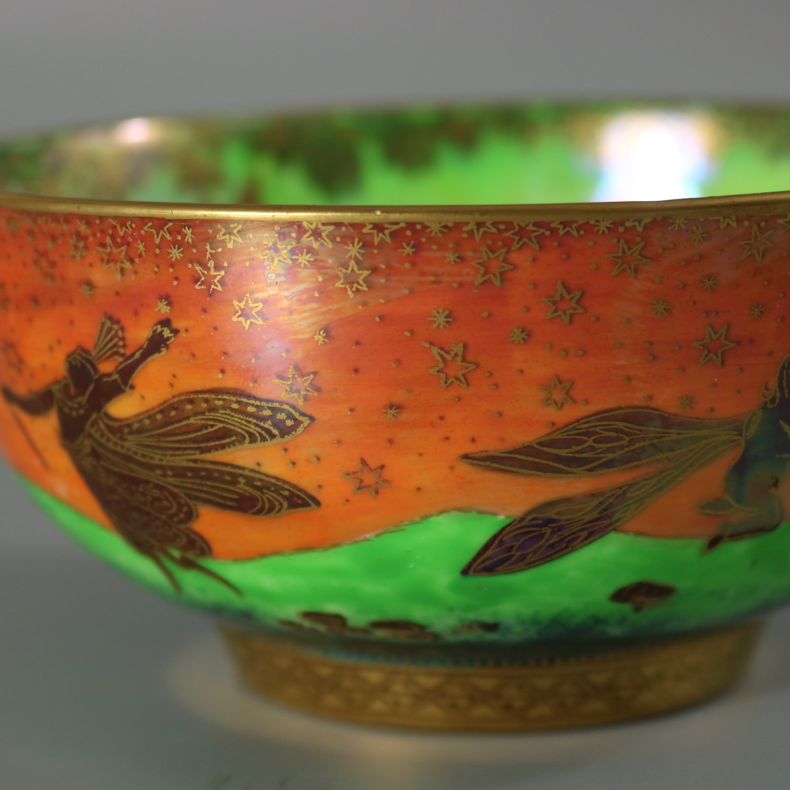 Circa 1920. 2.7ins high, 5.6ins diameter. Wedgwood Fairyland Lustre imperial bowl, the exterior decorated in, 'Leapfrogging Elves' design on a sunset sky, flame ground.