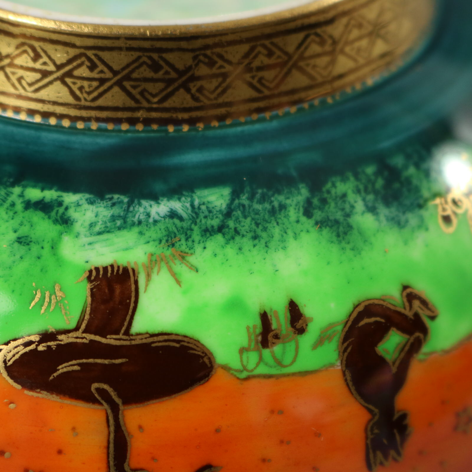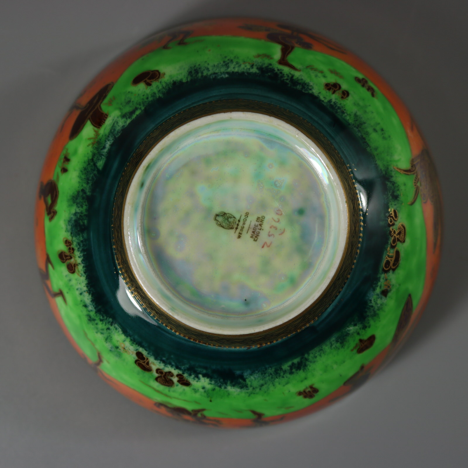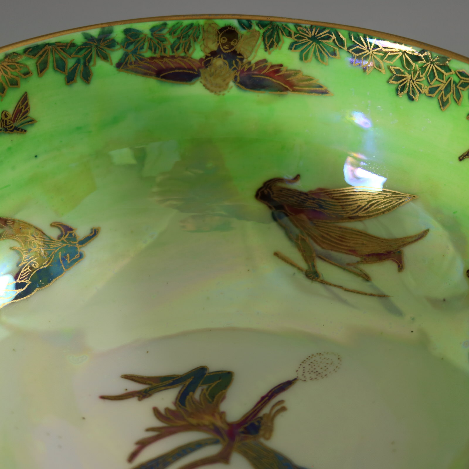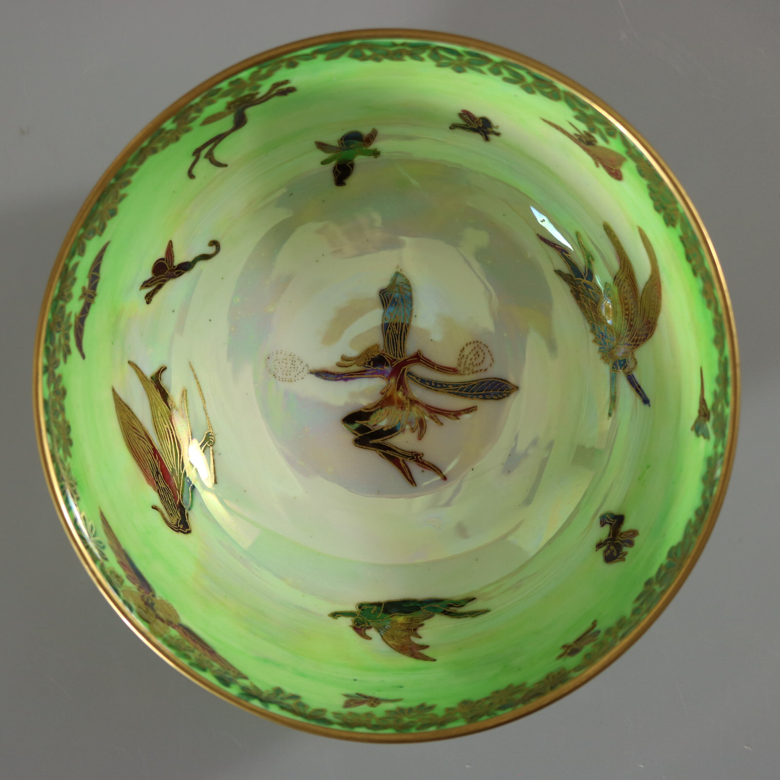 Circa 1920. 2.7ins high, 5.6ins diameter. Wedgwood Fairyland Lustre imperial bowl, the exterior decorated in, 'Leapfrogging Elves' design on a sunset sky, flame ground.