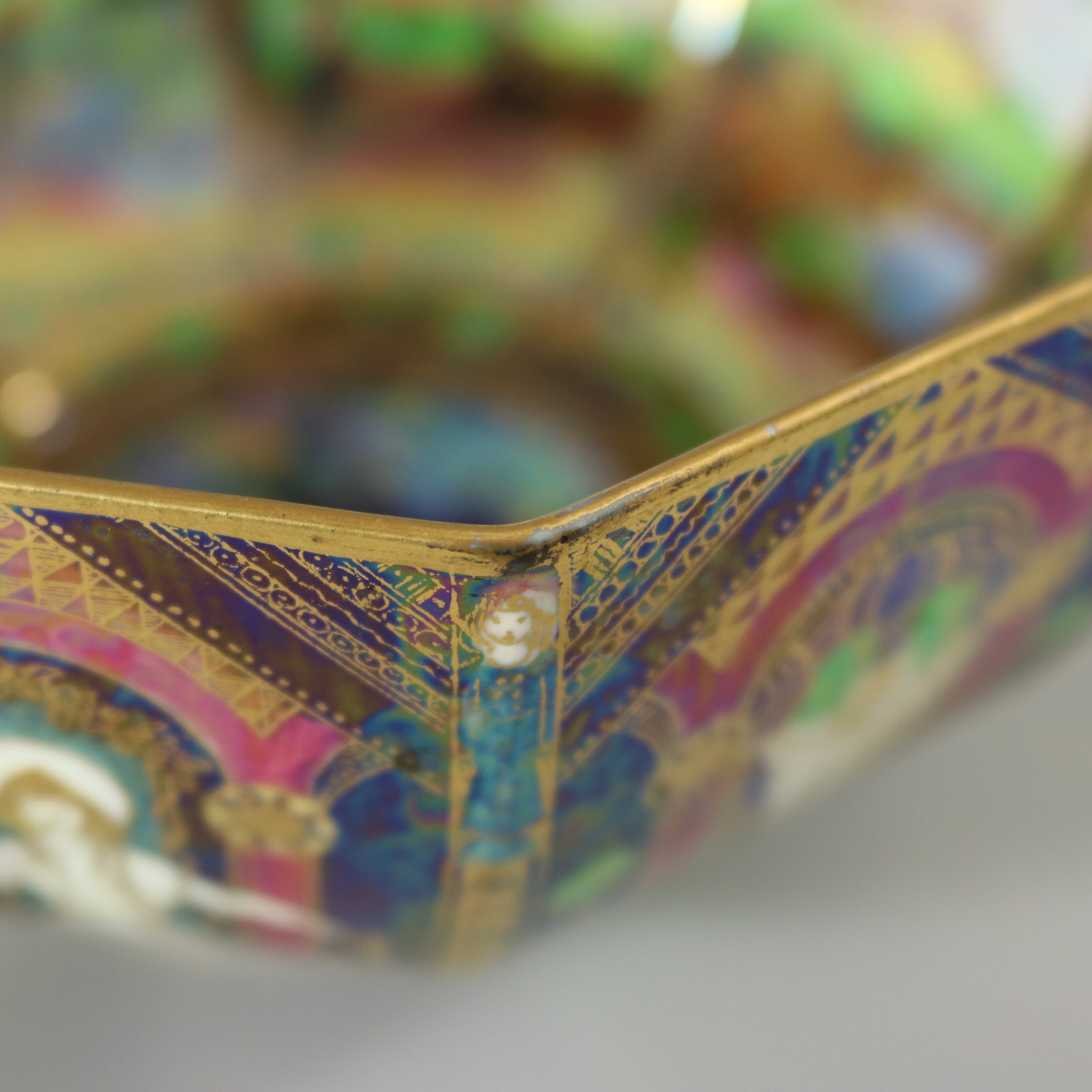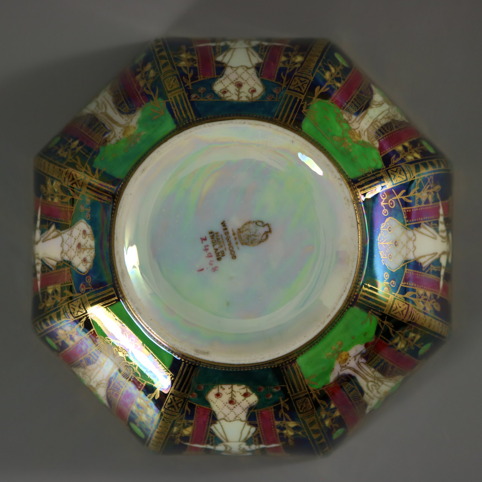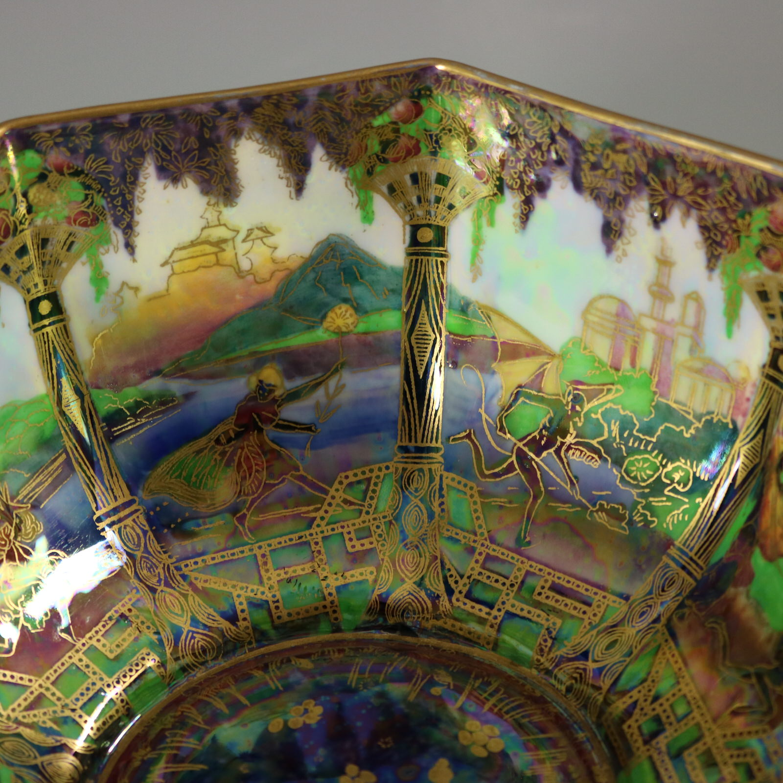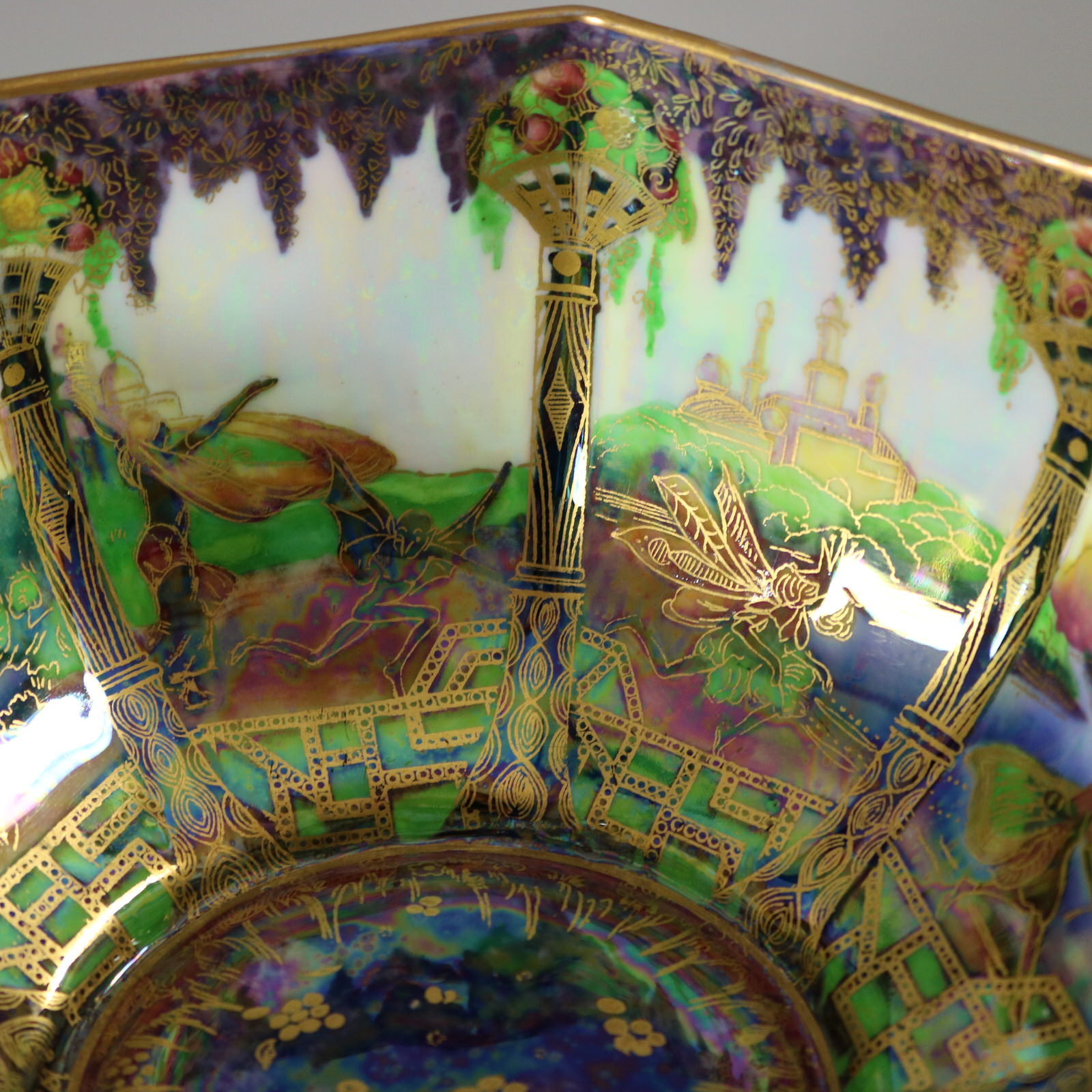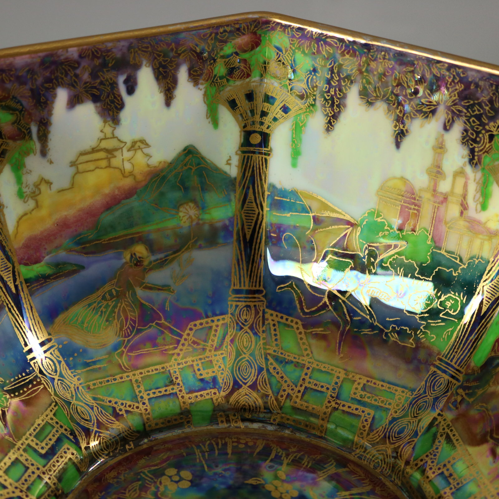 Circa 1920. 3.2ins high, 6.8ins wide, 6.8ins deep. Wedgwood Fairyland Lustre octagonal bowl, decorated with 'Geisha' or 'Angels' design to the exterior.