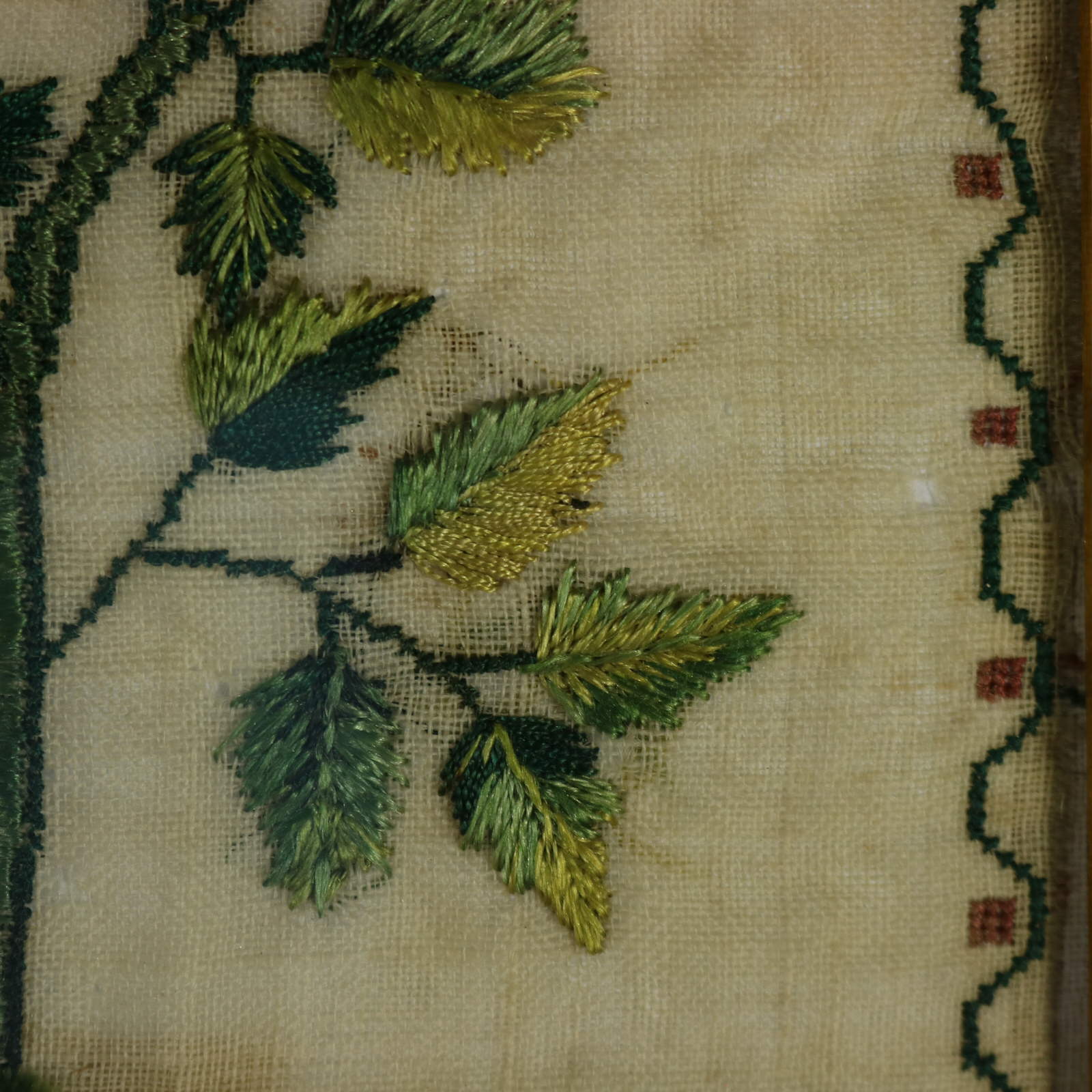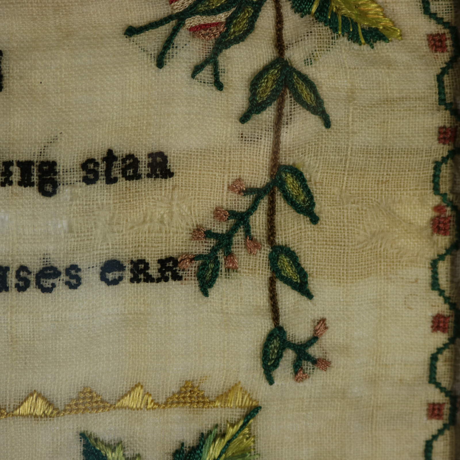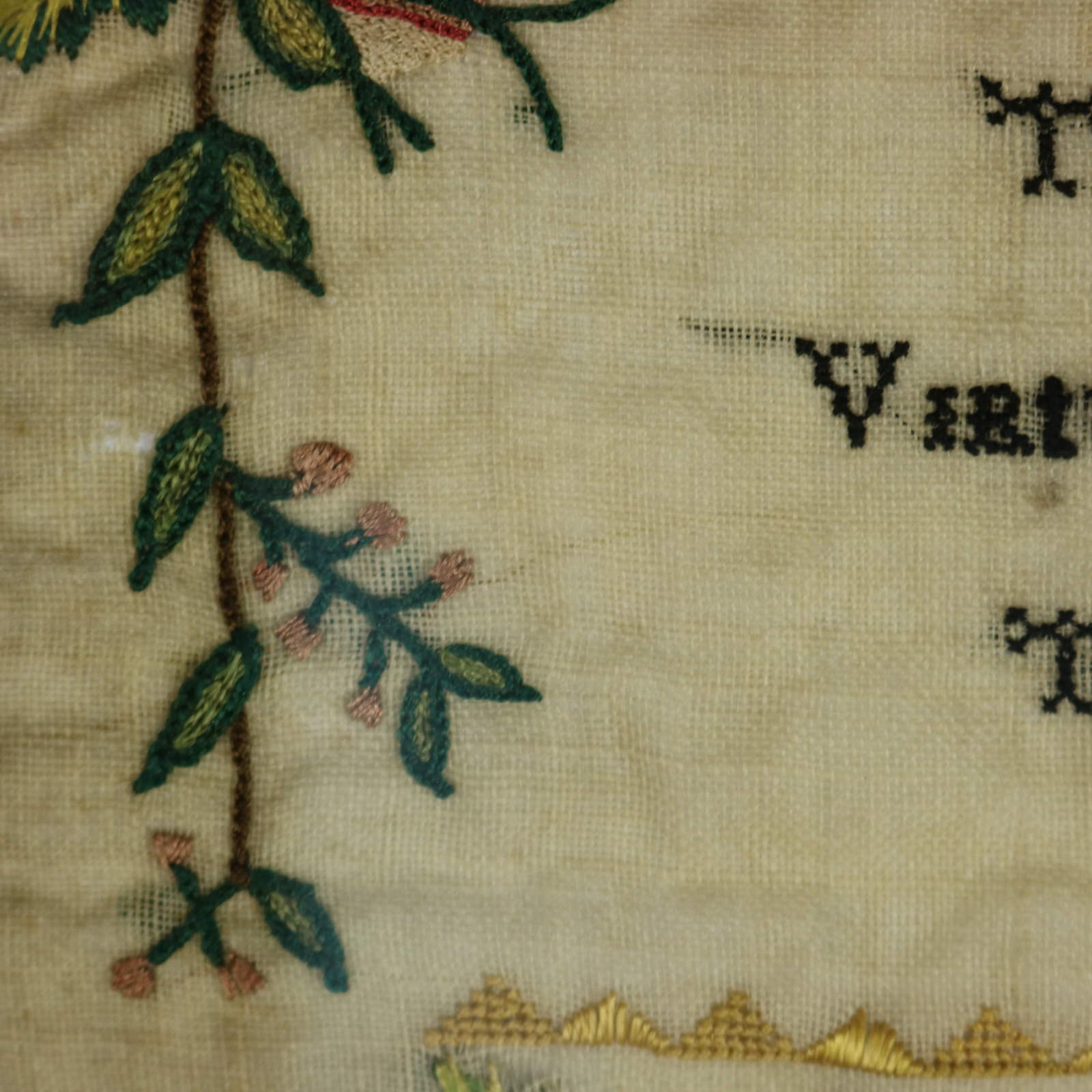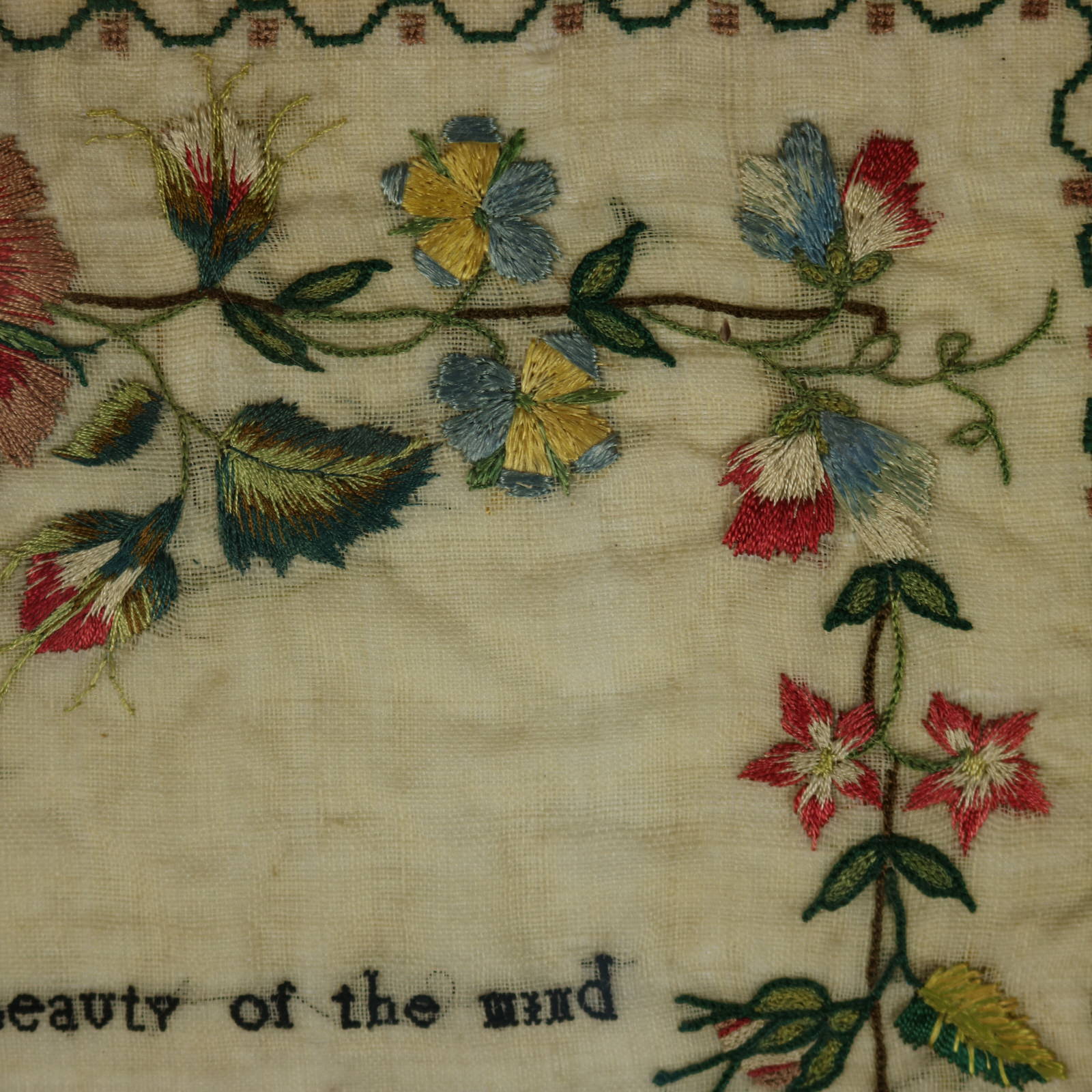 The sampler is worked in silk threads on a linen ground, in a variety of stitches.