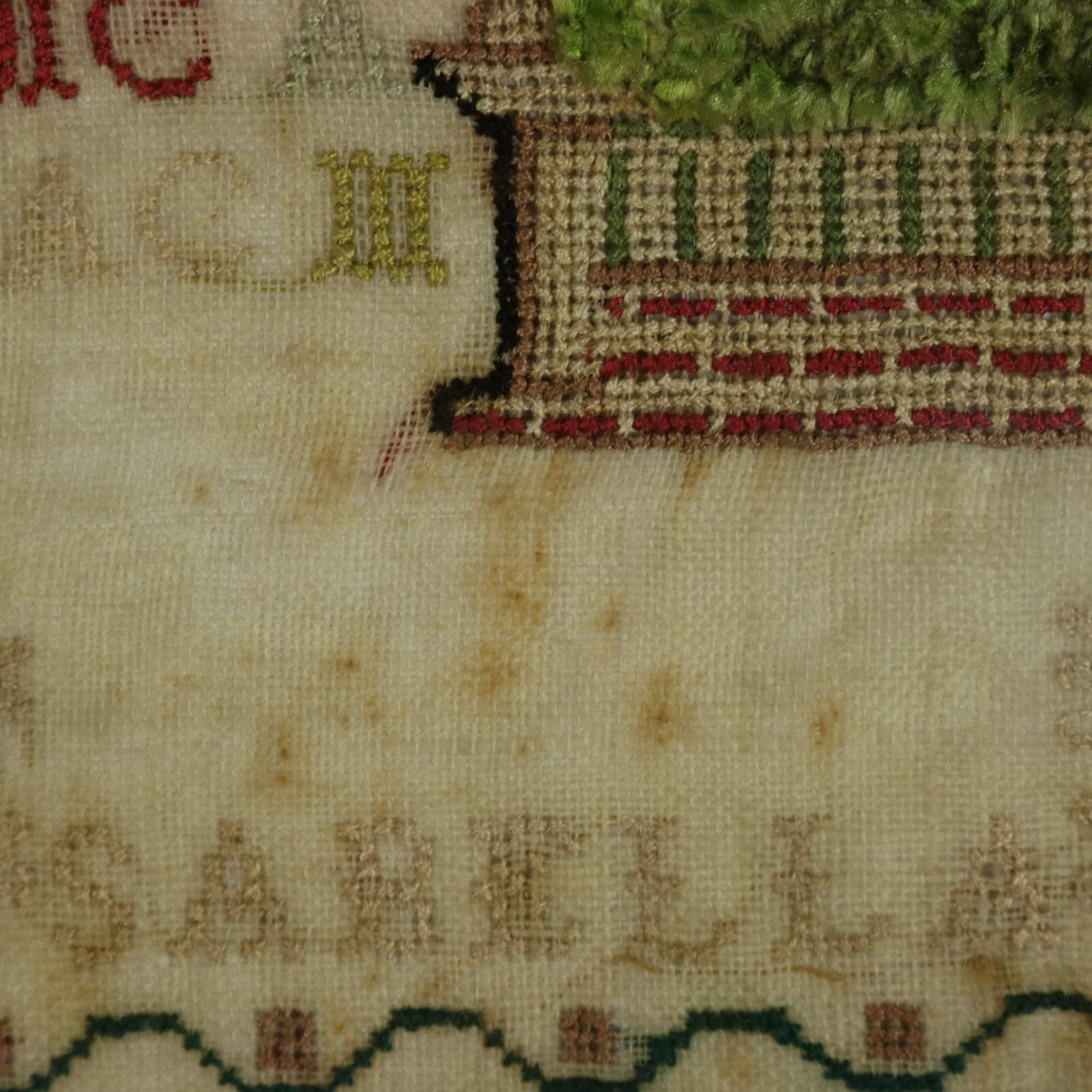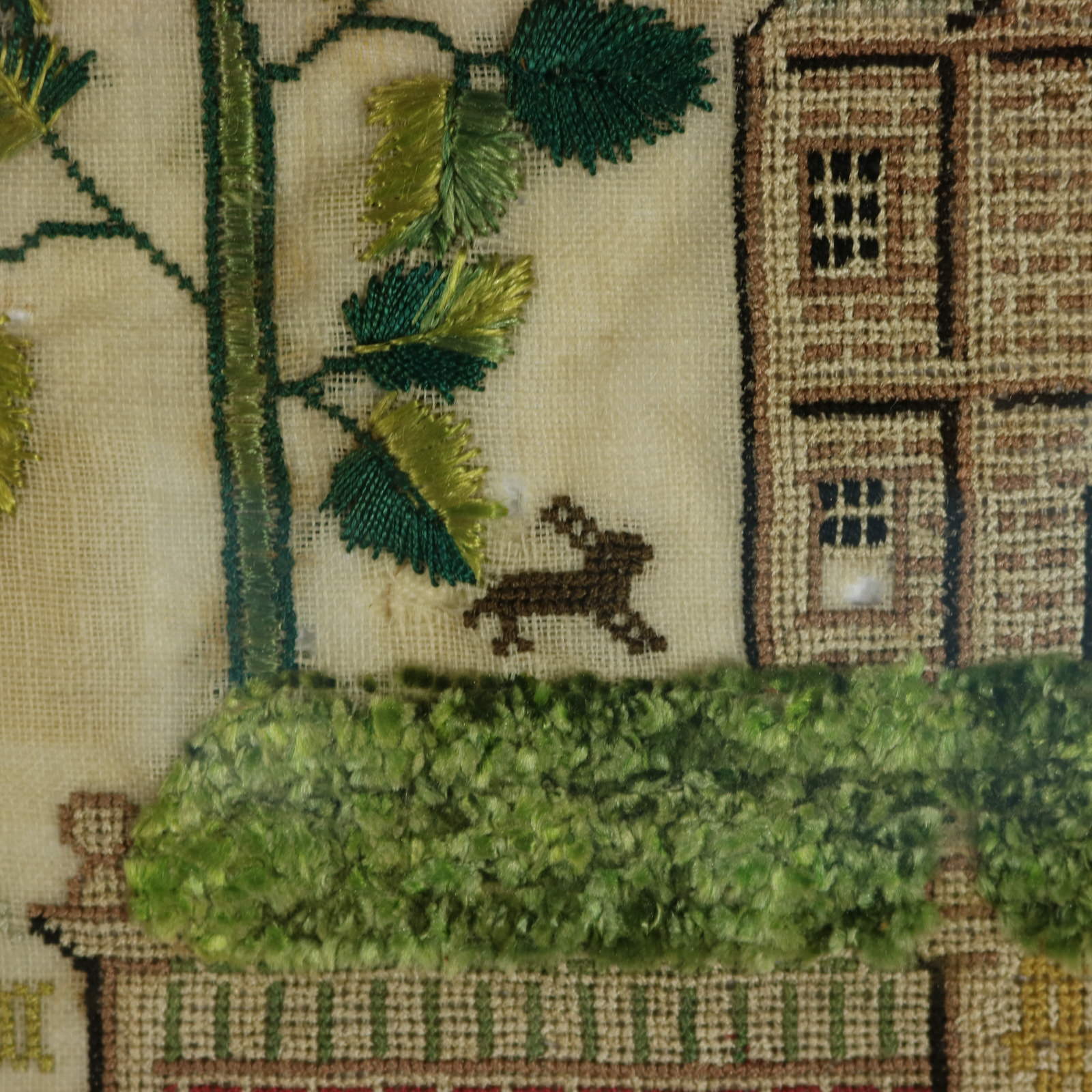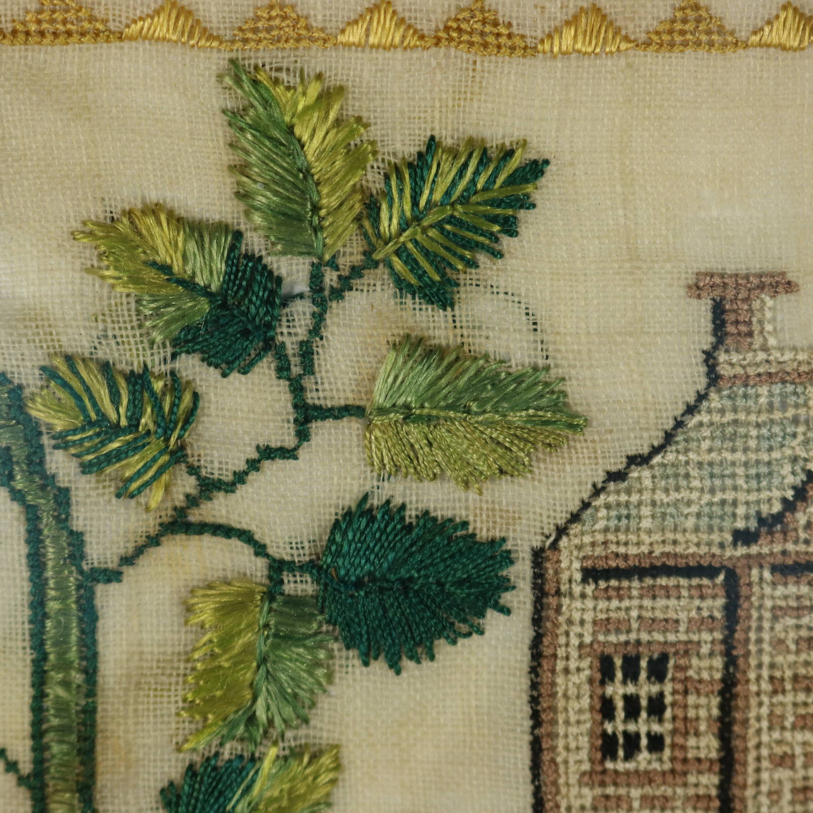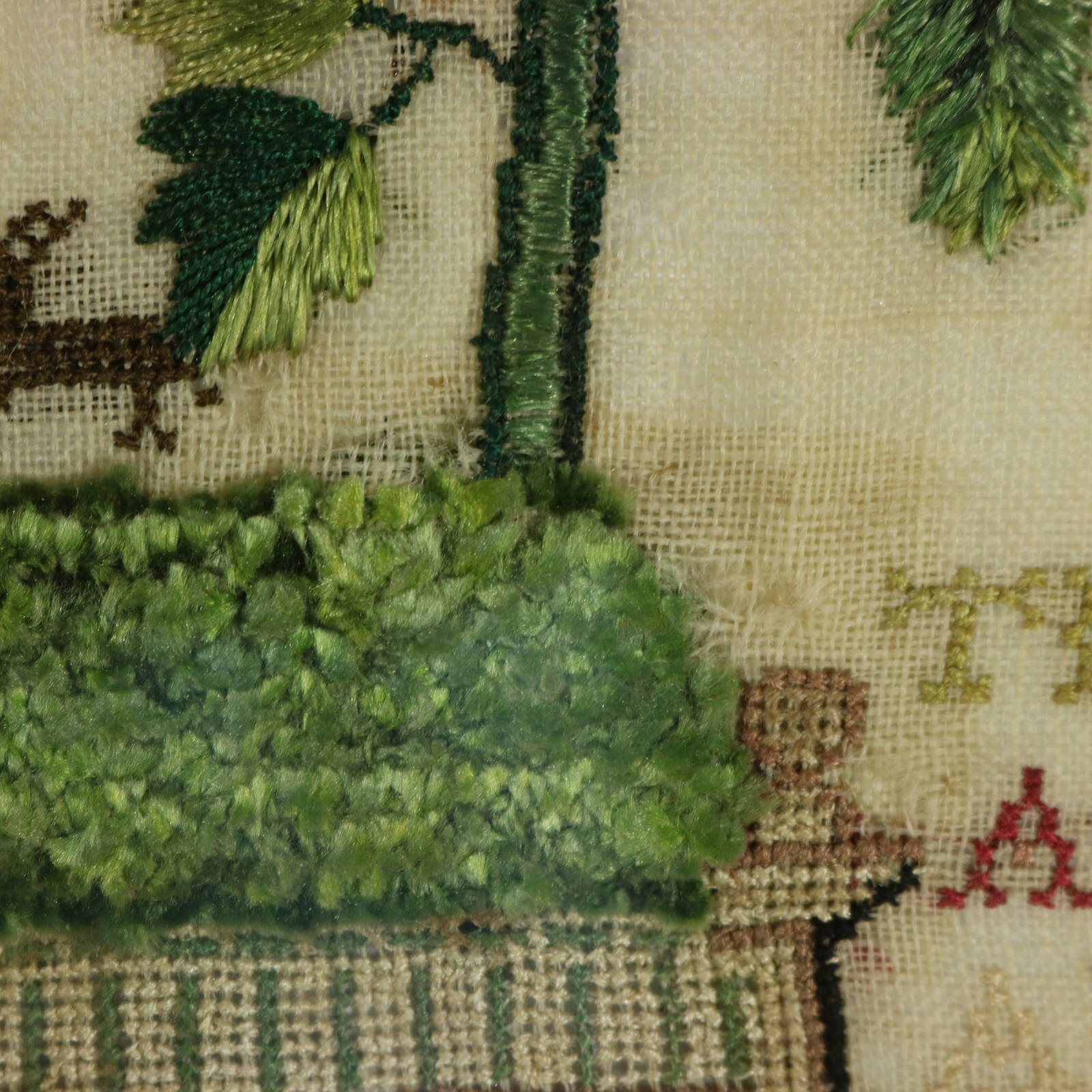 The sampler is worked in silk threads on a linen ground, in a variety of stitches.