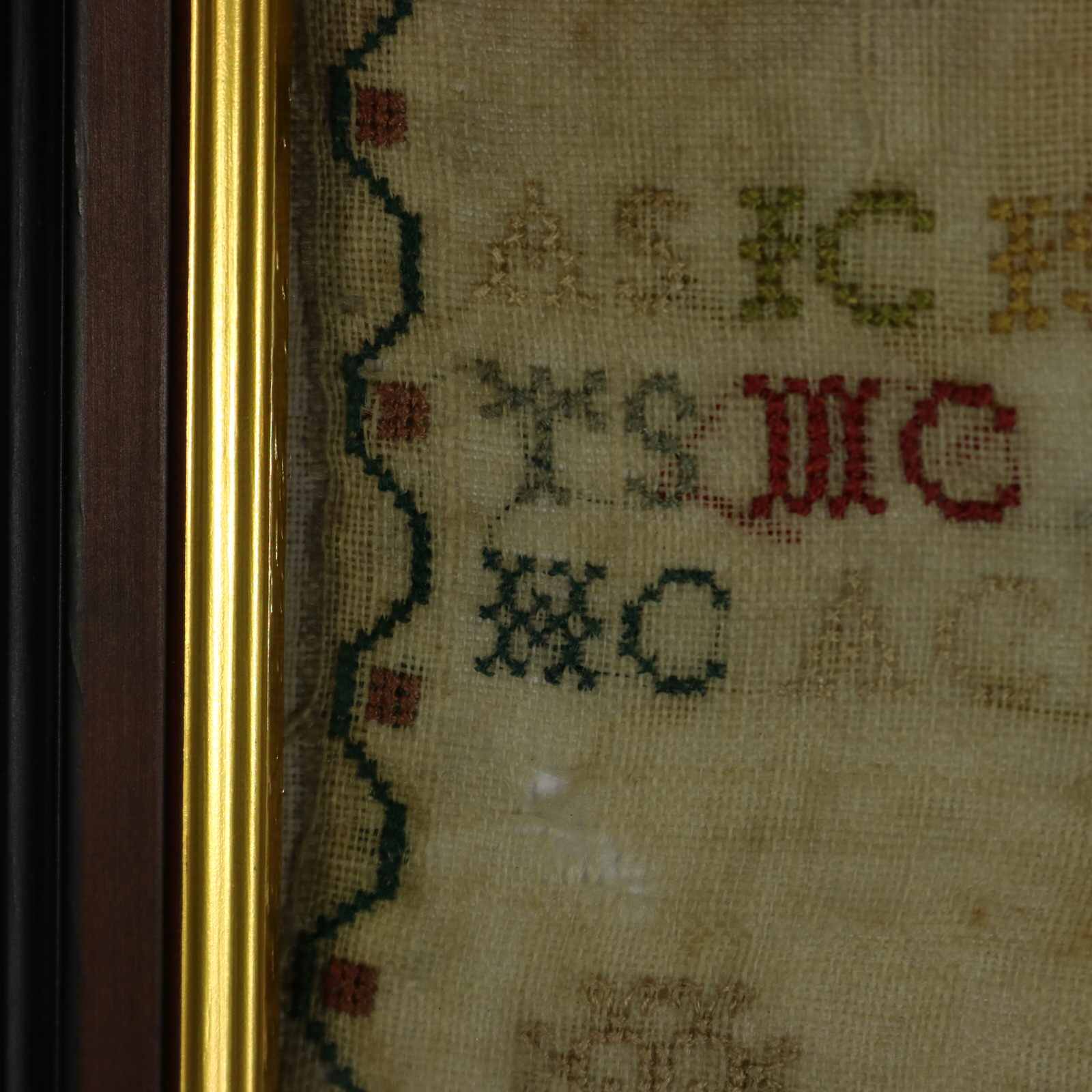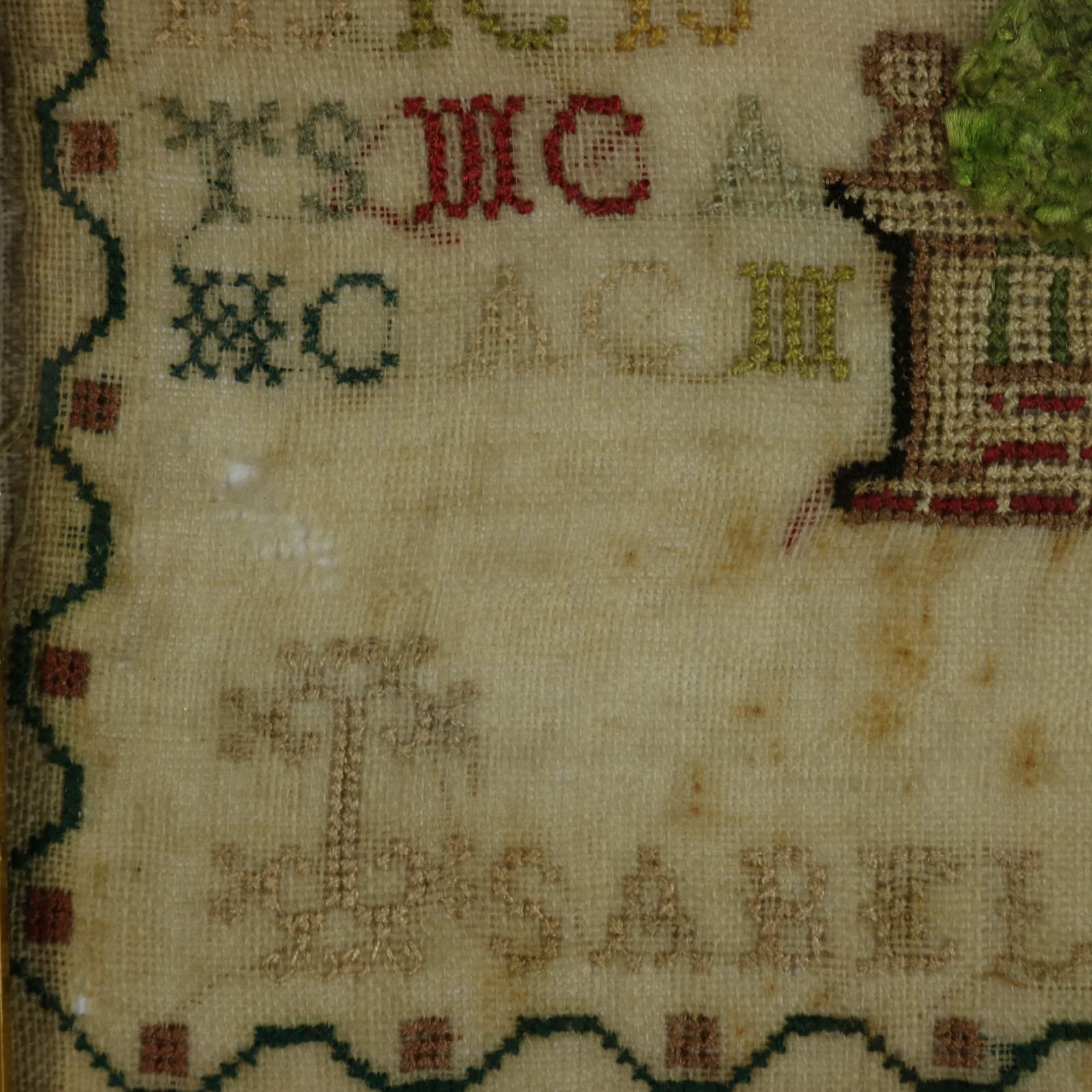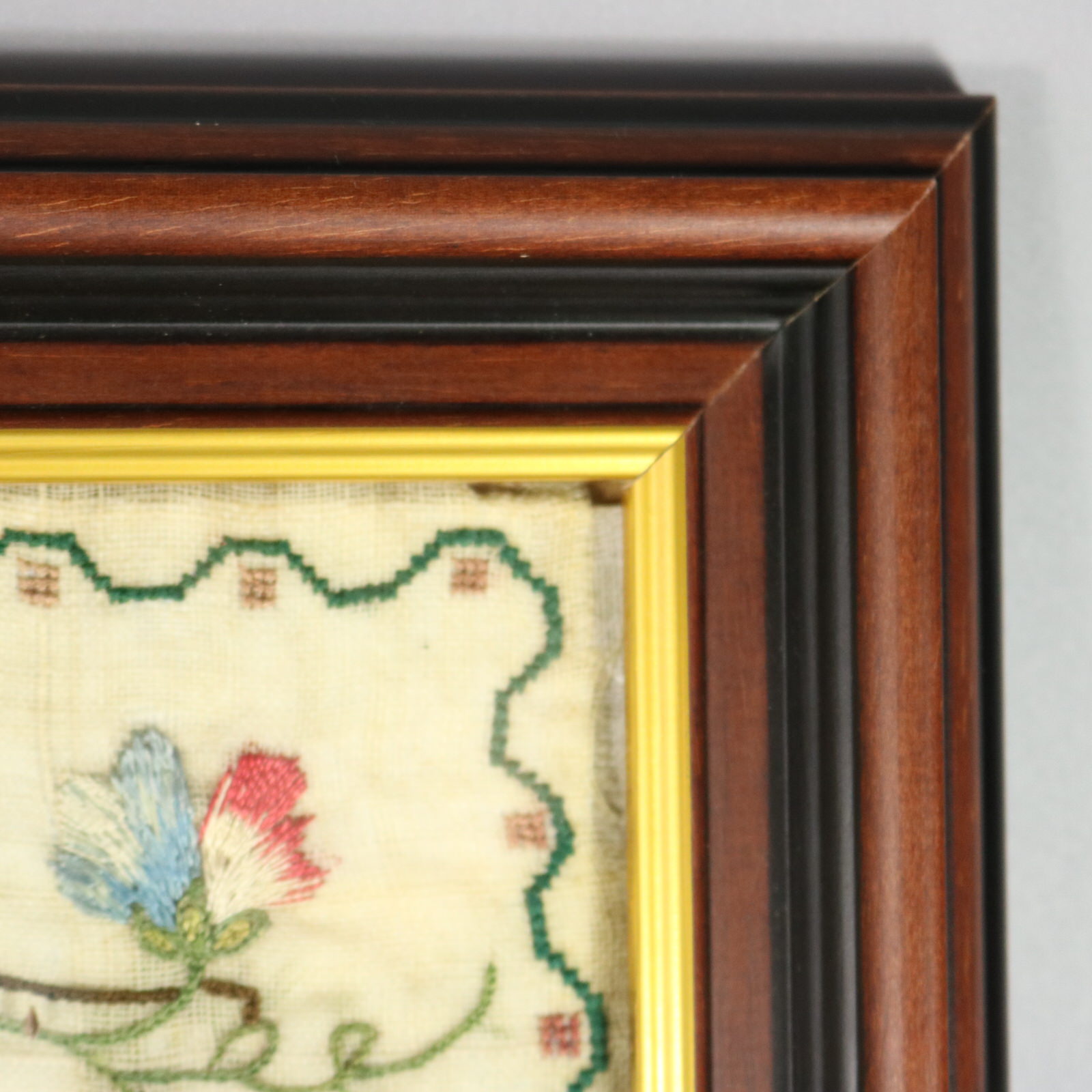 Mounting: The sampler is stitched to acid free card. Frame backed with chipboard and sealed with tape.