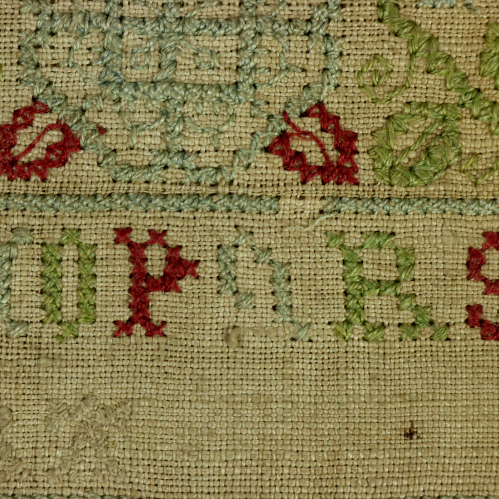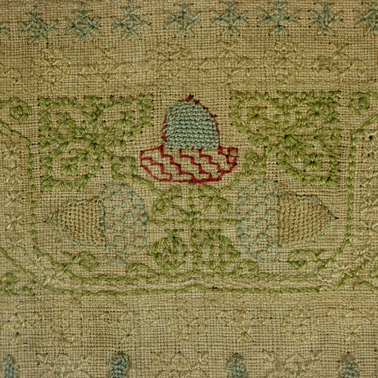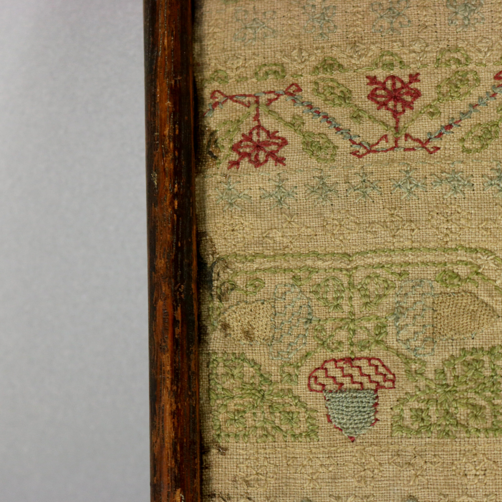 Features a wonderful variety of horizontal patterned bands across the sampler. Includes acorns, leaves, flowers.