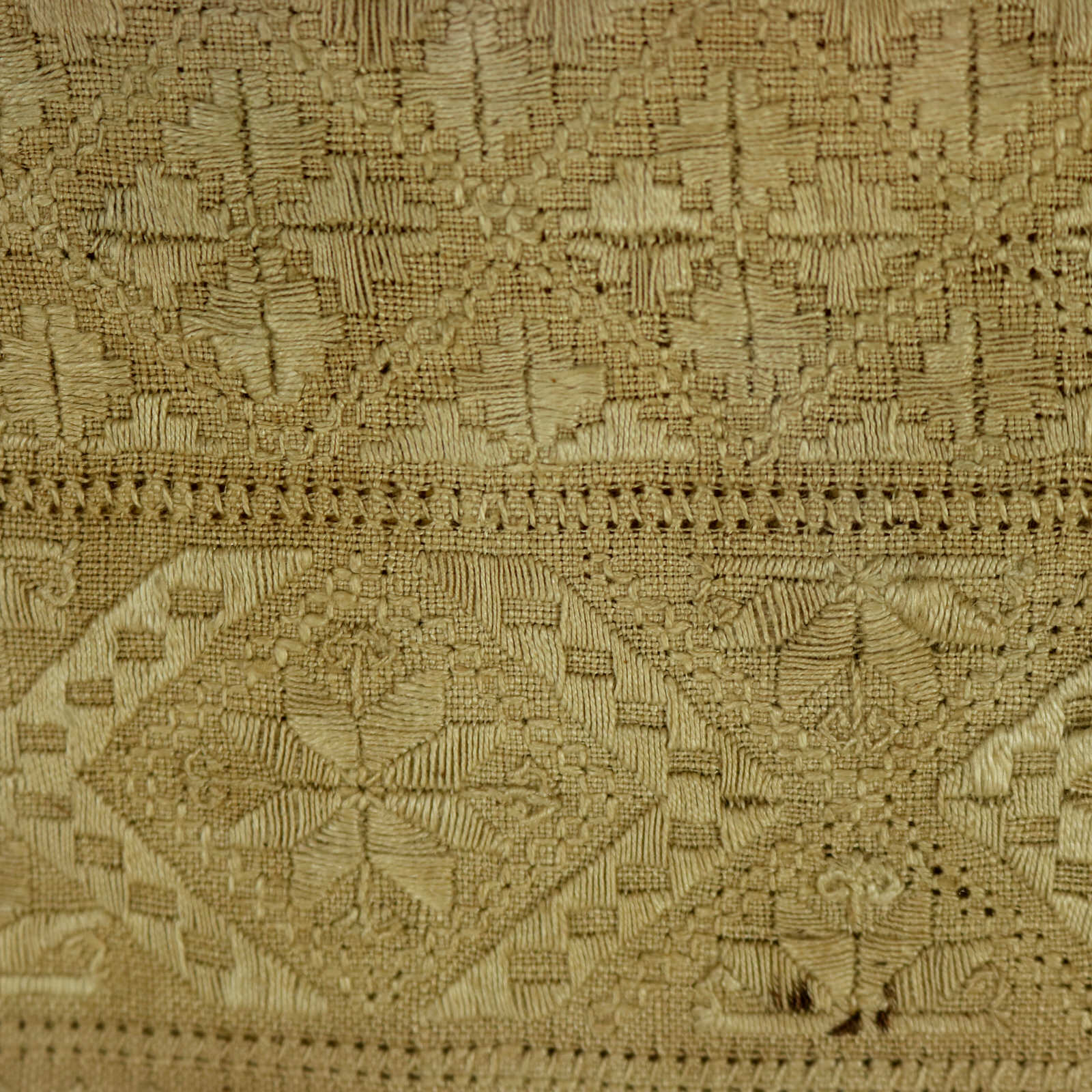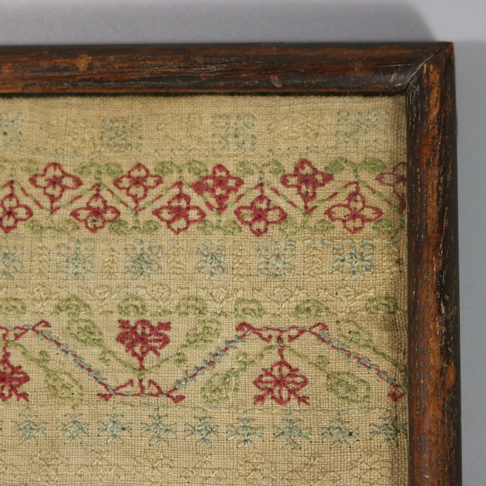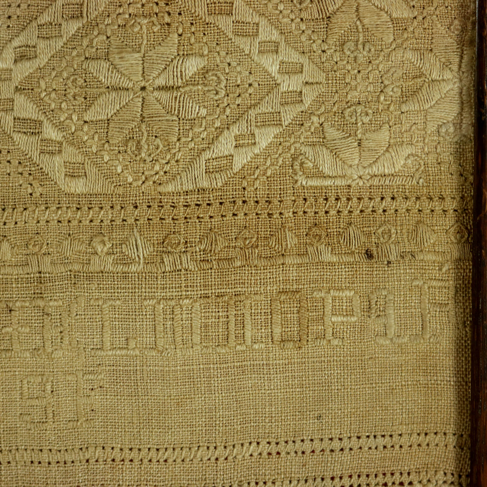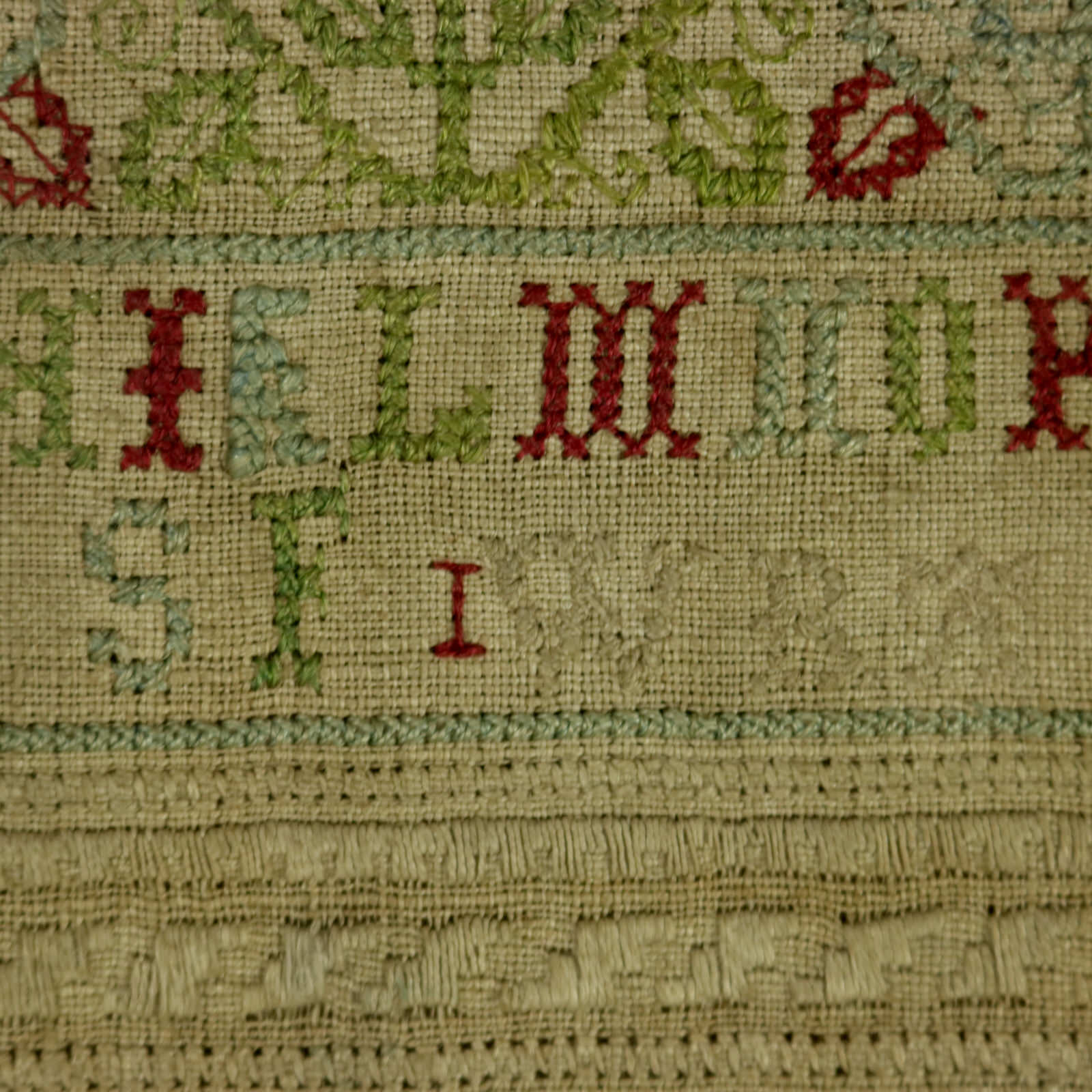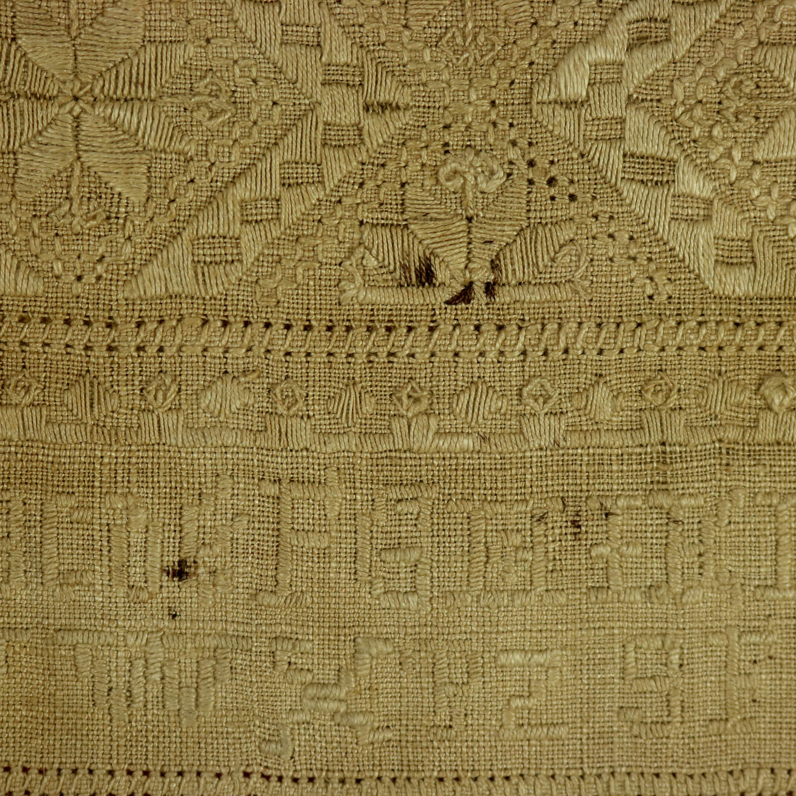 The sampler is worked in silk threads on a linen ground, in a variety of stitches.